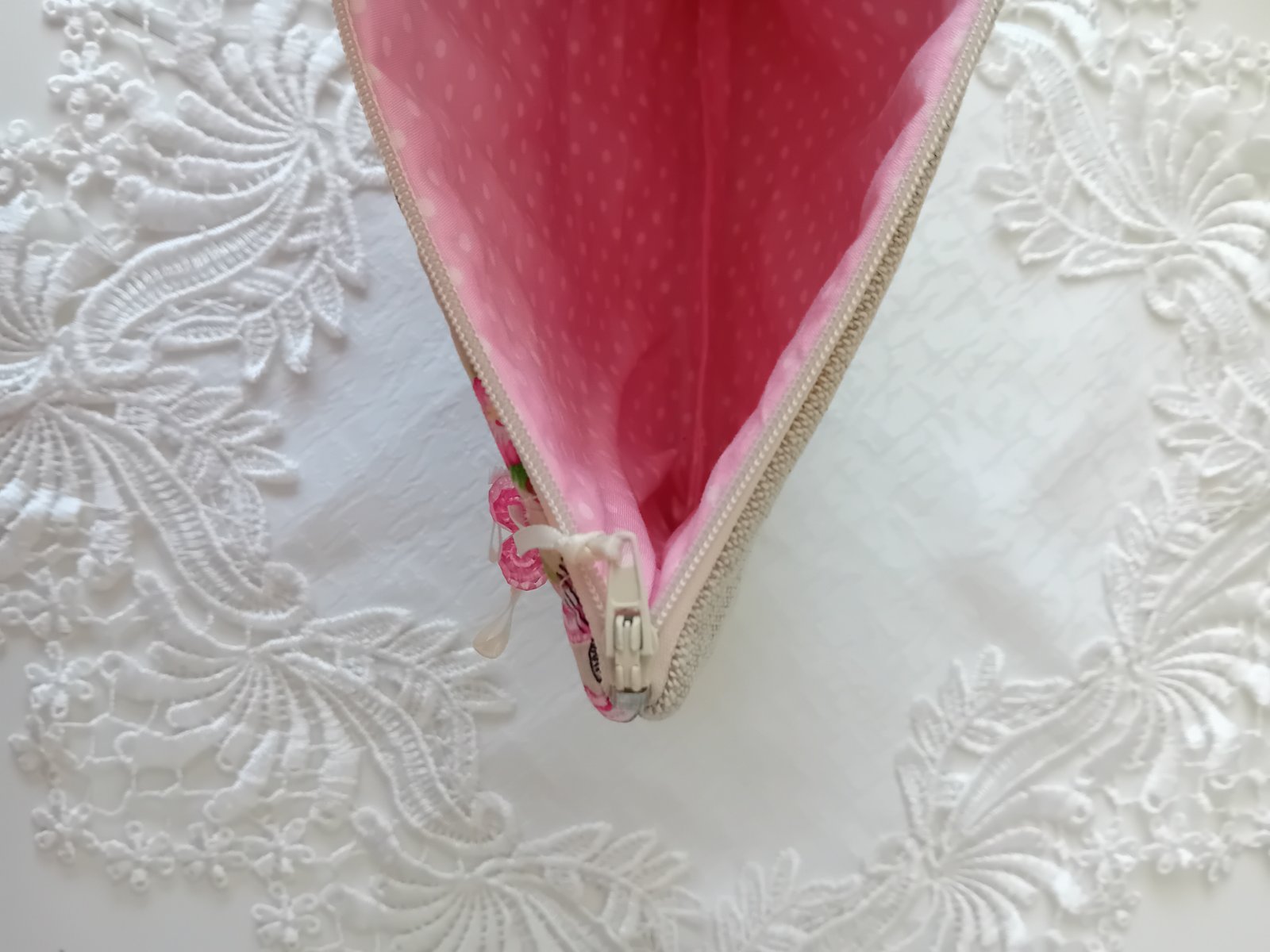 Ušitá je z pevnej ľanovej a bavlnenej látky o rozmeroch 13 cm x 20cm, podšitá bavlnenou látkou. Taštička je vystužená a zdobená sklenenými korálikmi.