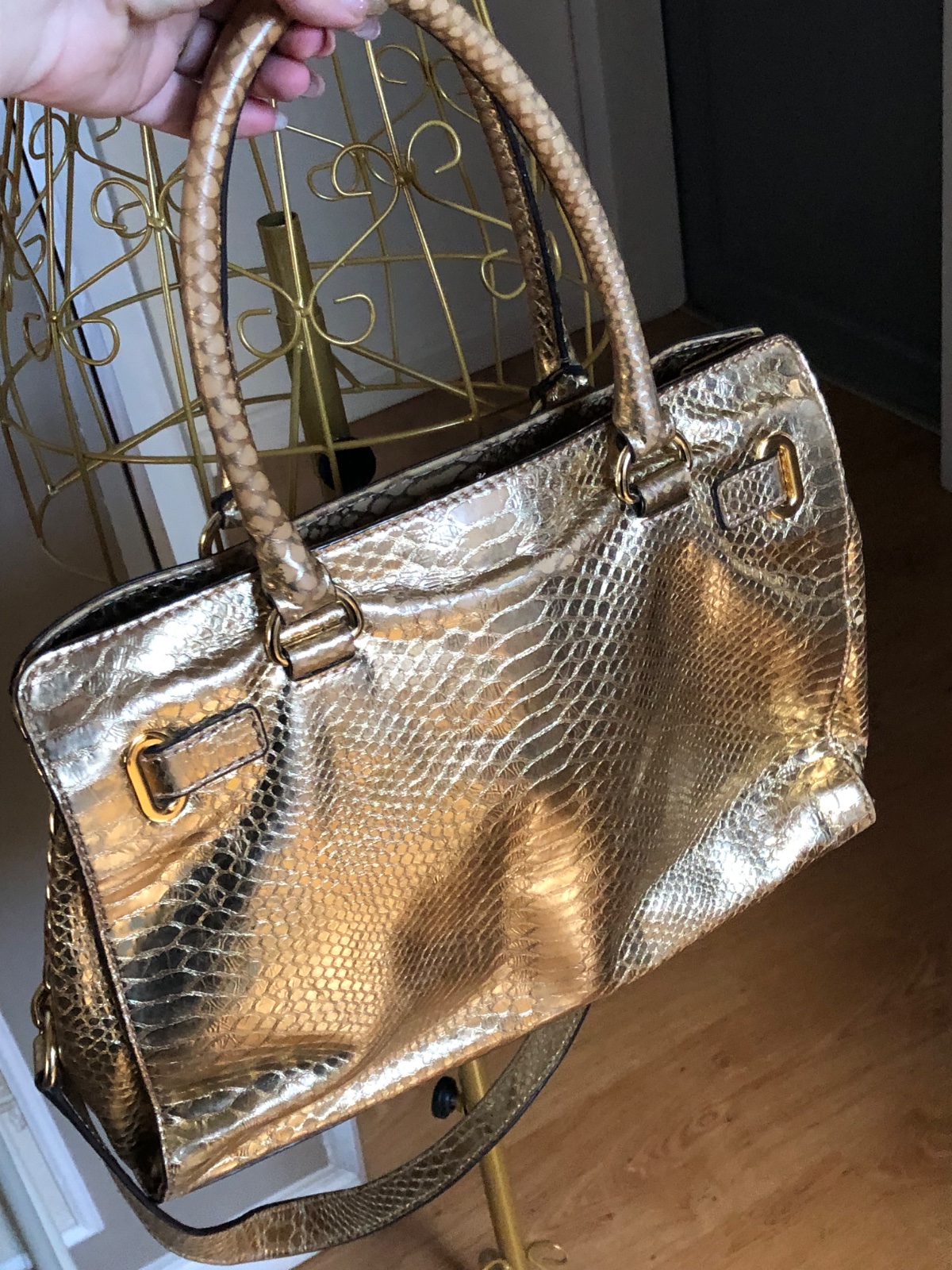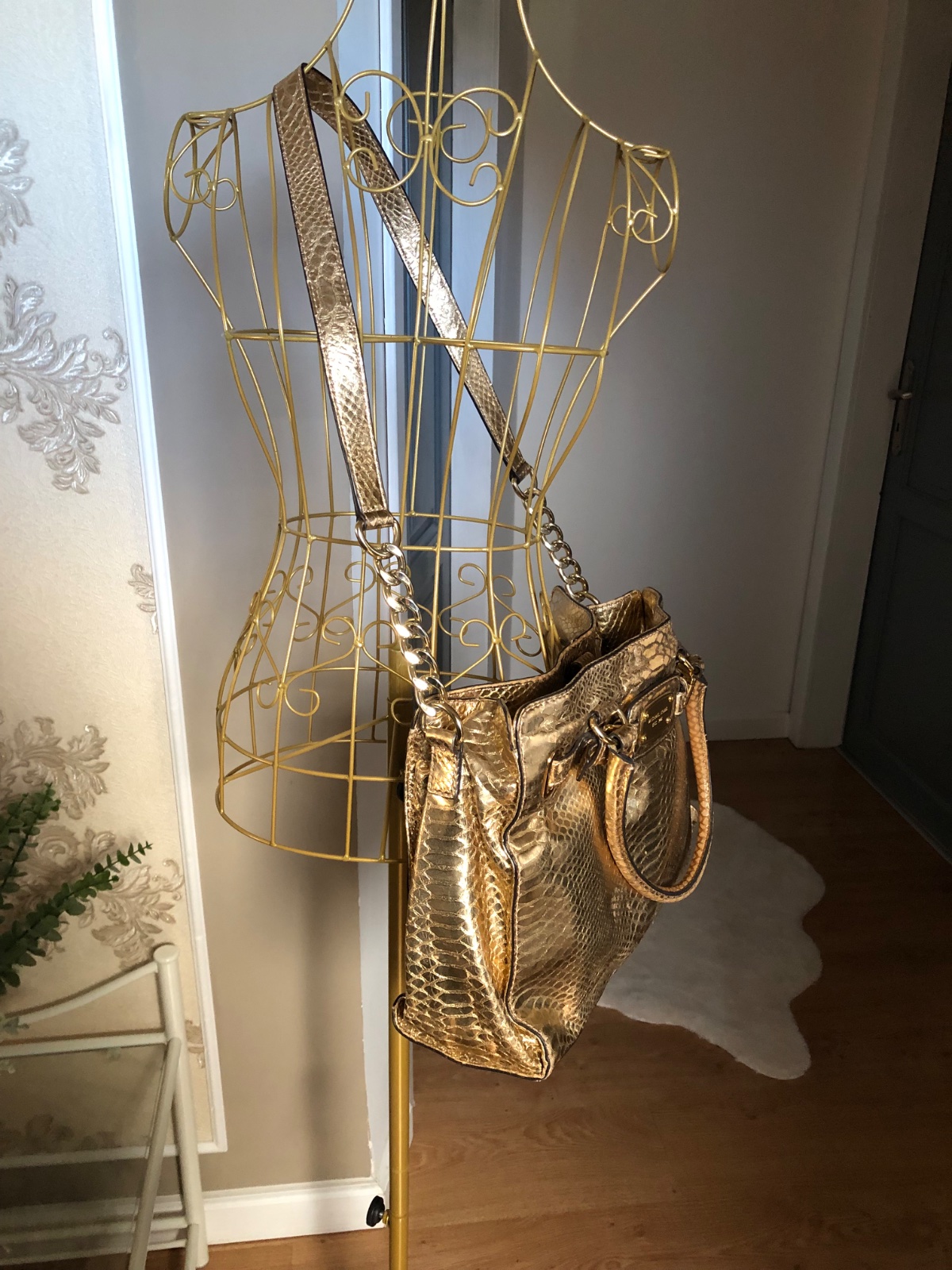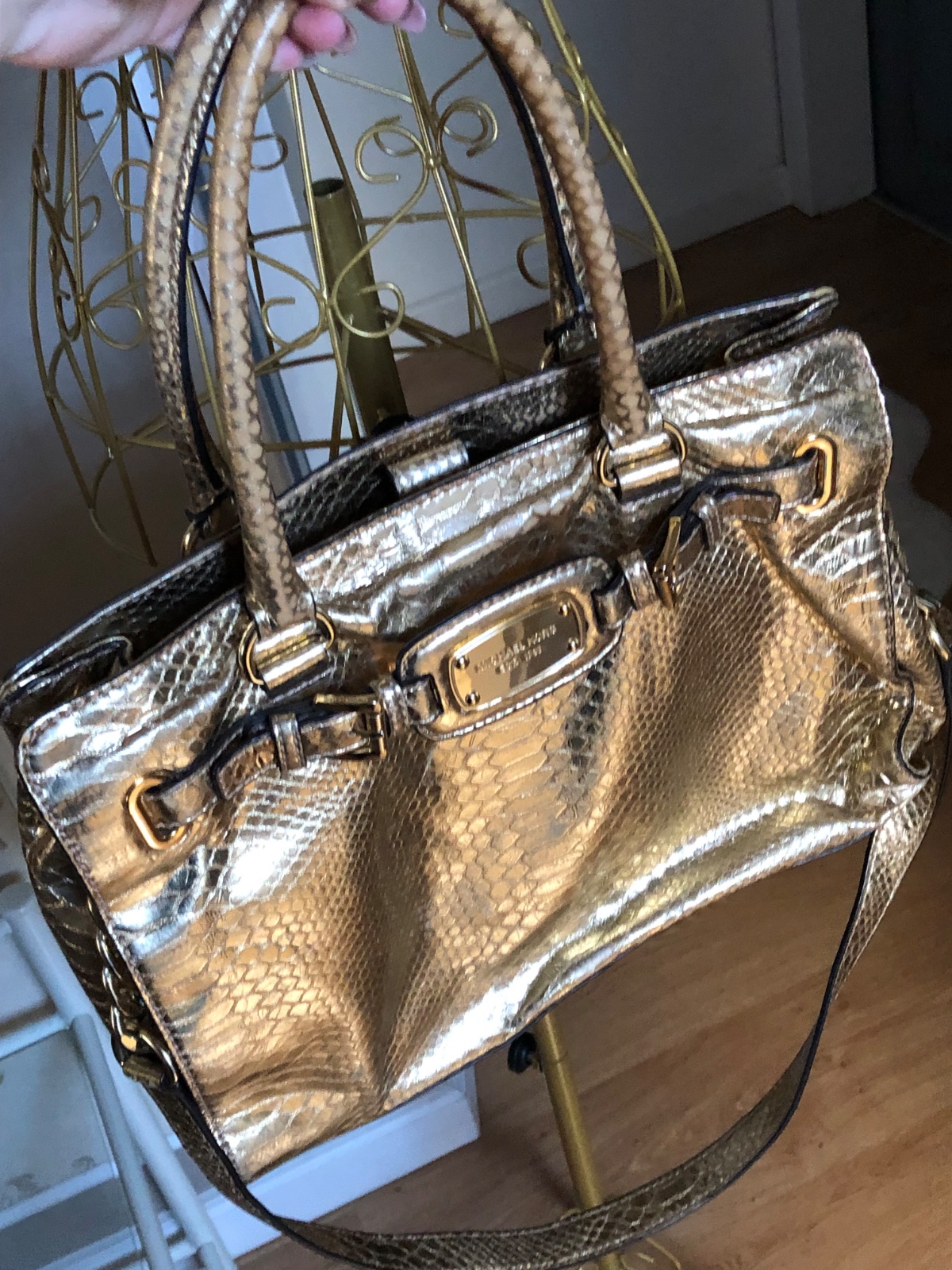 Táto taška Hamilton je od značky Michael Kors. Je vyrobená z metalickej kože s reliéfnym pytónom v zlatom odtieni a zdobená štítkom značky na prednej strane. Kabelka má dve rúčky, ramenný popruh a priestranné látkové vnútro, ideálna na každodenné nosenie…. V super stave…rozmery 28x36x10 cm