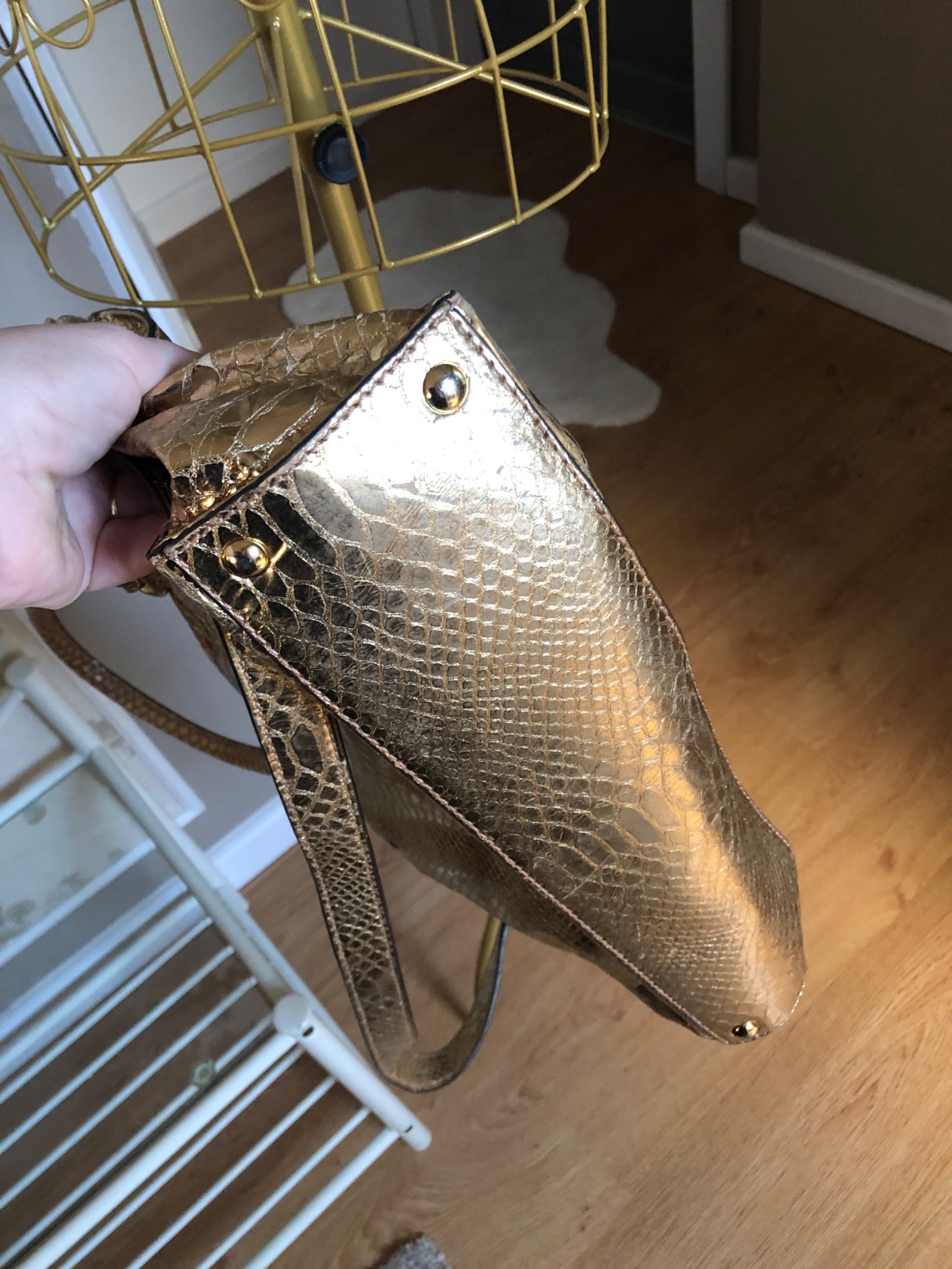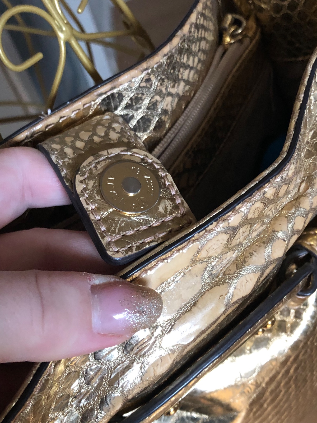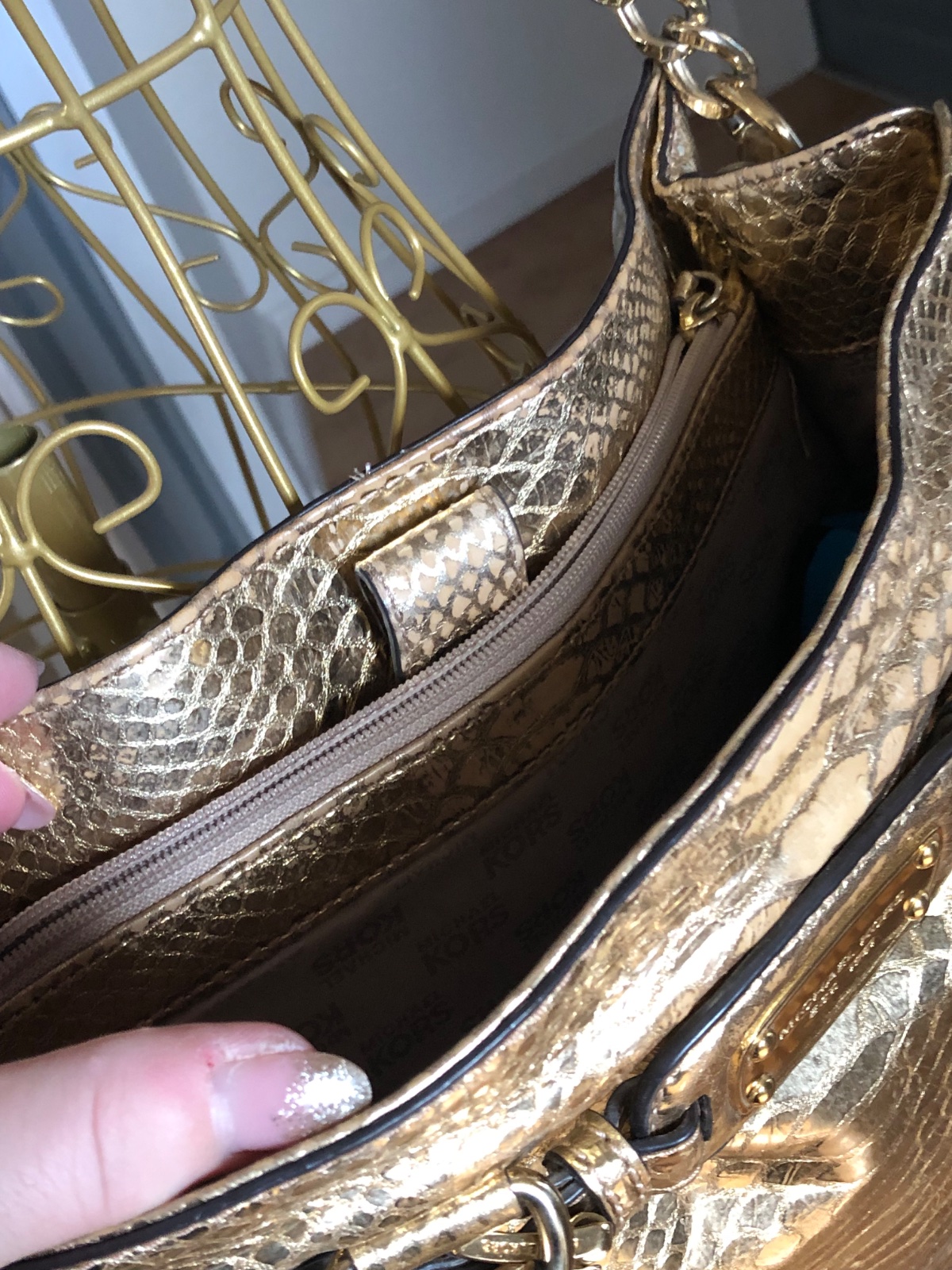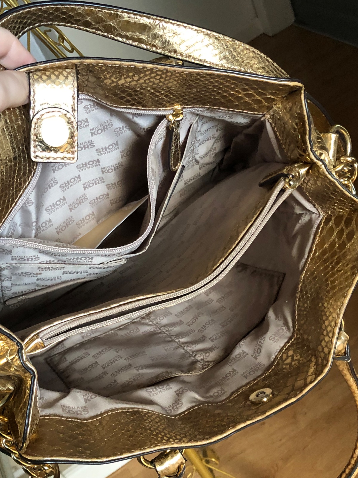Táto taška Hamilton je od značky Michael Kors. Je vyrobená z metalickej kože s reliéfnym pytónom v zlatom odtieni a zdobená štítkom značky na prednej strane. Kabelka má dve rúčky, ramenný popruh a priestranné látkové vnútro, ideálna na každodenné nosenie…. V super stave…rozmery 28x36x10 cm