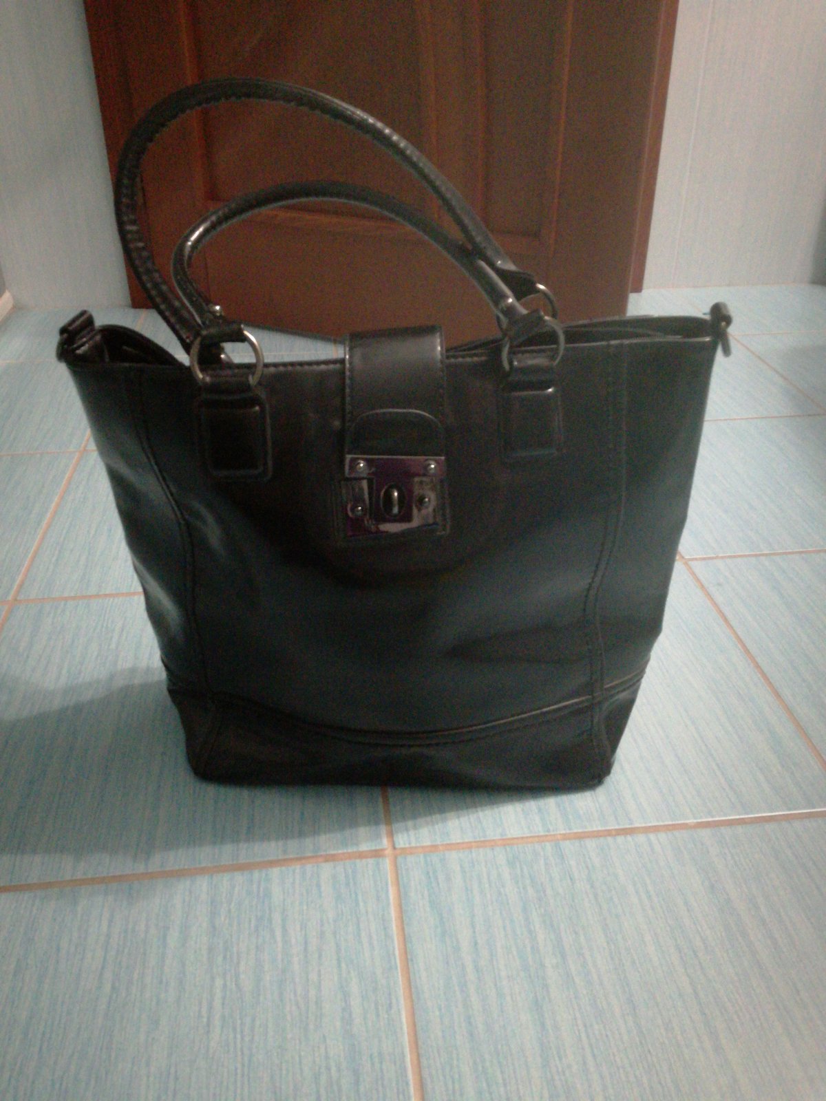 Cierna kabelka z lesklej kozenky, vacsia. Zapinanie na zips a vpredu je na zamok otocny.
