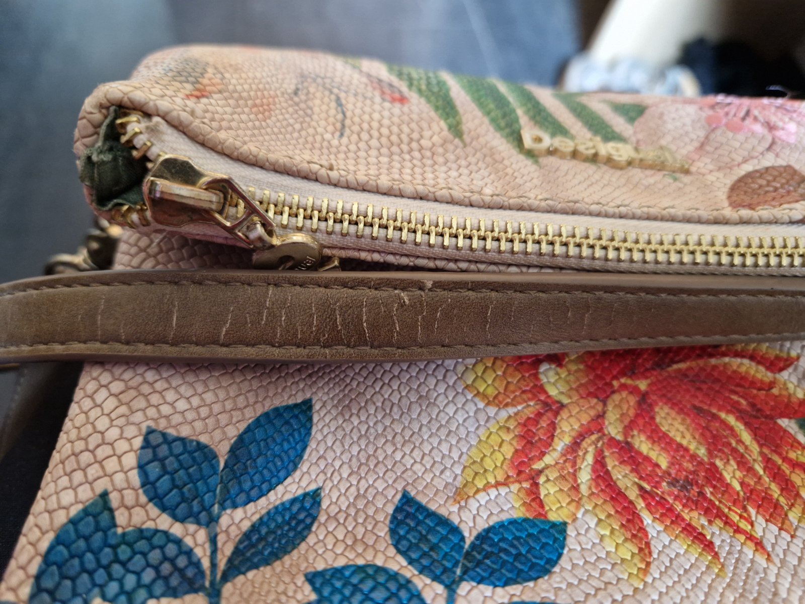 Elegantná malá kabelka, pekná farebná kombinácia. Regul.ramienko. Má zopár poškodení, ale ešte určite dobre poslúži. Ošúchania materiálu sa stratia v tom haďom vzore,vidieť iba zblízka. Vady nafotené. Na Ramienko praská, ale kabelka sa dá nosiť aj v ruke, ramienko sa dá odcvaknúť. Rozmery 21,5x 14,5