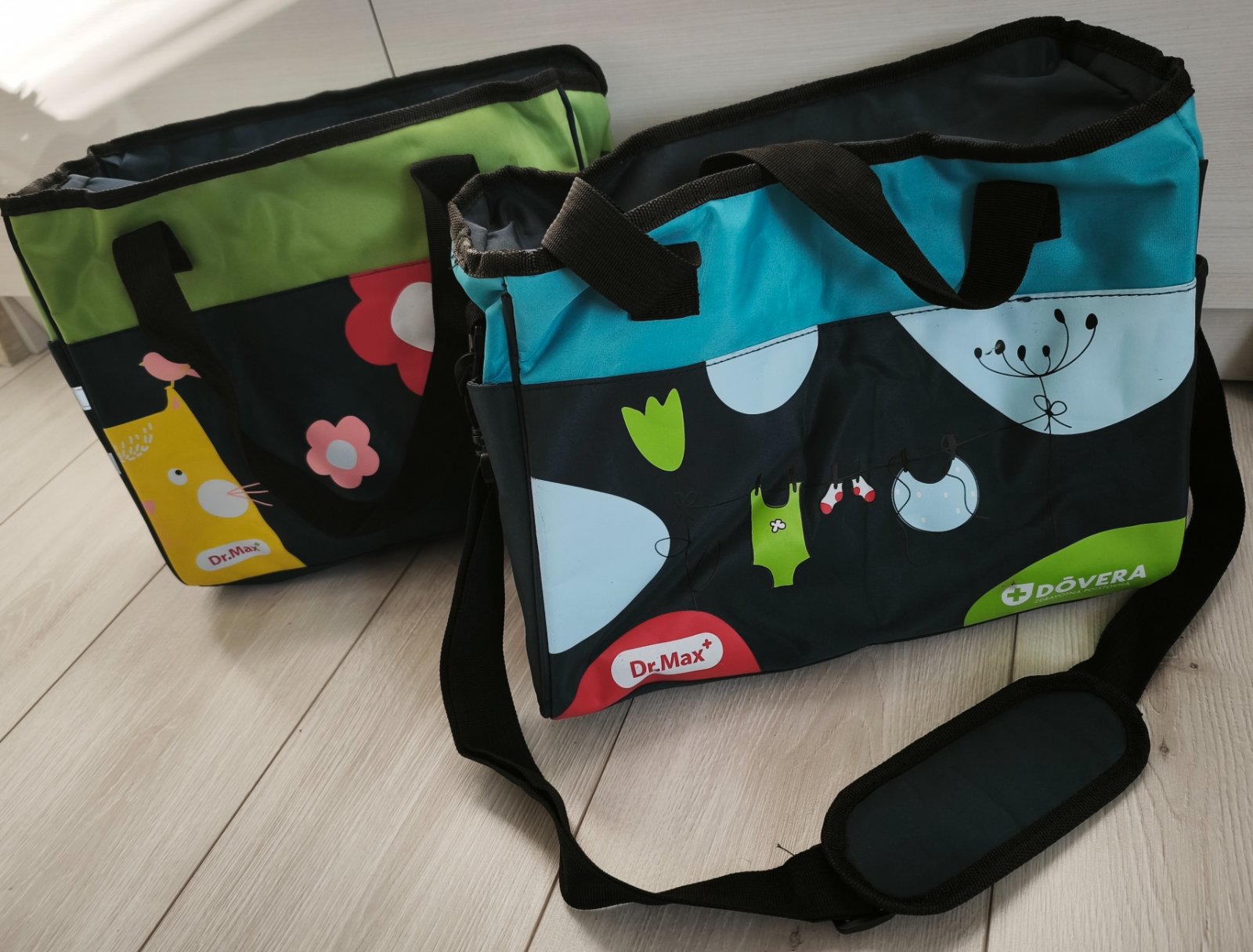 Darujem za poštovné dve úplne nové tašky/kabelky cez plece alebo na kočiar. Dostali sme ich ako darček k narodeniu dieťatka od poisťovne. Sú úplne nové, jednu som použila asi dvakrát .... Plne funkčné zipsy, sú k nim aj popruhy na suchý zips, ktoré sa zapínajú na kočiar. Vo vnútri majú priehradky ... v prípade záujmu odmerám ...