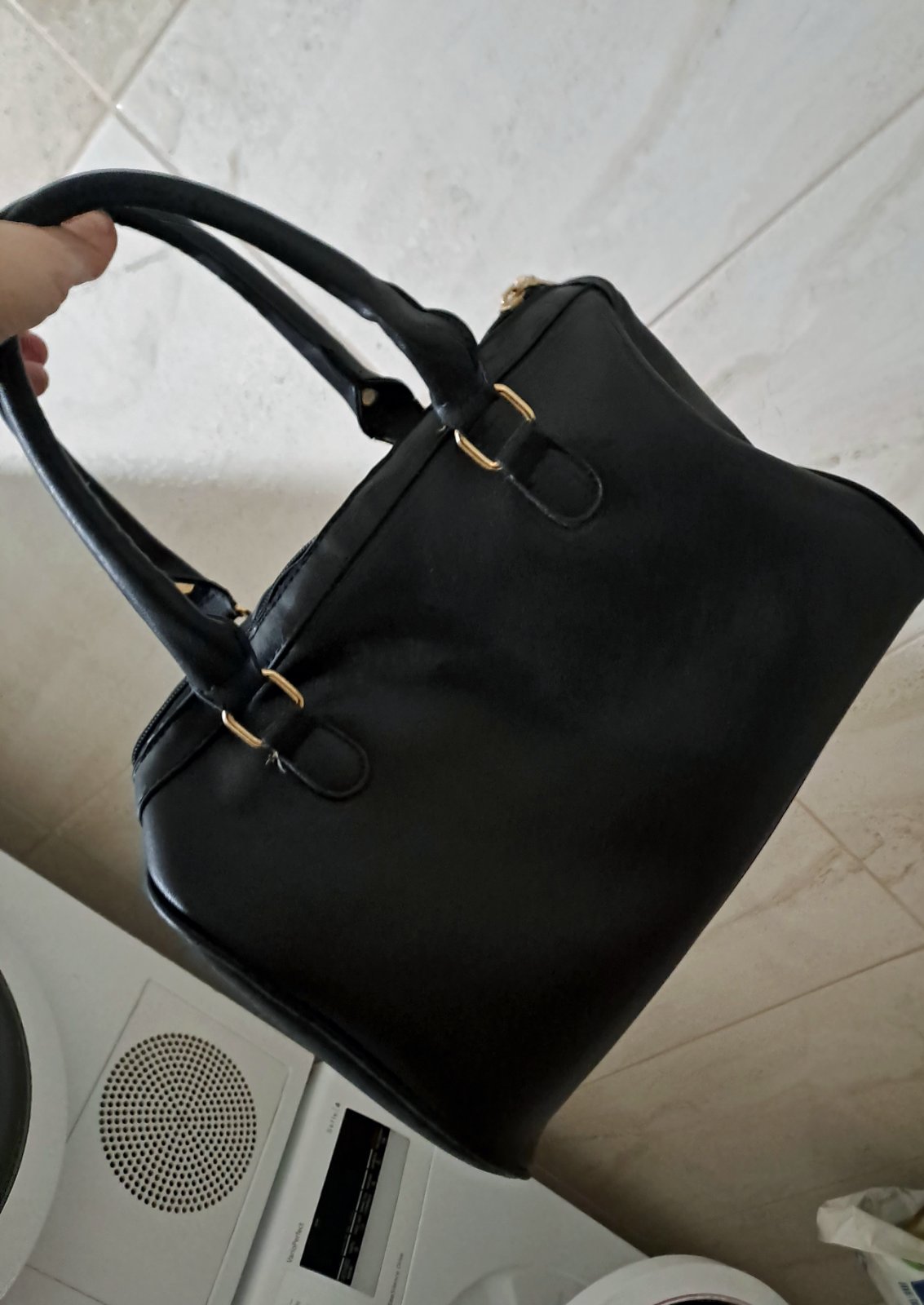 farba: jedna strana biela, druhá čierna so strieborným kovaním odopínateľný dĺžkovo nastaviteľný dlhý popruh + uško do ruky veľmi štýlový kúsok priemer kruhu 20 cm, hrúbka 9 cm materiál: neprav...
