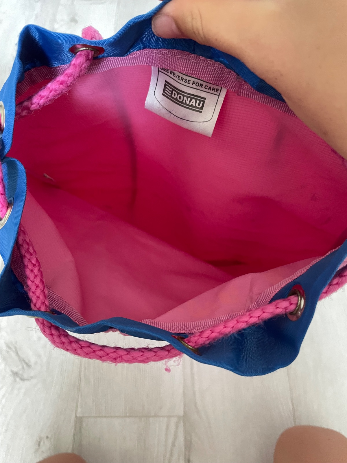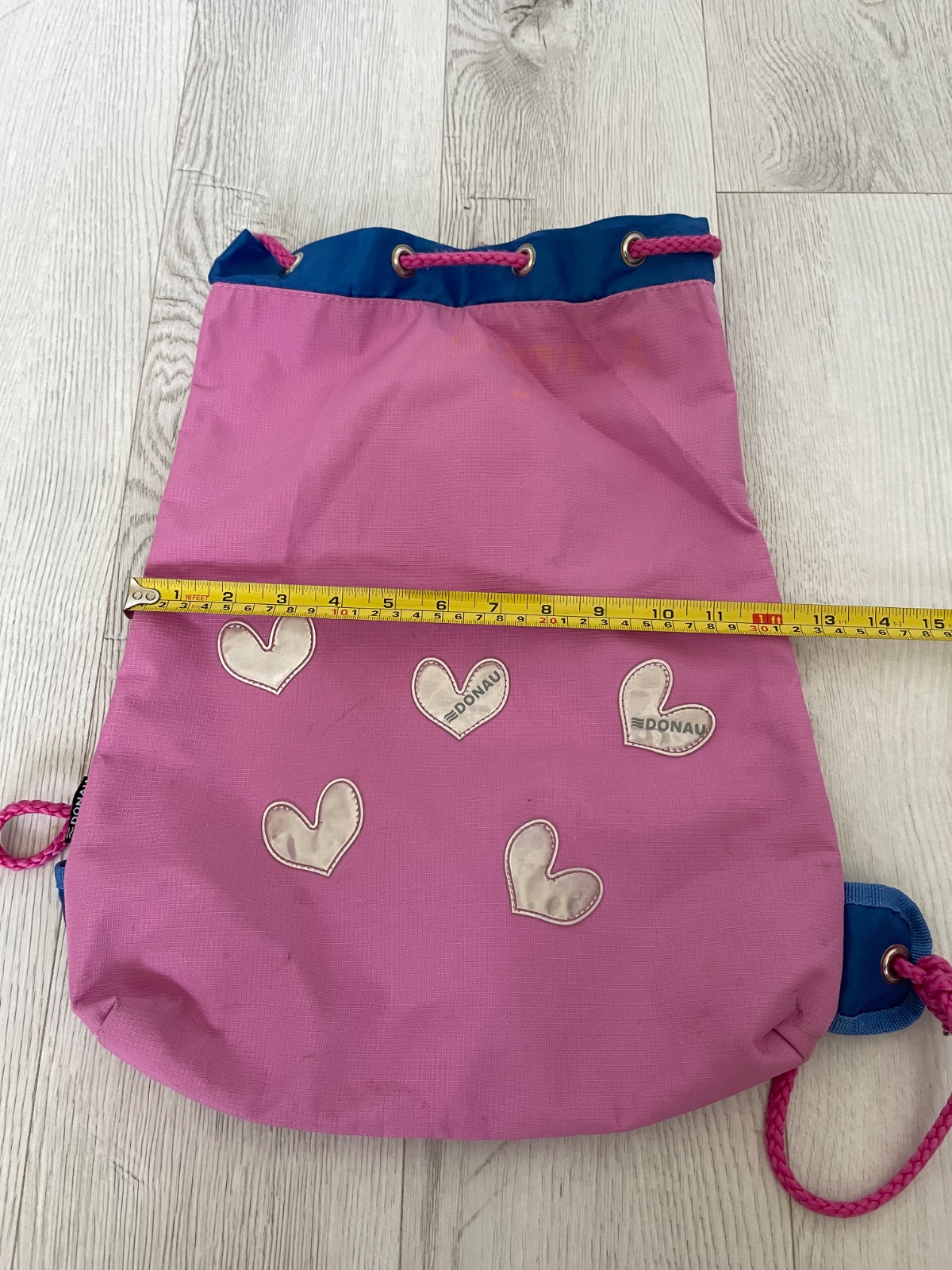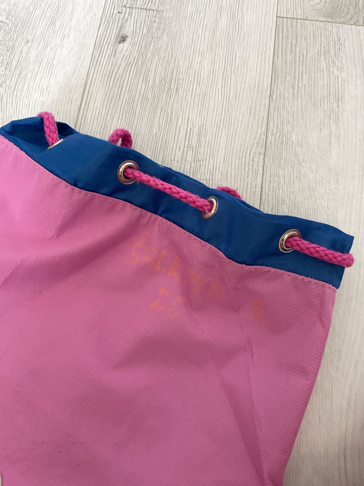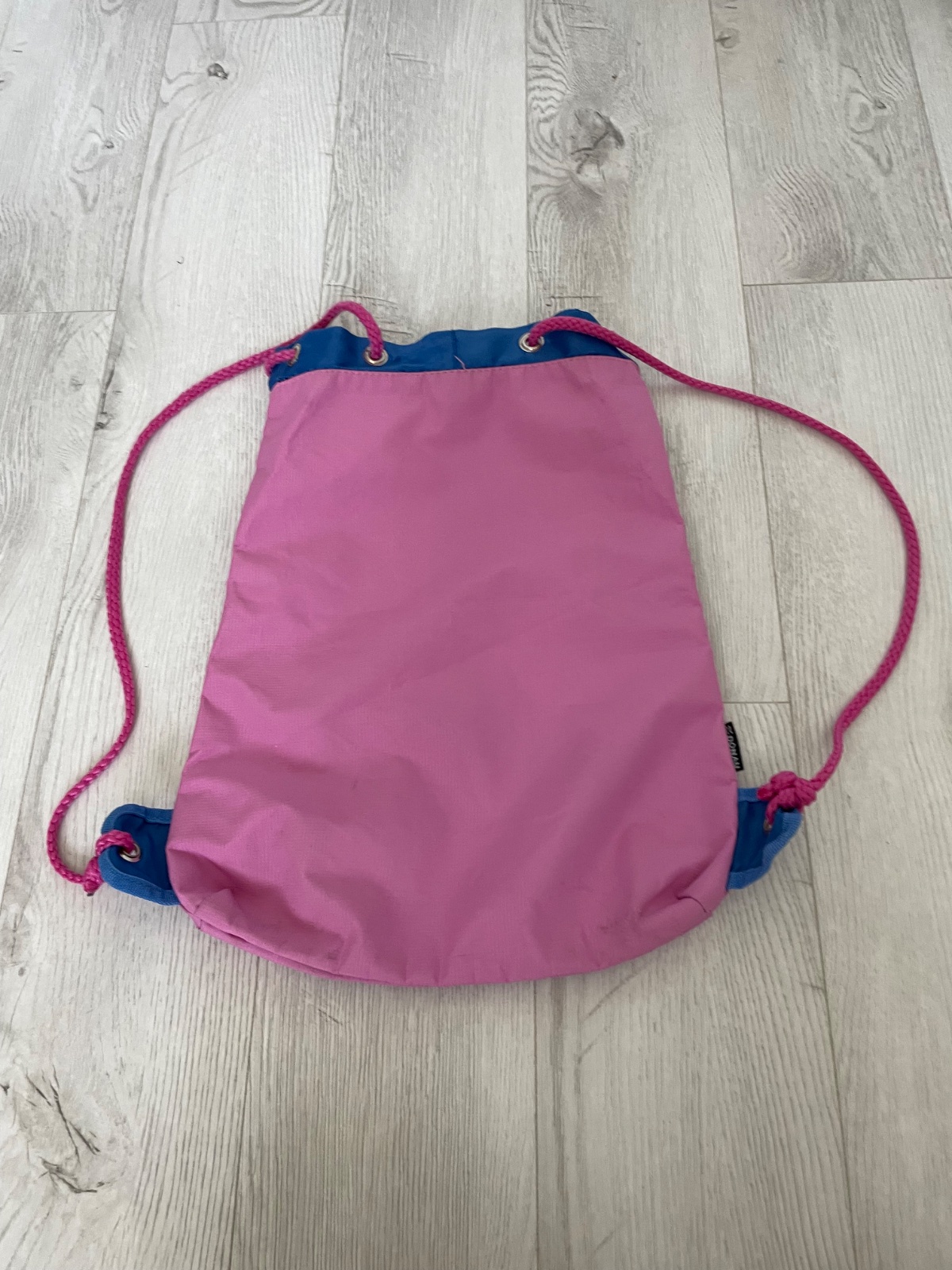 Vak na plecia na stiahnutie, alebo taška na hračky. Hore v rohu je na nej slabo viditeľné meno.