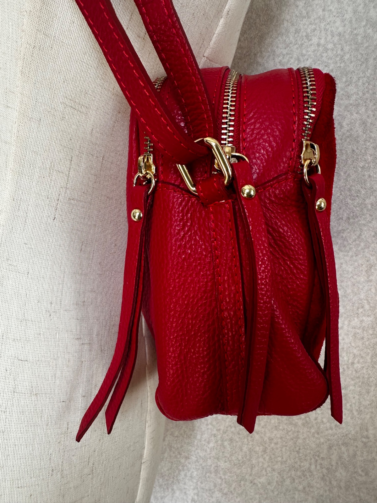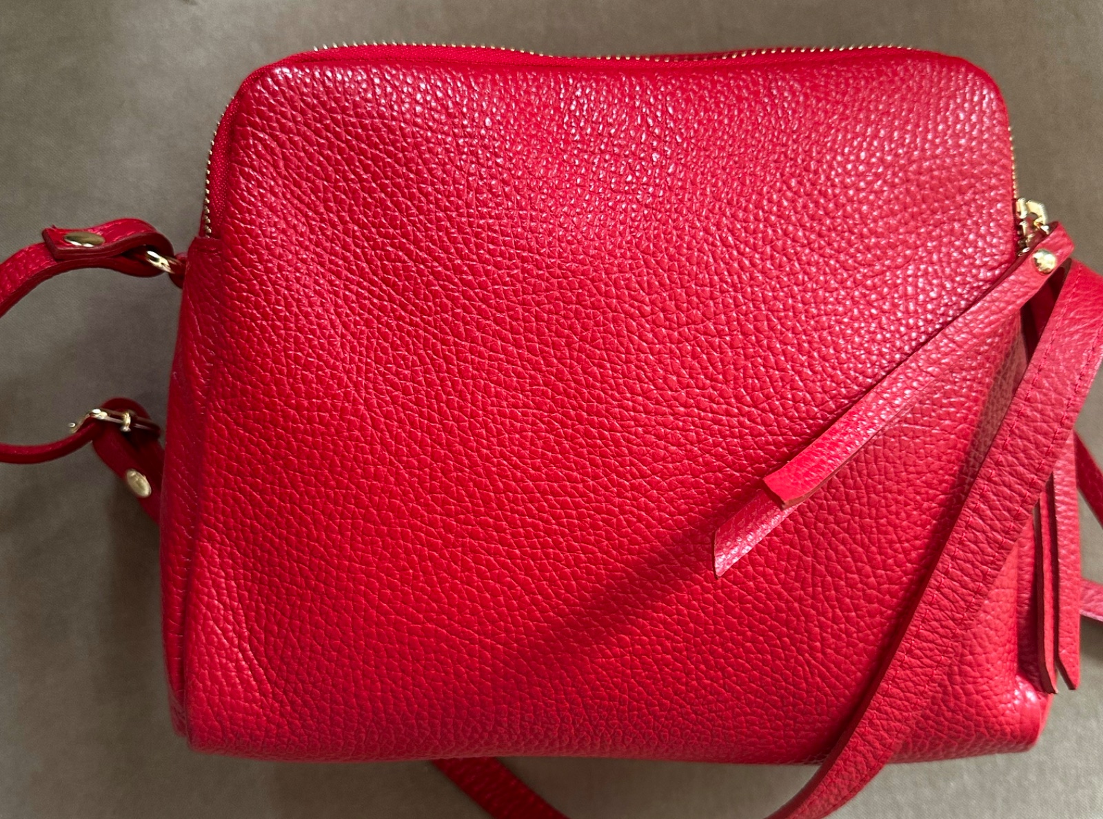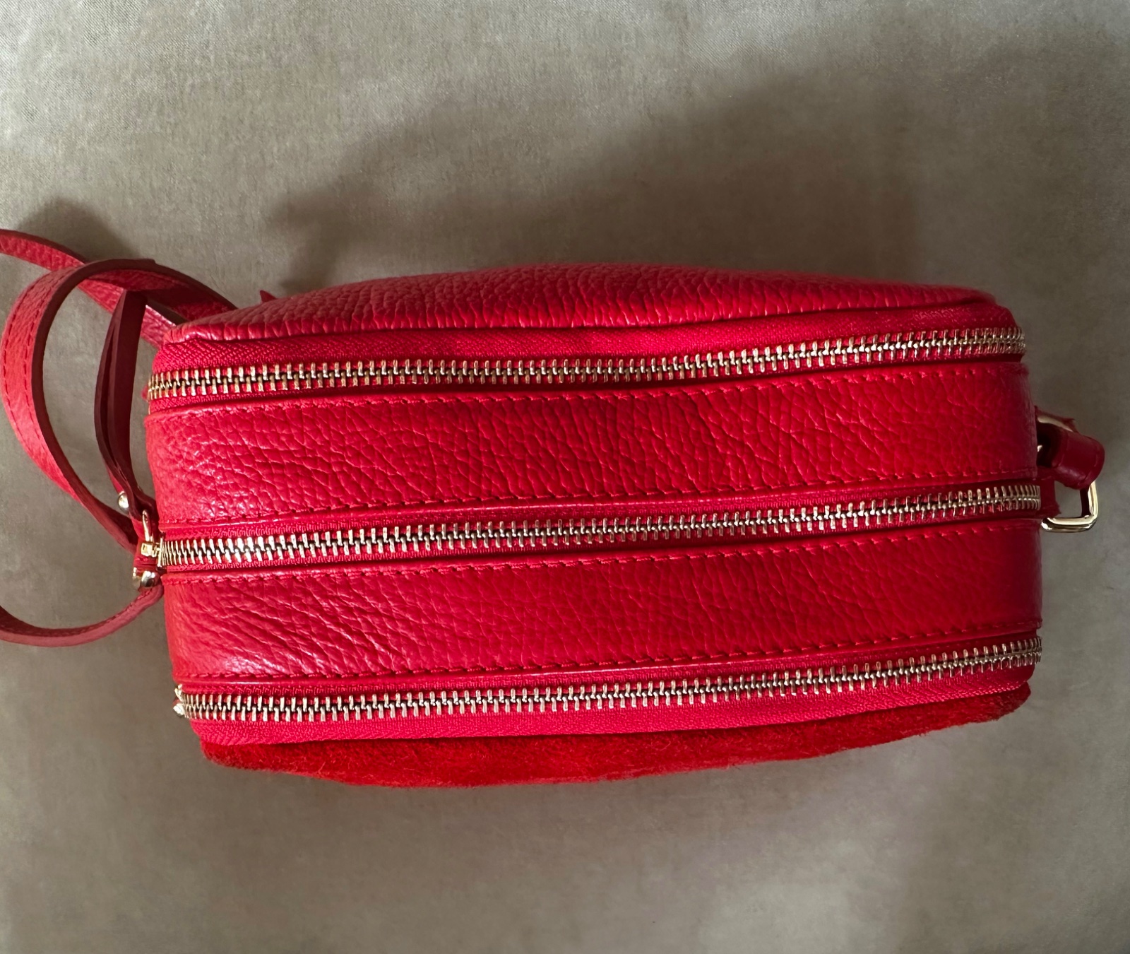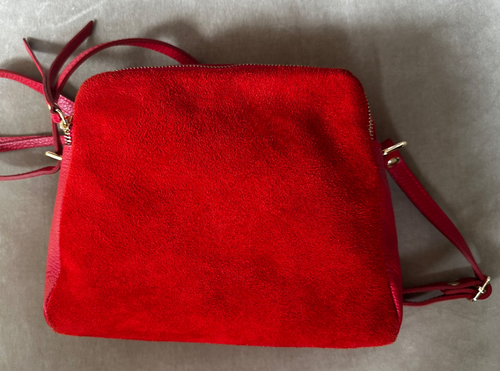 Kvalitná, praktická a nadčasová z hebkej poddajnej kože, s nastaviteľným remienkom. Predný diel je z brúsenej semišovej kože, zvyšok je z hladkej štruktúrovanej kože. Krásna sýta červená farba. Taška má 3 priečinky so zapínaním na zips. Stredný je najpriestrannejší - má vo vnútri ploché kožené otvorené a ešte jedno vrecko so zipsom. Vo veľmi peknom stave, bez poškodení.