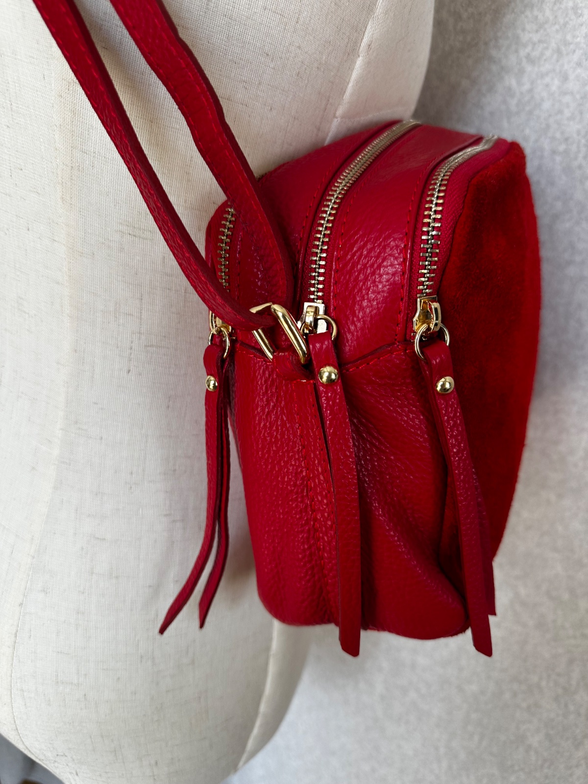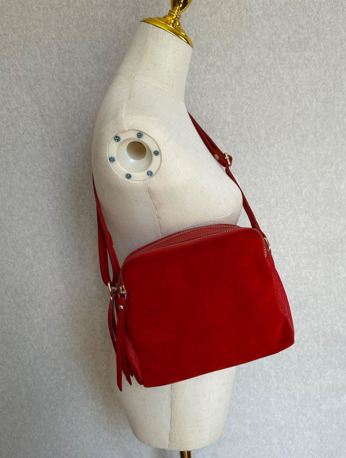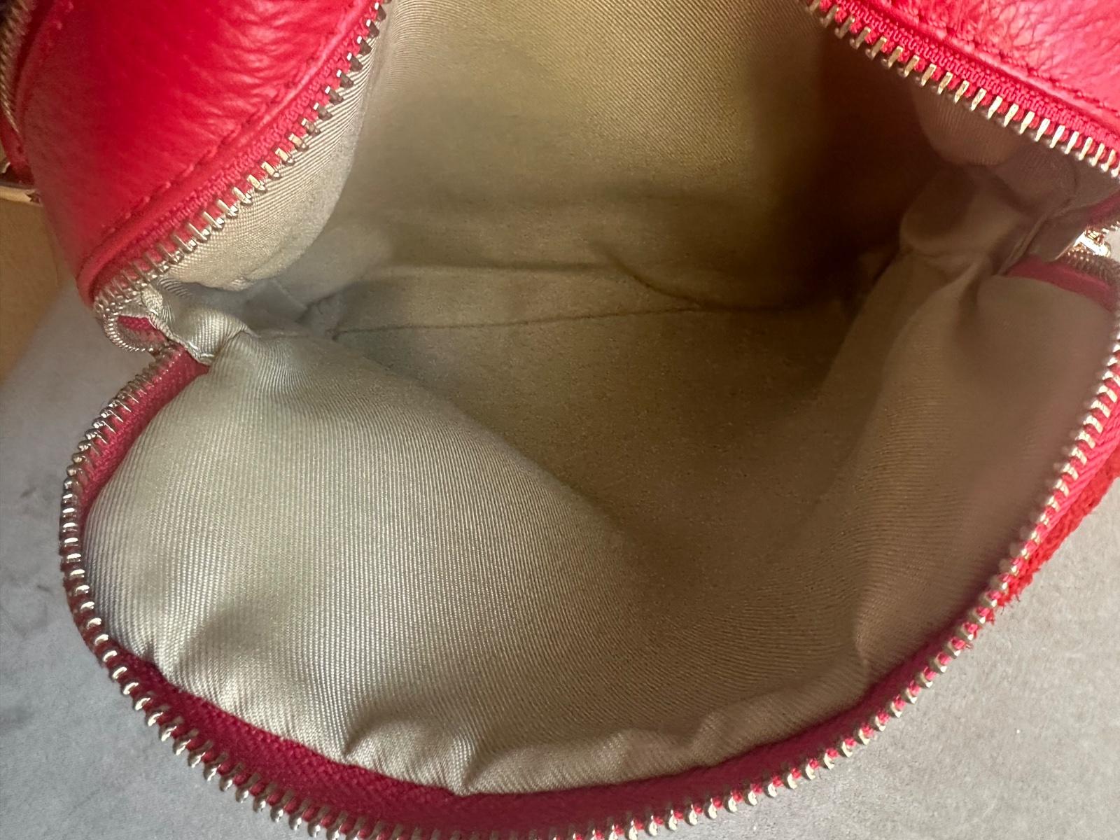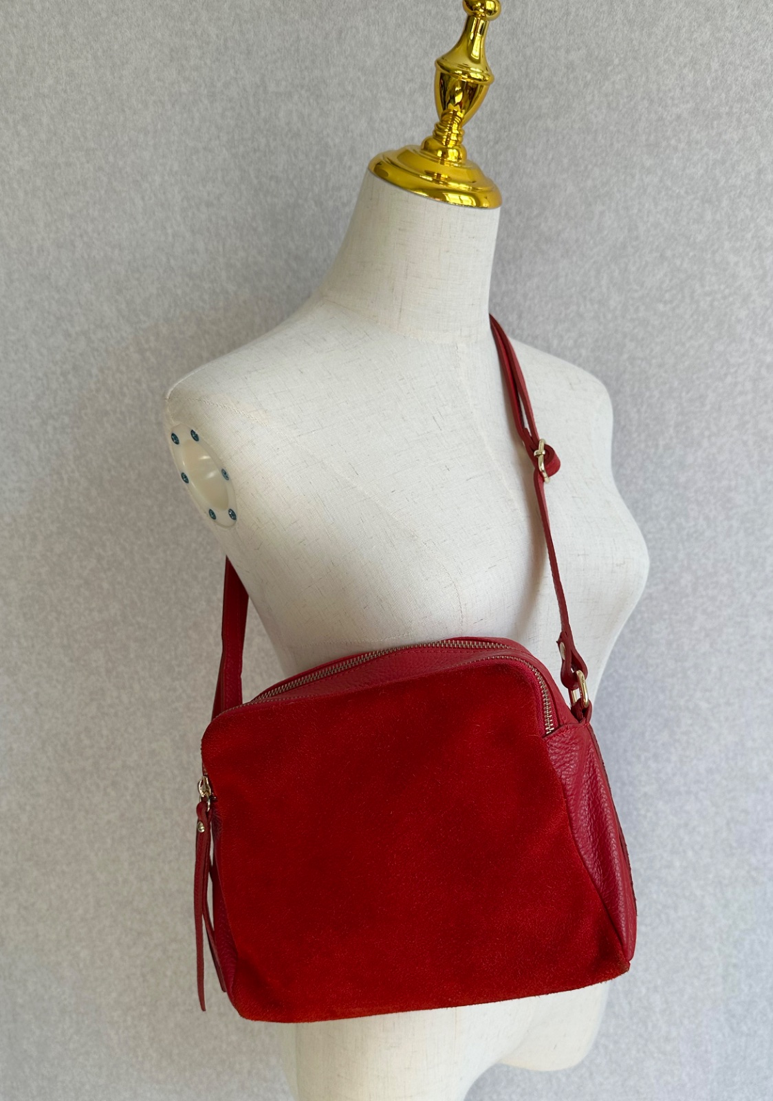 Kvalitná, praktická a nadčasová z hebkej poddajnej kože, s nastaviteľným remienkom. Predný diel je z brúsenej semišovej kože, zvyšok je z hladkej štruktúrovanej kože. Krásna sýta červená farba. Taška má 3 priečinky so zapínaním na zips. Stredný je najpriestrannejší - má vo vnútri ploché kožené otvorené a ešte jedno vrecko so zipsom. Vo veľmi peknom stave, bez poškodení.