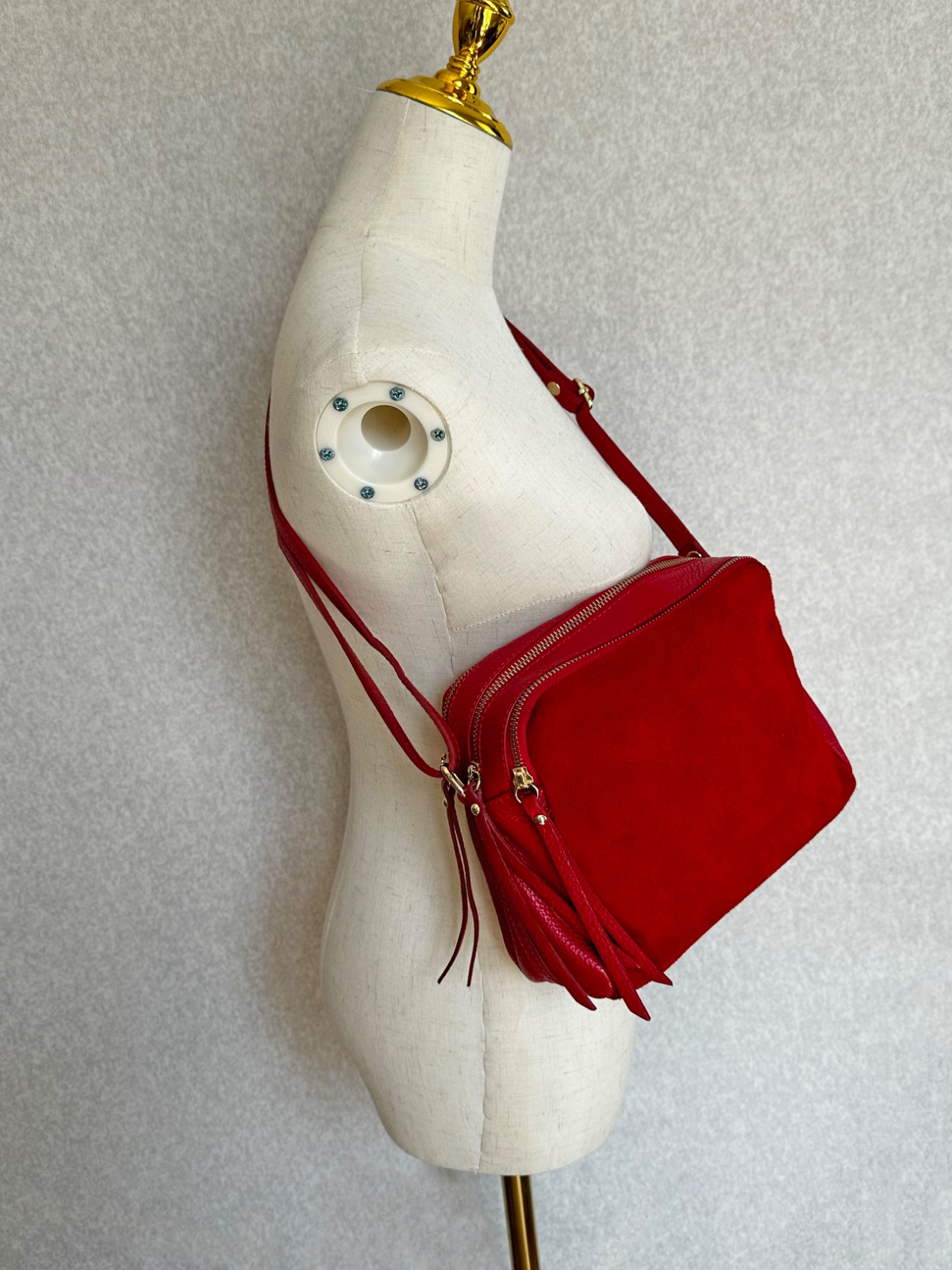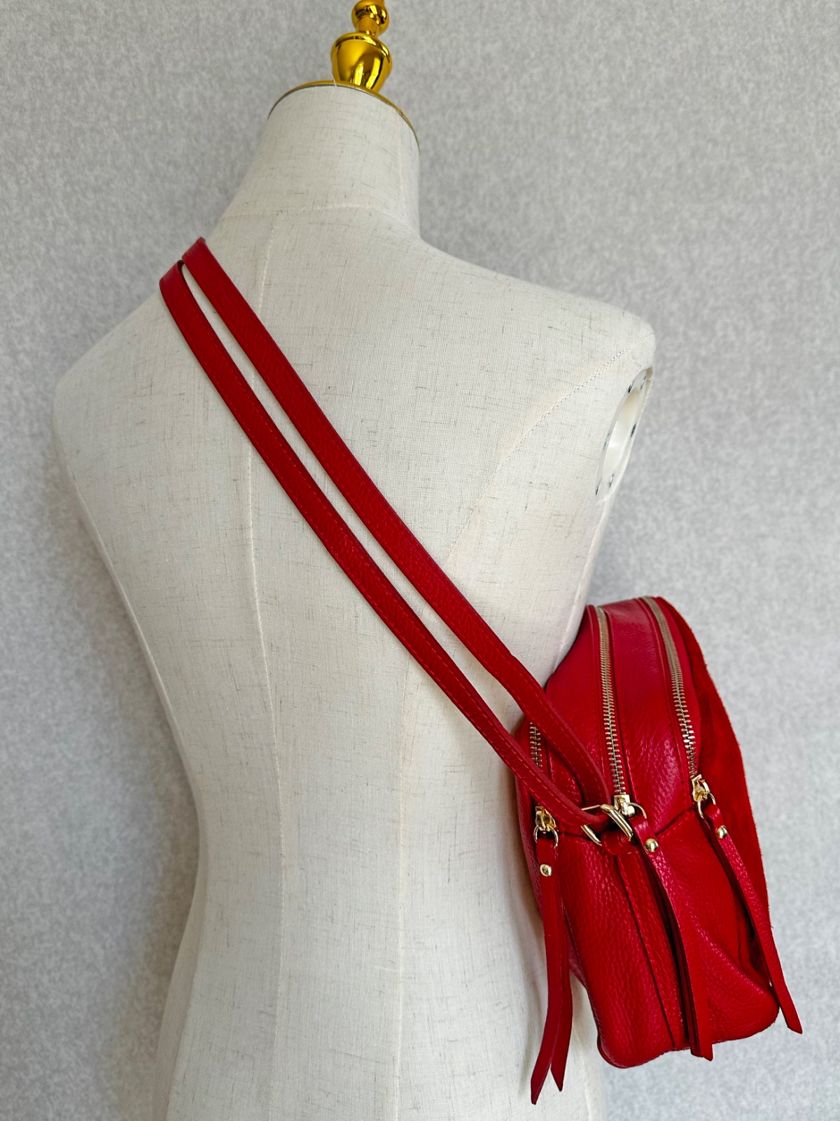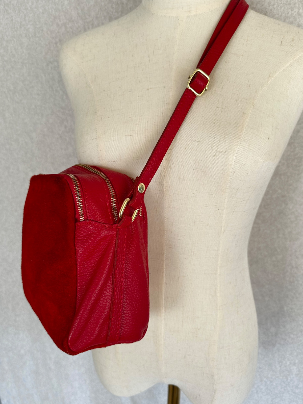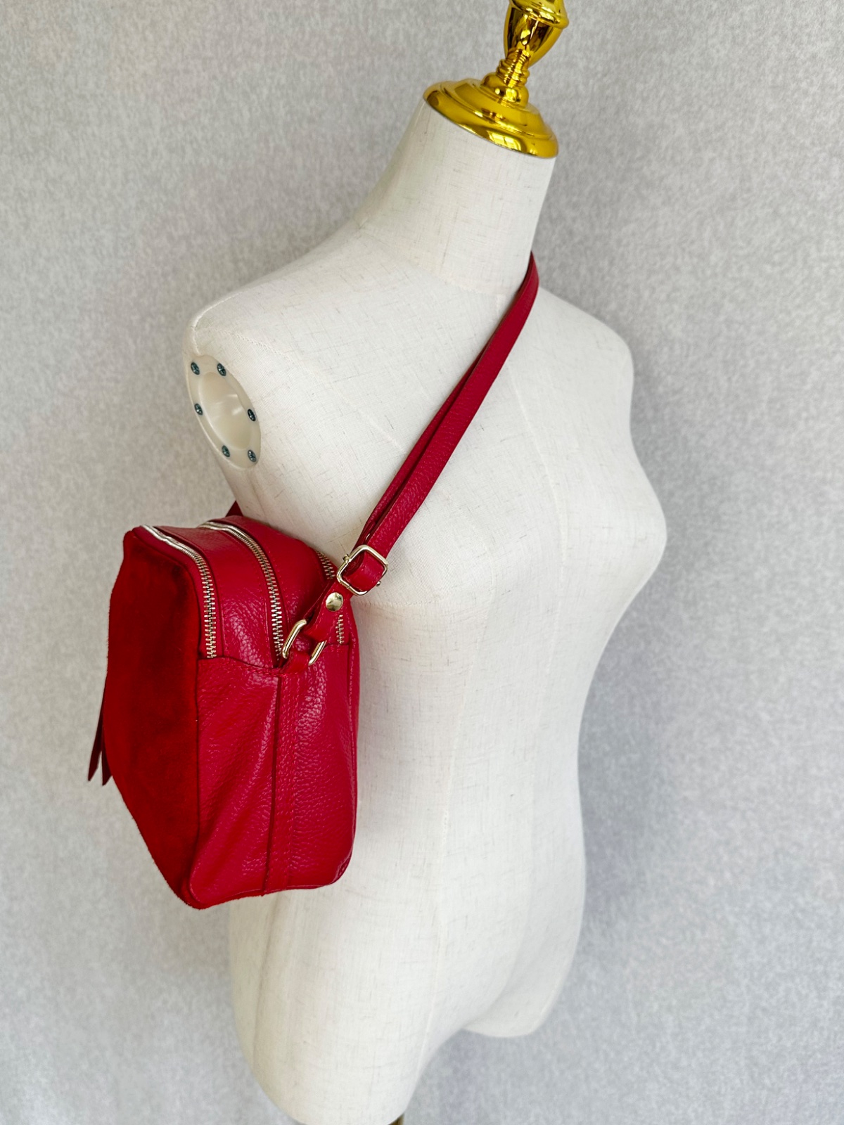 Kvalitná, praktická a nadčasová z hebkej poddajnej kože, s nastaviteľným remienkom. Predný diel je z brúsenej semišovej kože, zvyšok je z hladkej štruktúrovanej kože. Krásna sýta červená farba. Taška má 3 priečinky so zapínaním na zips. Stredný je najpriestrannejší - má vo vnútri ploché kožené otvorené a ešte jedno vrecko so zipsom. Vo veľmi peknom stave, bez poškodení.