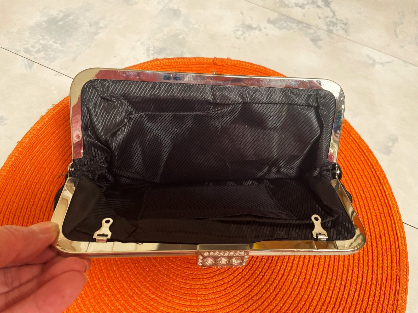 nádherná saténová listová kabelka,veľmi zaujímavo šitá,raz použitá - ako nová,s kovovým rámom a krásnym trblietavým zdobením na zapínaní,na prednej časti sú ligotavé kamienky - očká,na zadnej bez kamienkov,top kúsok, 13 x 23 cm