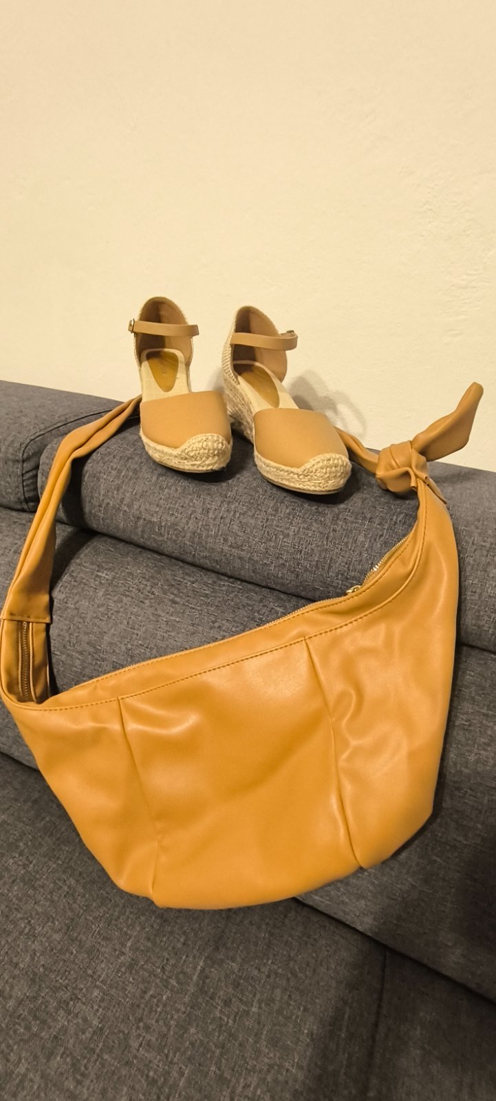 Raz využitá kabelka, mám k nej aj sandále. Dĺžka s uchom 60cm, šírka pri zipse cca 50cm, výška 23cm.