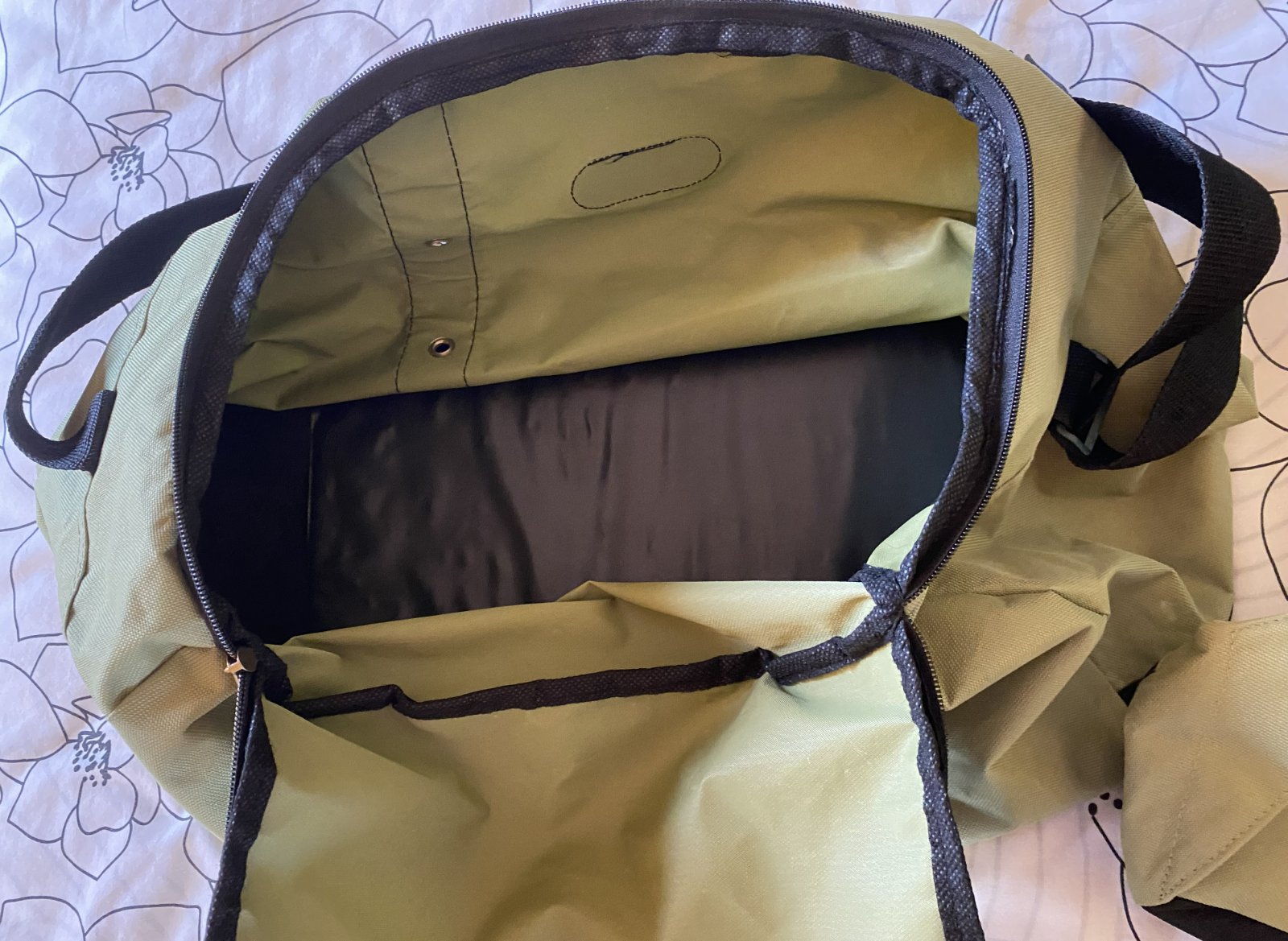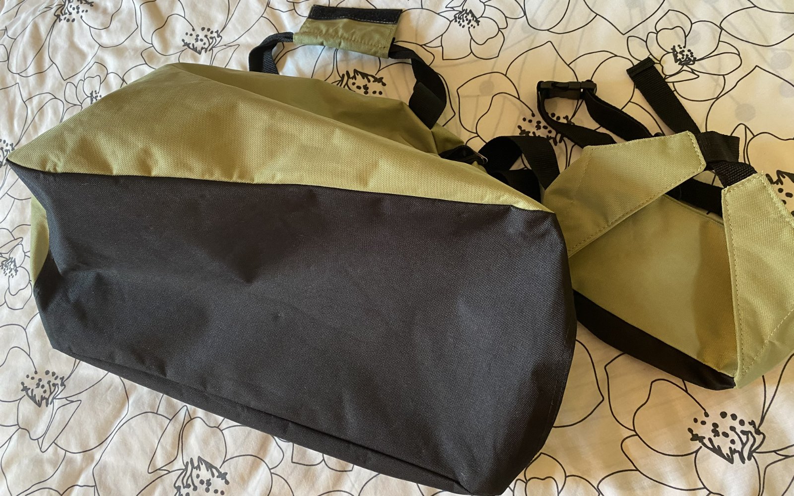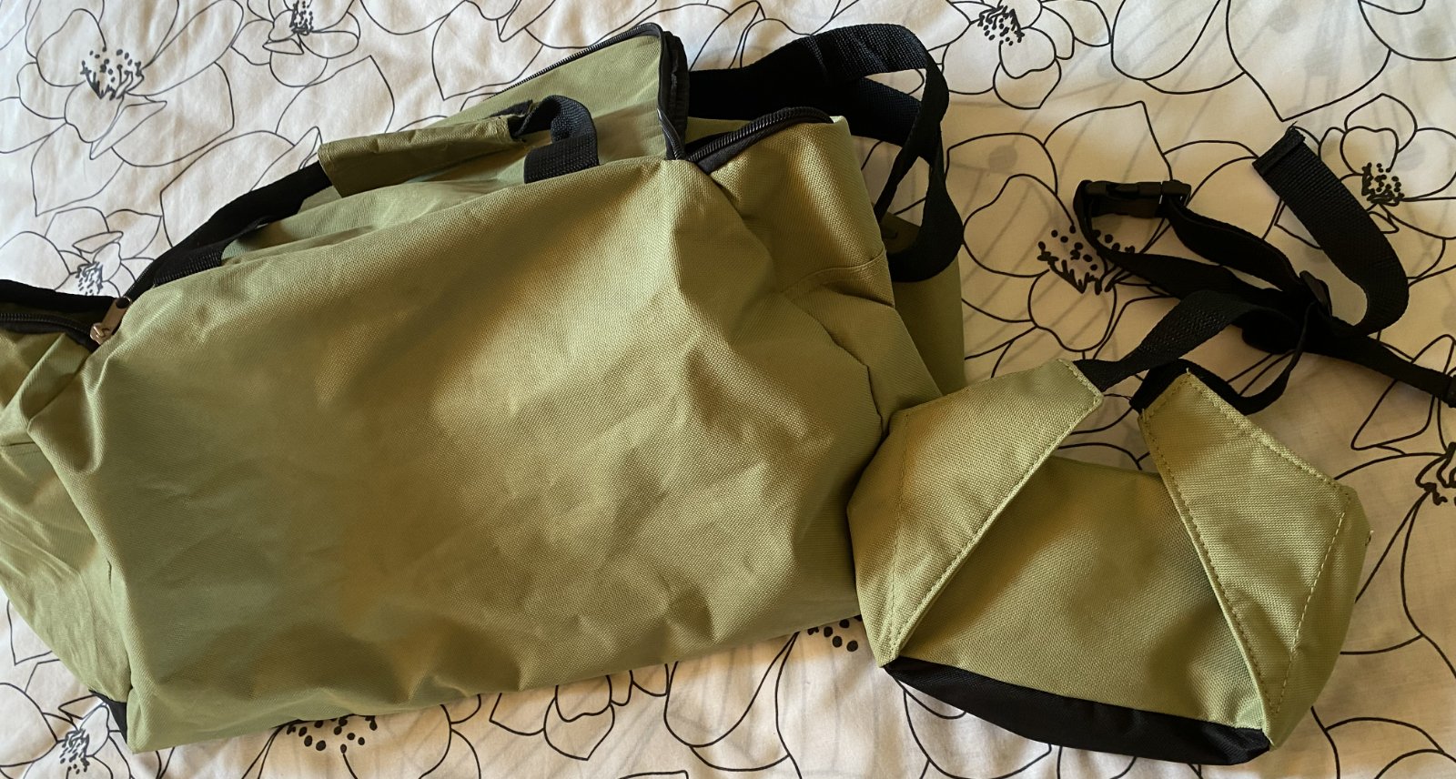 Dvojpack Travel Bag - taška + ľadvinka, kombinácia farieb zelená + čierna, zelený pevný materiál + pevné nastaviteľné pruhy s regulovaním, na taške aj do ruky. Miery taška: predná časť výška cez stred: 23cm, zadná časť výška cez stred: 27cm, spodná časť - čierna: šírka:51cm, výška: 22cm.