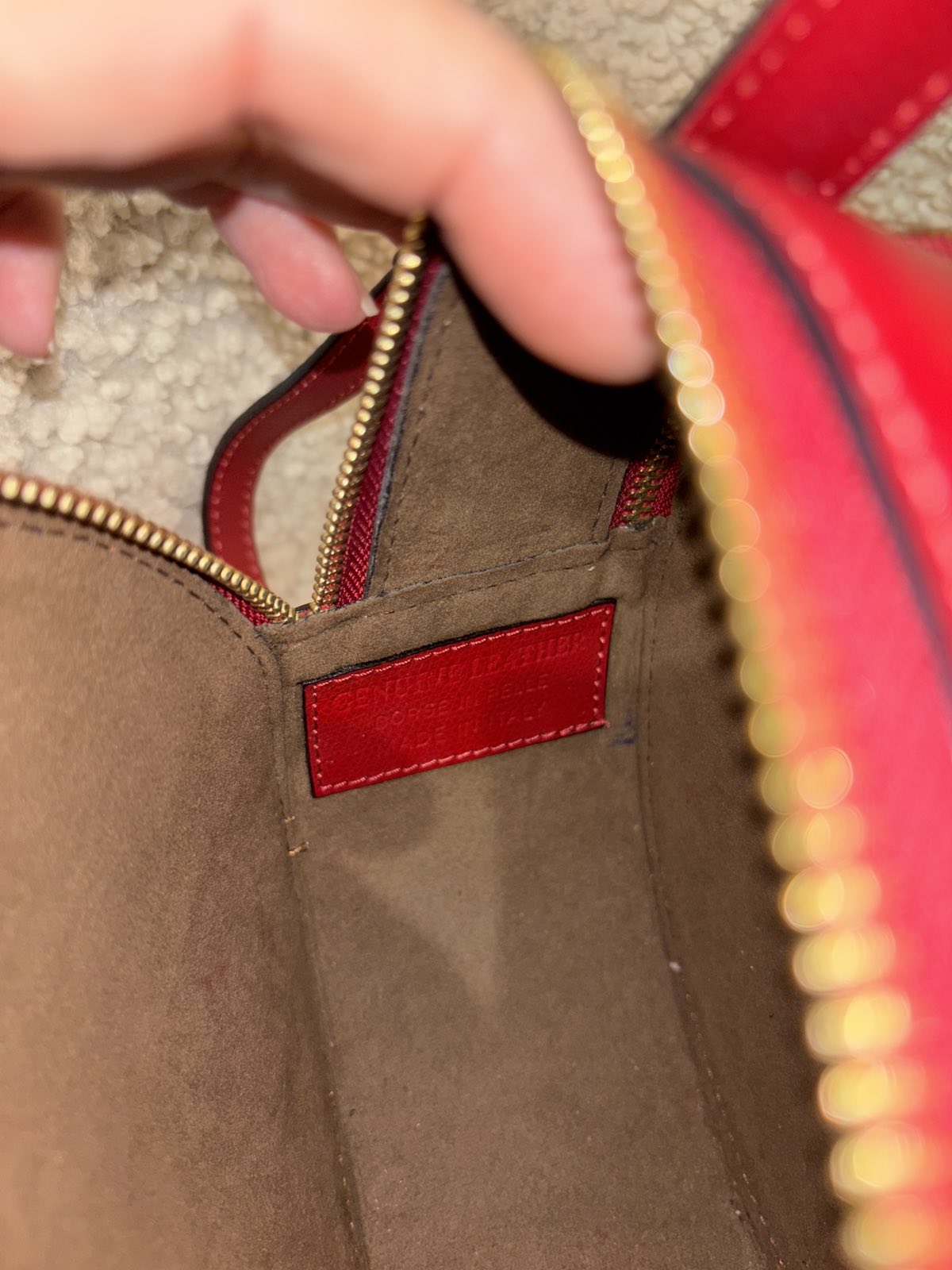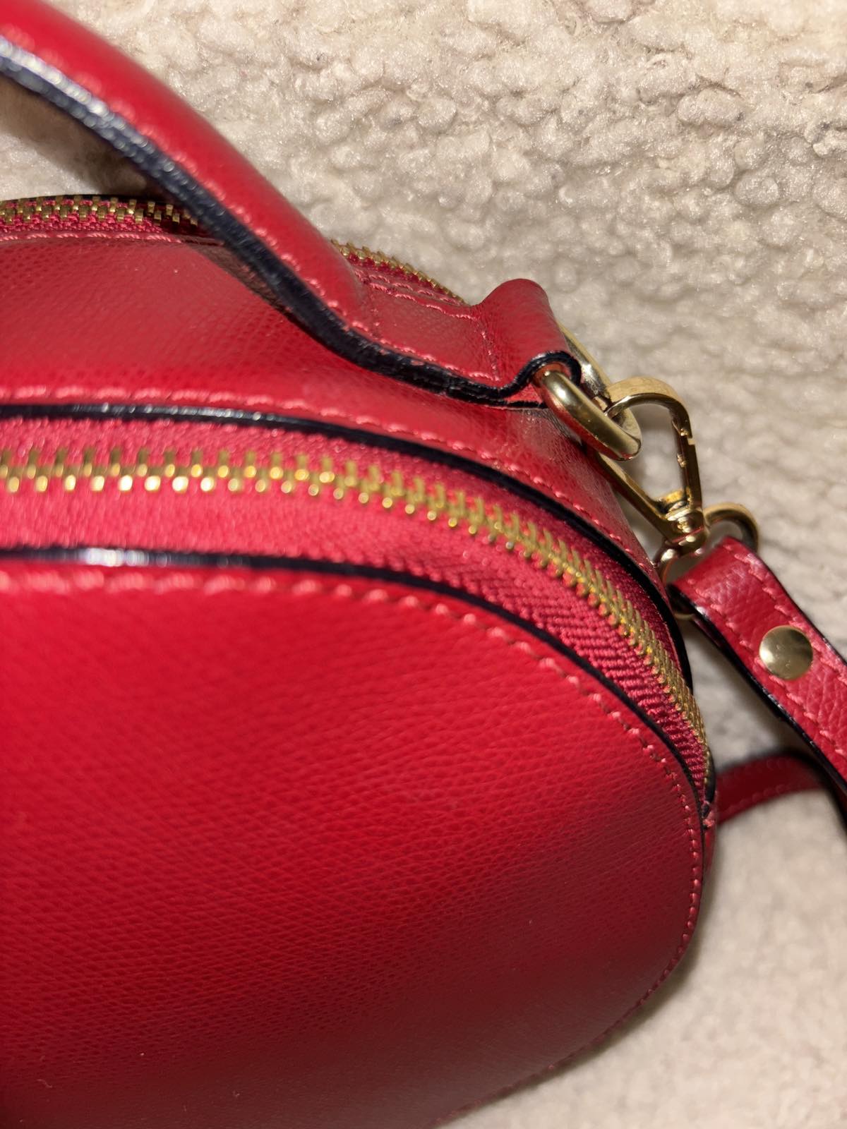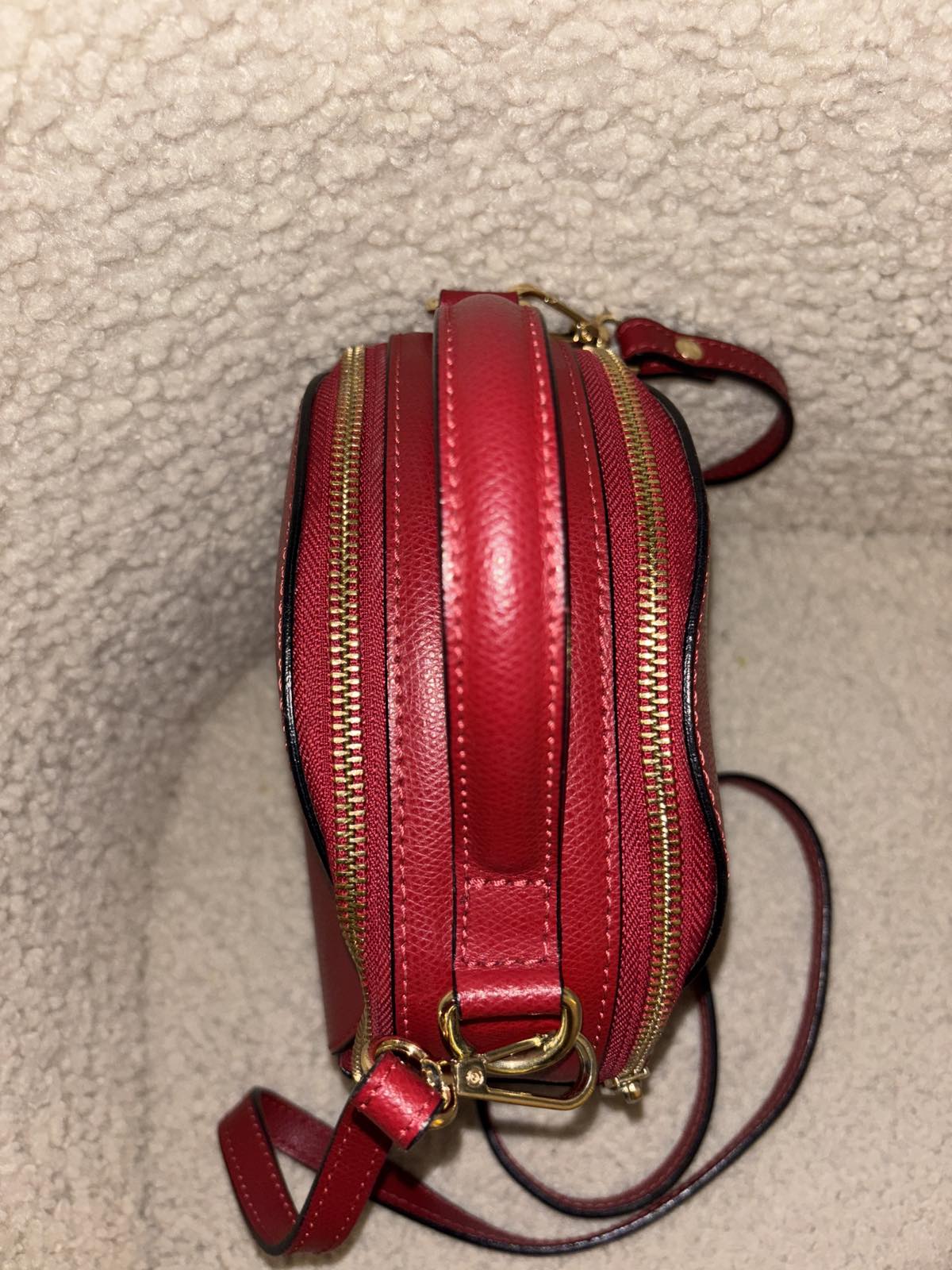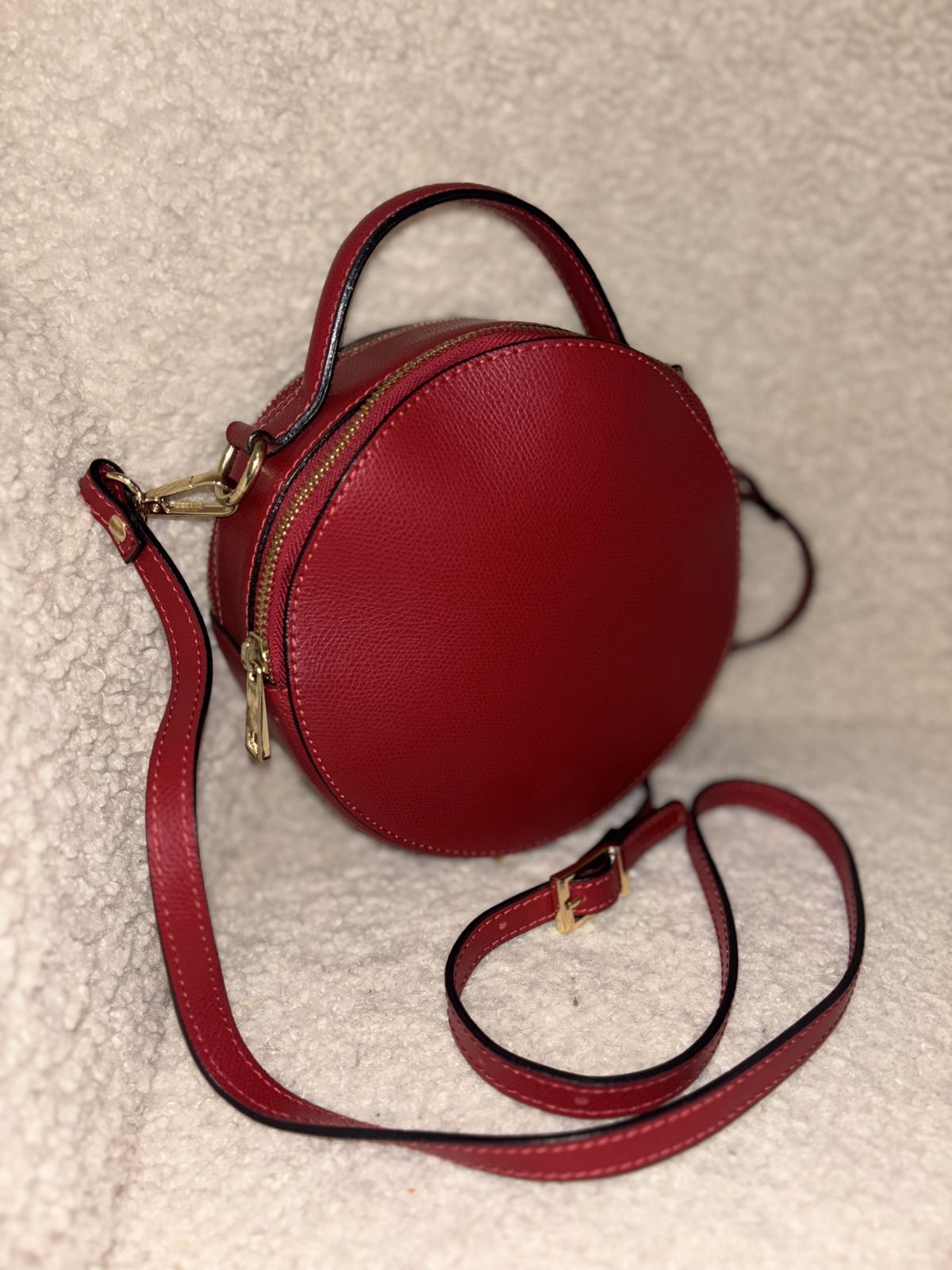 Bez známok nosenia, krásna koža vo vínovej červenej /bordovej, okrúhla, otvára sa z oboch strán, zlaté kovy, crossbody popruh