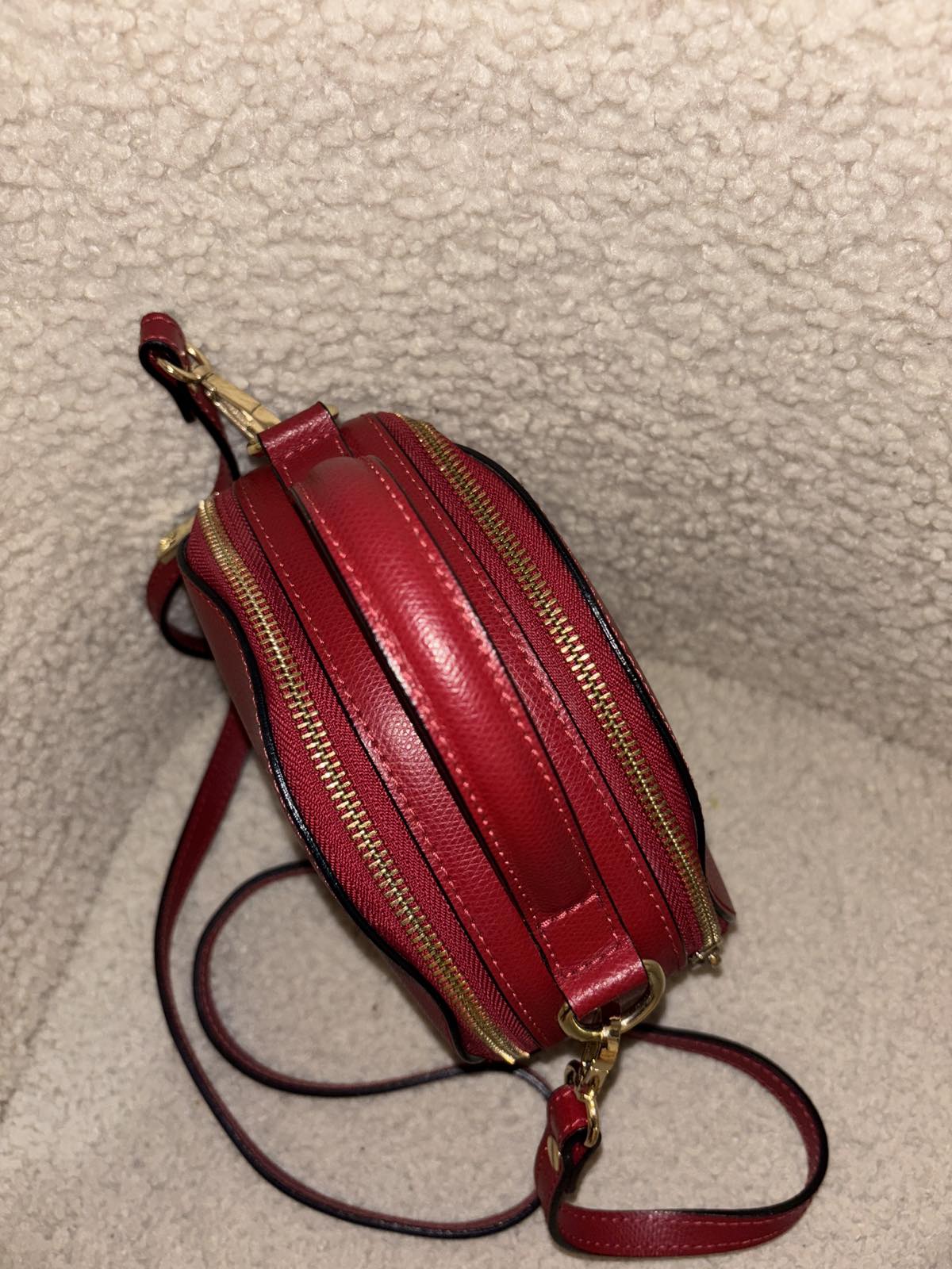 Bez známok nosenia, krásna koža vo vínovej červenej /bordovej, okrúhla, otvára sa oboch strán, zlaté kovy, crossbody popruh
