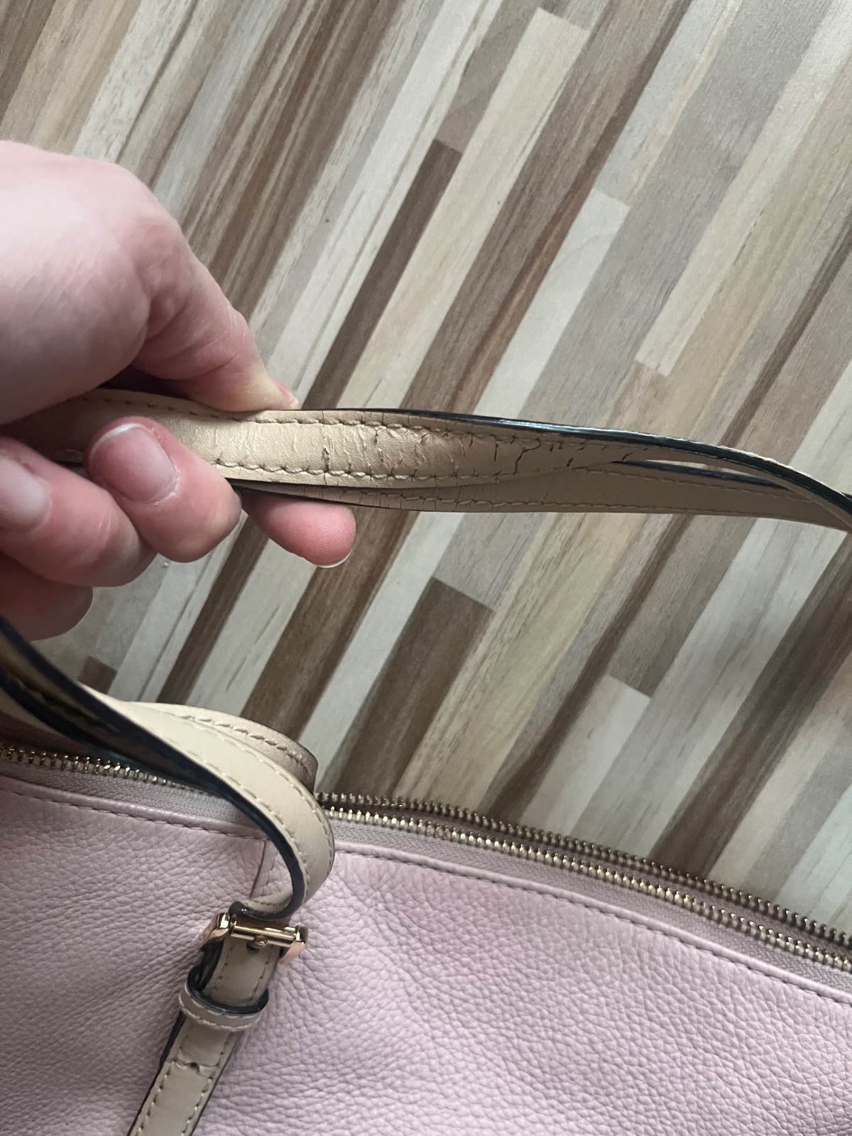 Známky používania vidno na rúčke a spodné rohy sú ošuchnuté. Ale pri nosení ani jedno nevidno. Parádu urobí. Je super praktická-celá sa dá zavrieť na zips a zmestíte tam celý “život”;) Pekná farba
