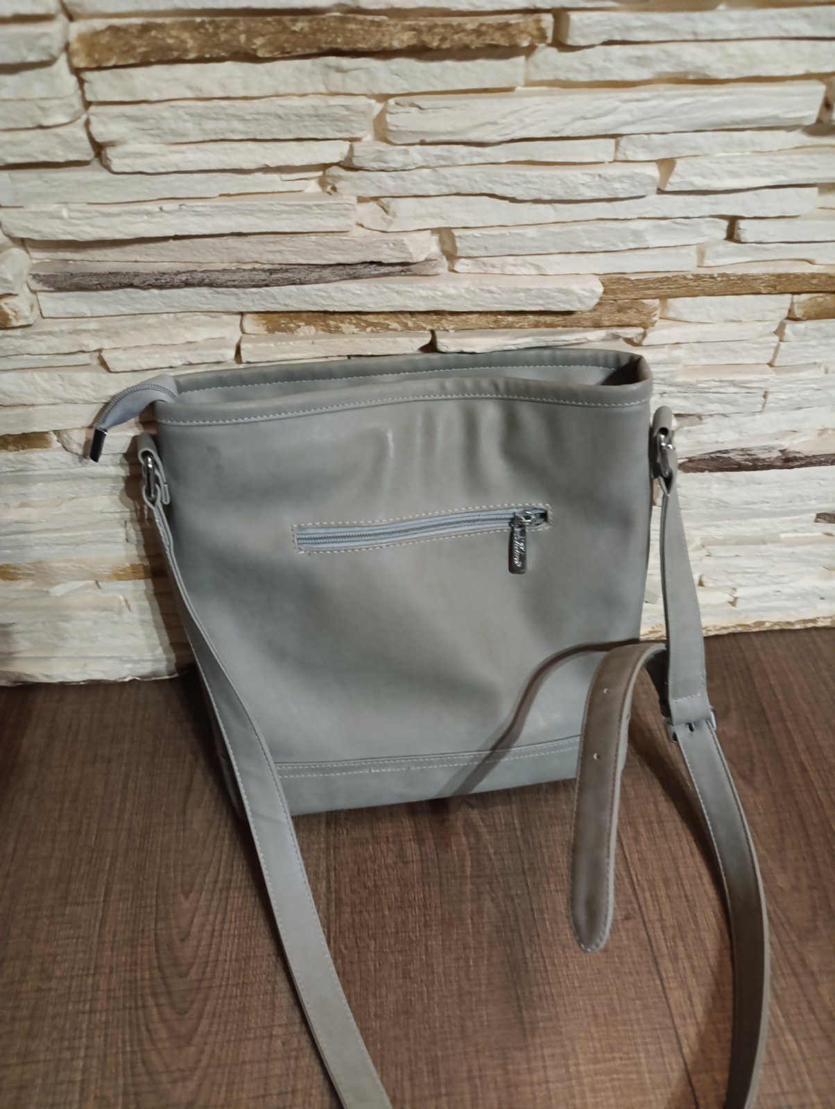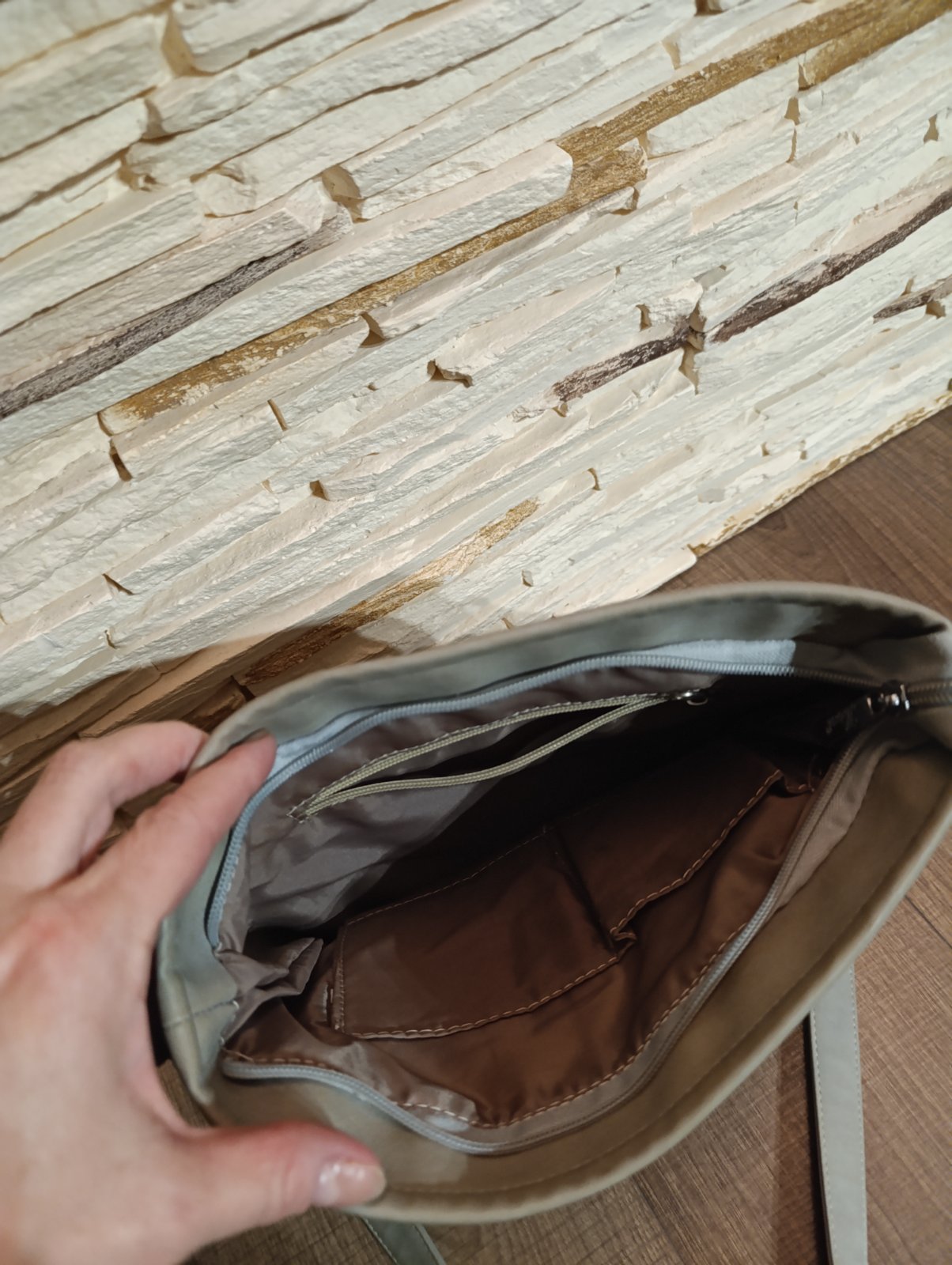 Neutrálna farba, hodí sa ku všetkému. Málinko nosená, bez poškodenia. Dlhý popruh je súčasťou, vnútri má veľa vreciek.
