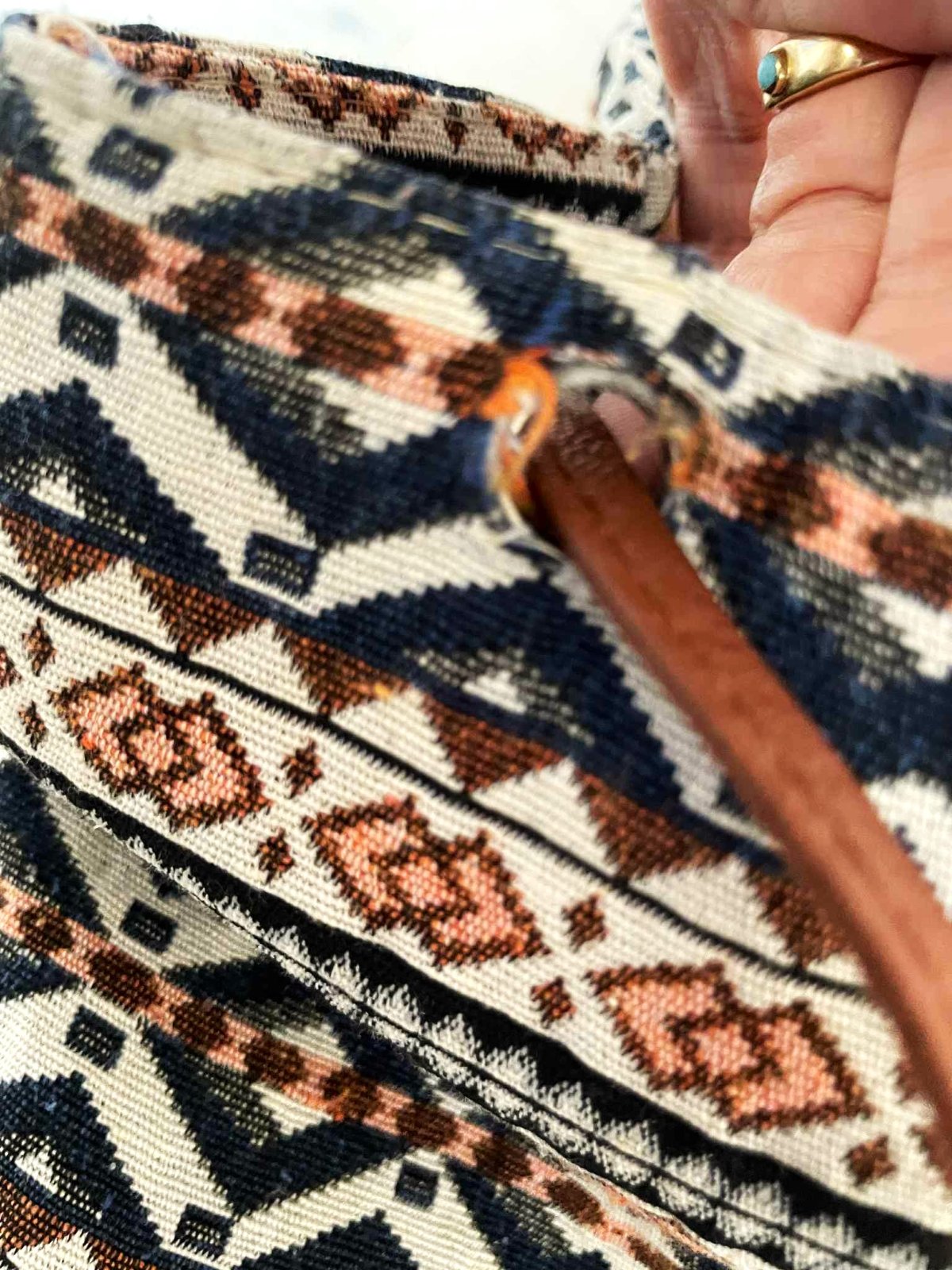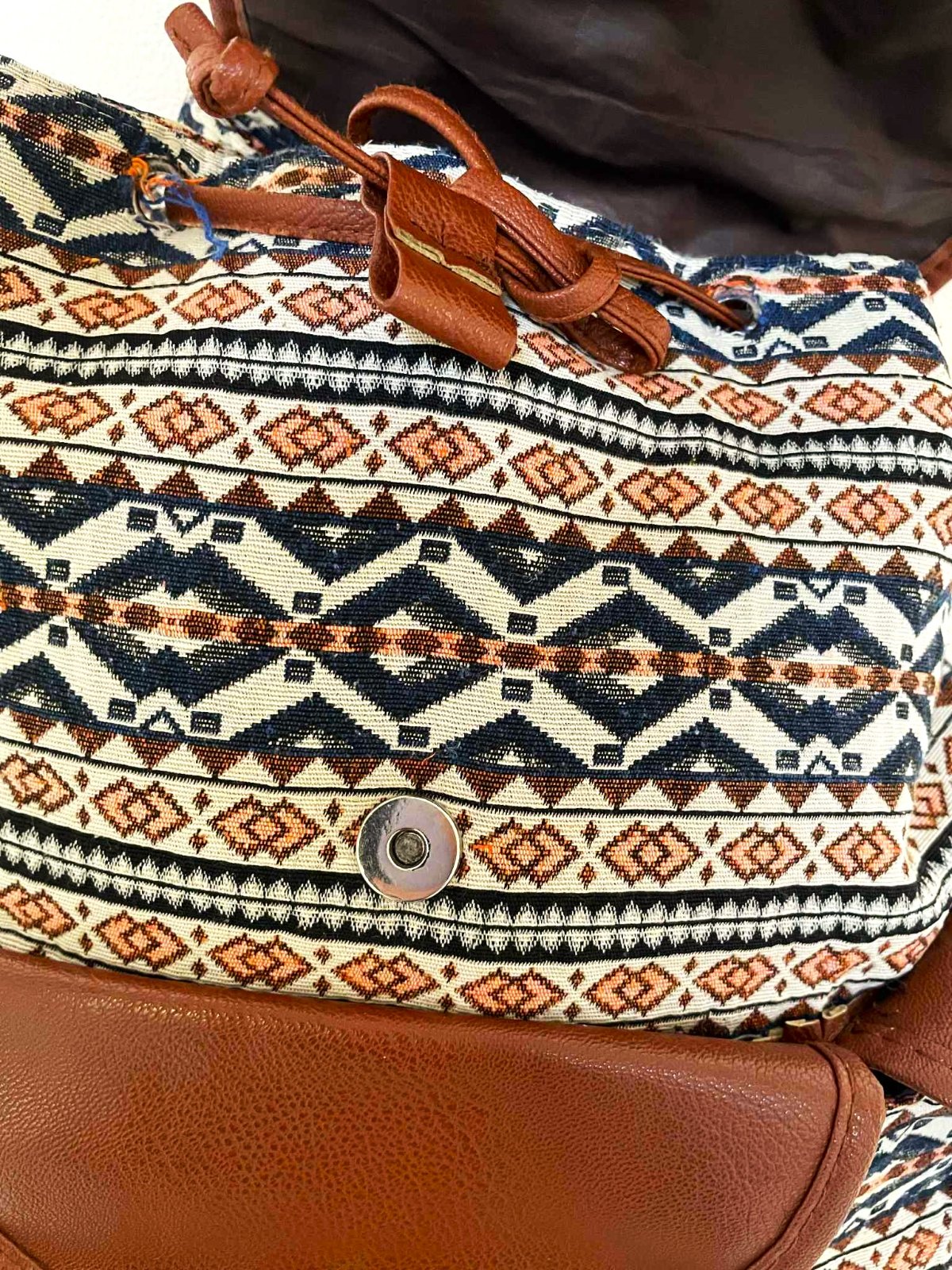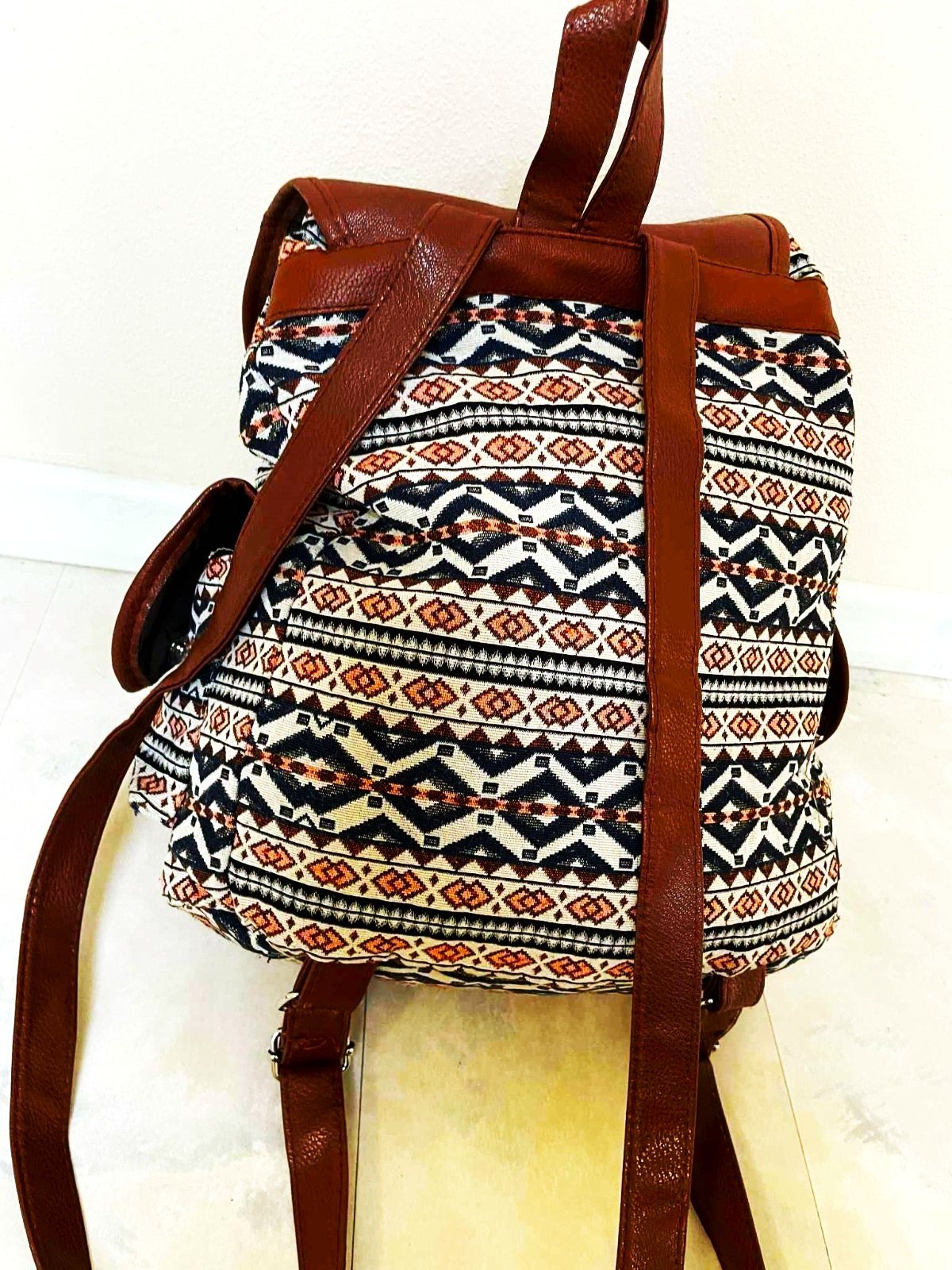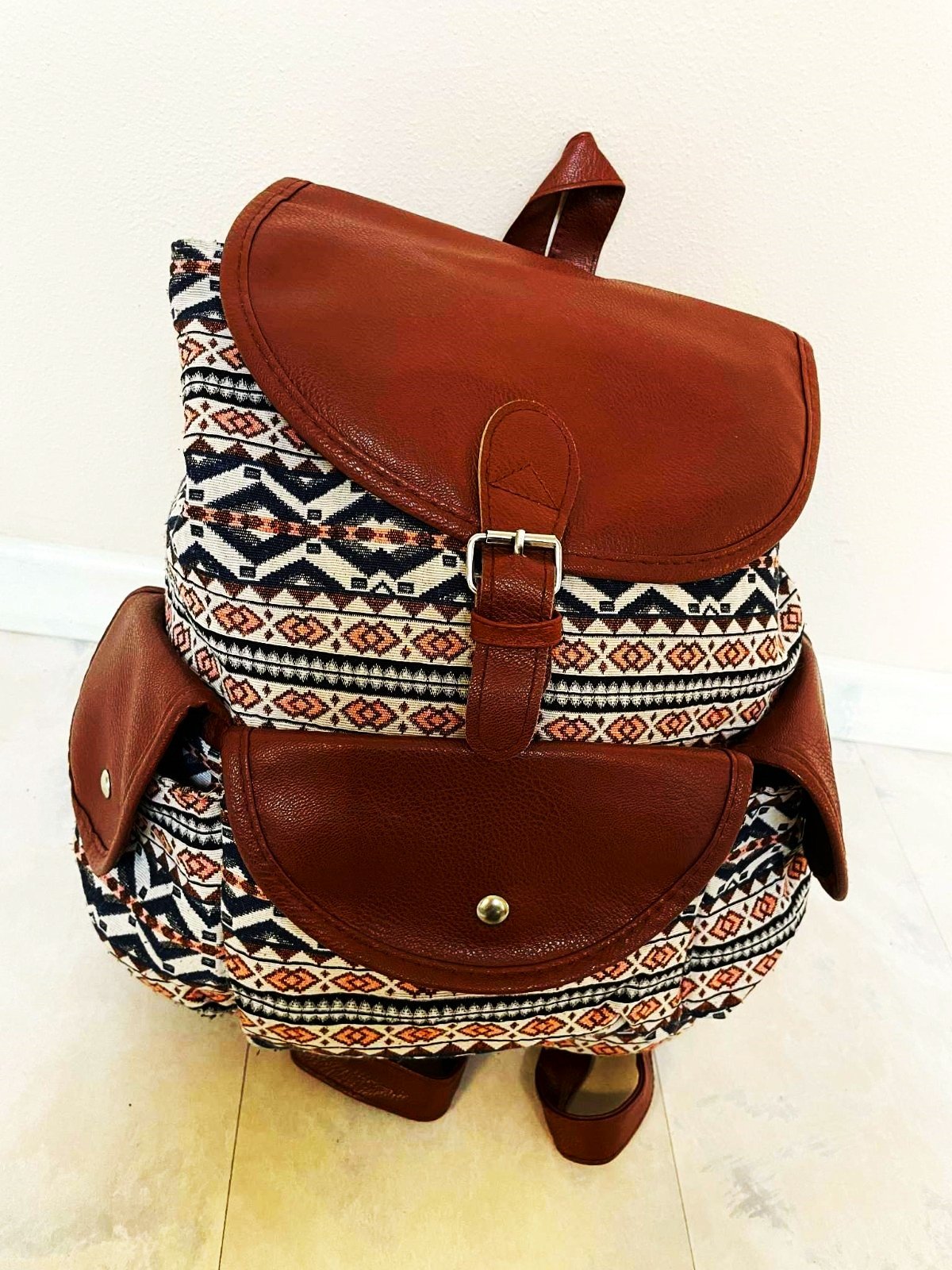 vkusný rupsak, pevná látka kombinovaná s matnou hnedou koženkou, zapínanie na magnetky,vzadu povoliteľné popruhy, dnu podšitý,vak je priestranný,veľa sa do neho zmestí, dá sa pekne oprať,n prevliekacích očkách je niekde vypadnutý krúžok - viď foto, čo pri nosení nie je vidno,ale upozorňujem