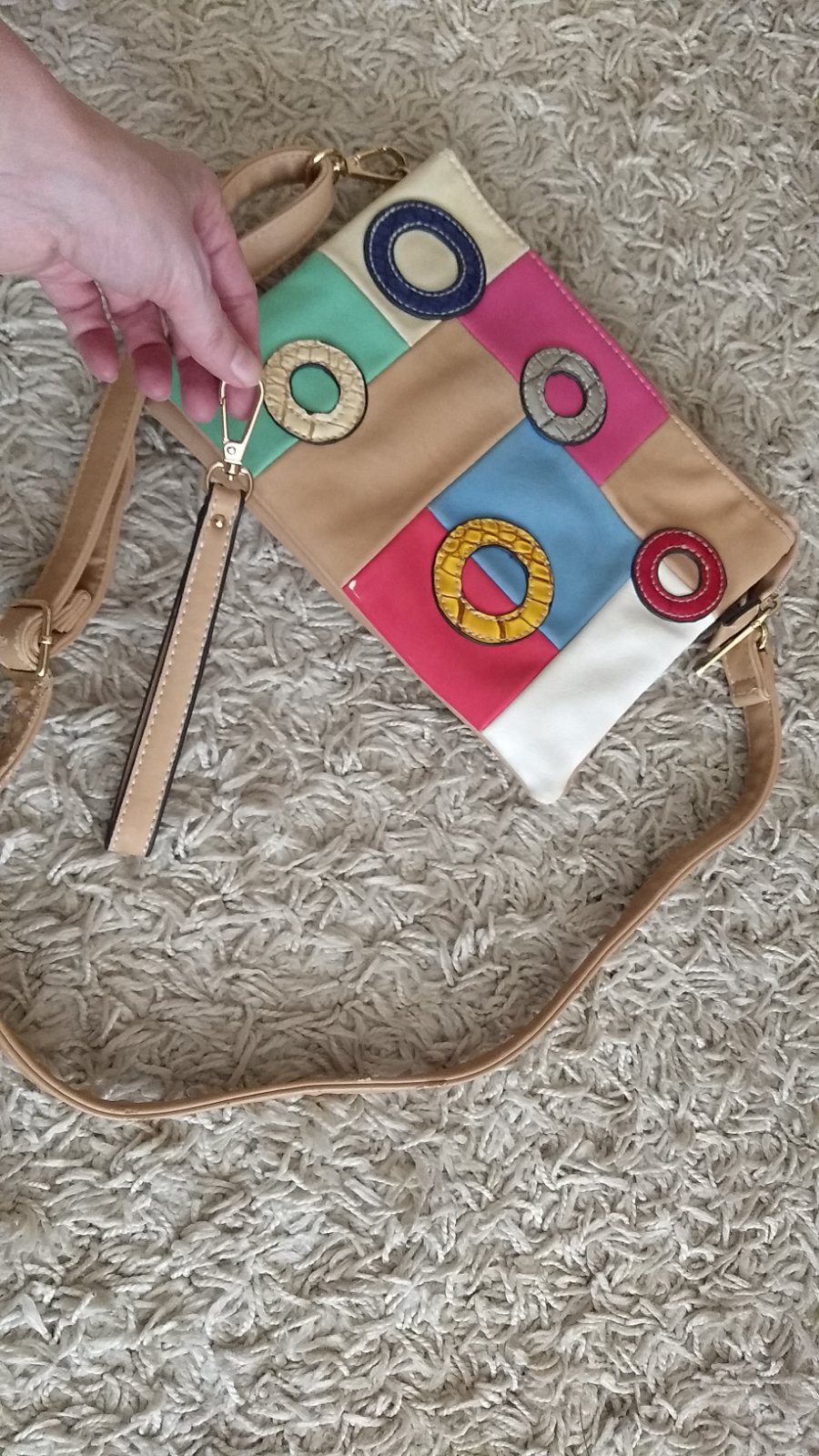 Nosená, drobné chybičky nafotené, vzadu na kabelke a sem tam odreninky aj na dlhom traku. malý trak keď zapnete, ten je bez chyby, kabelka bude do ruky...mala som ju na dvoch dovolenkách