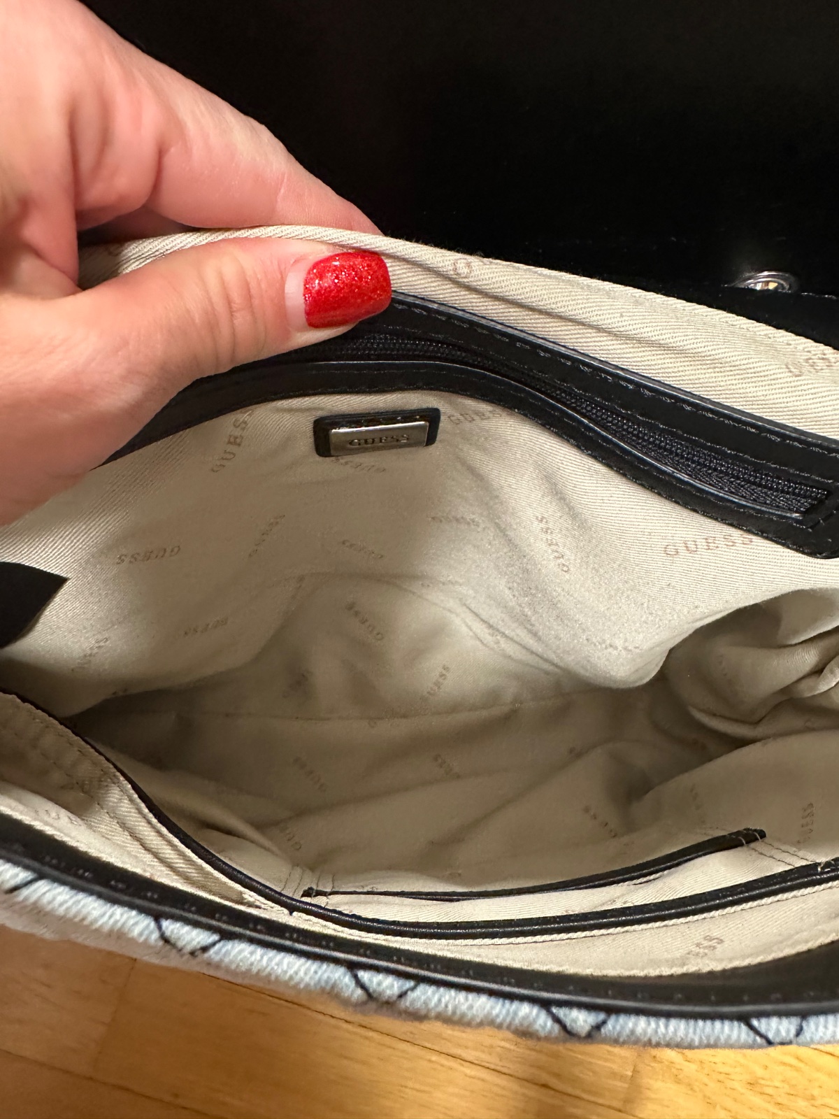 Predám originál kabelku Guess, minimálne nosenú, cca 5x vzatú Kabelka je bez poškodenia, okrem vnútra, tam sa mi vyliala voda viď foto, ale da sa to vyčistiť, odfotila som ju z každej strany, ok...