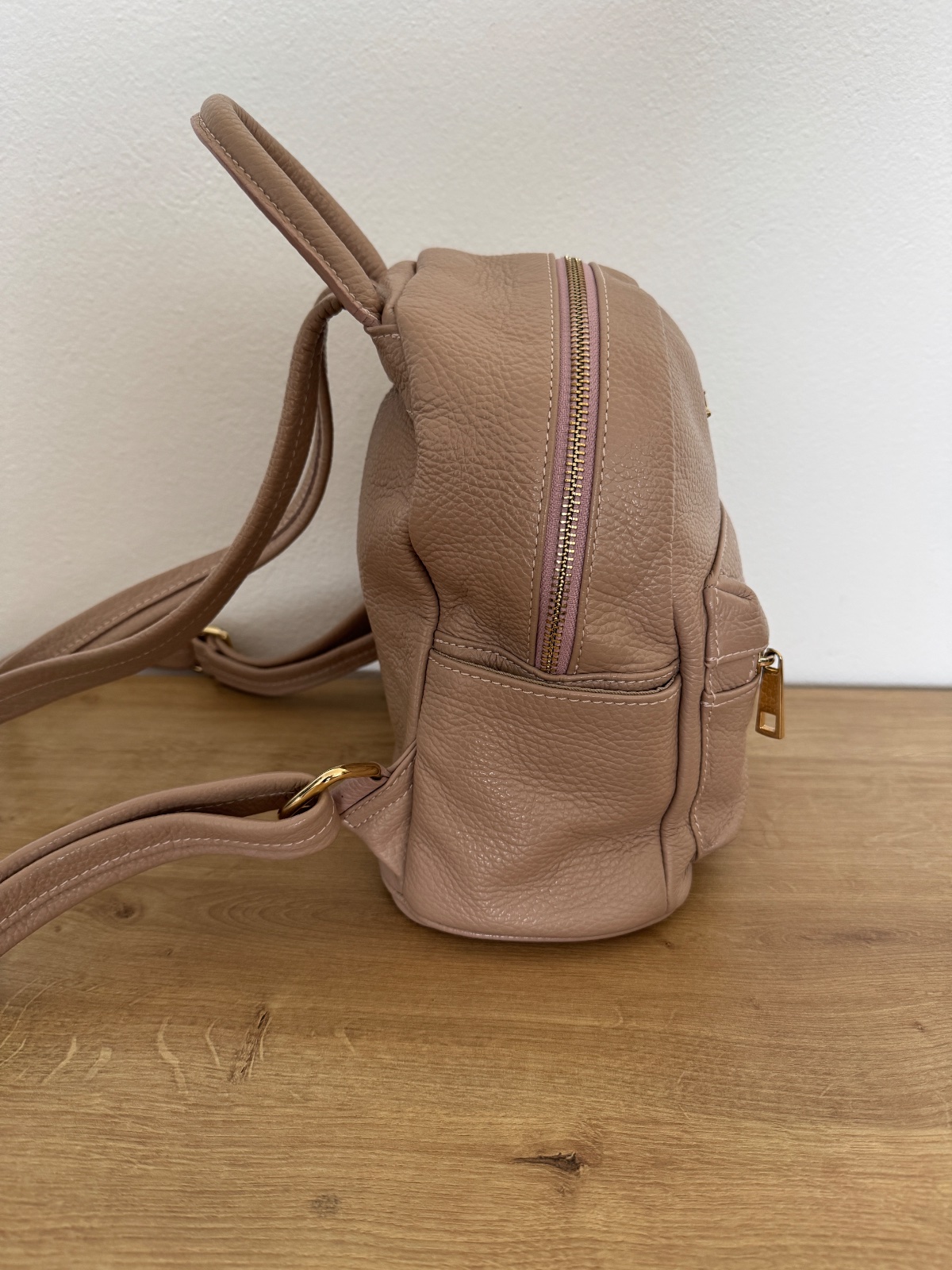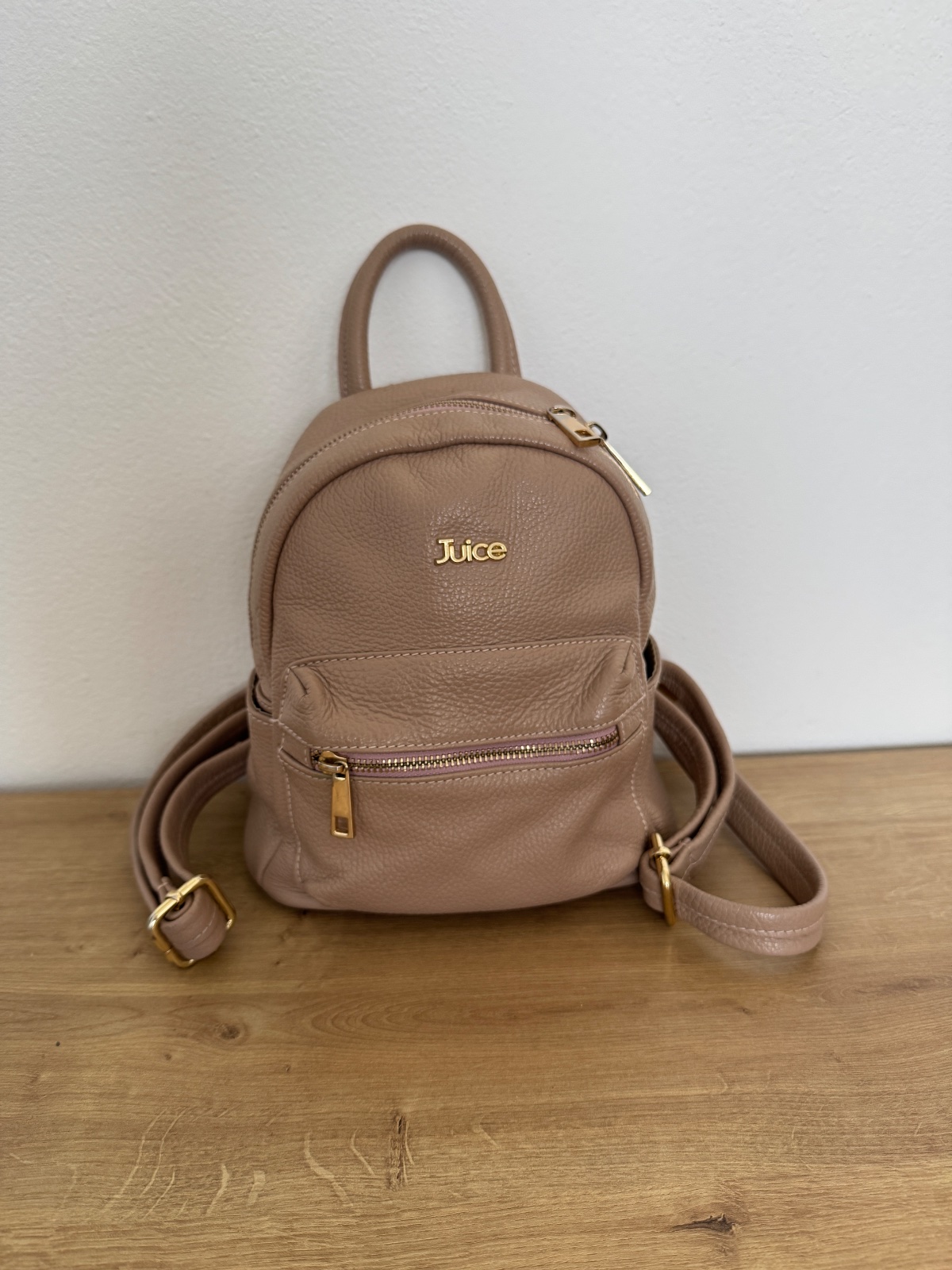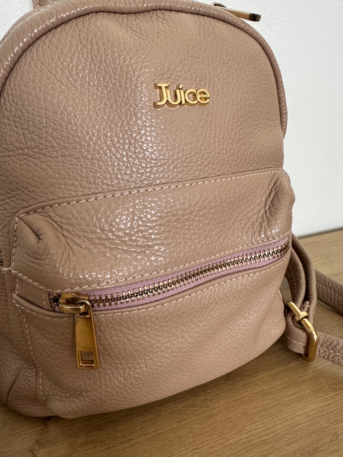 Malý kožený batoh zn. Juice v púdrovej farbe, nosený, známky nosenia na zipsoch a na spodnej časty vaku je koža zošúchaná a zafarbená od džínsov.