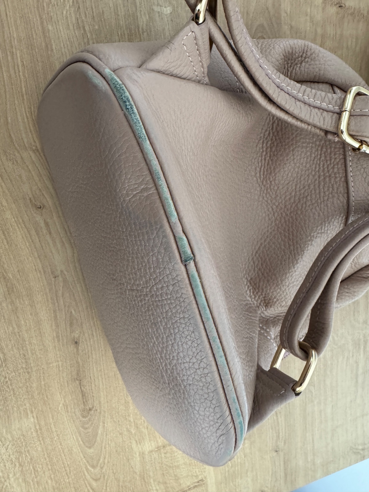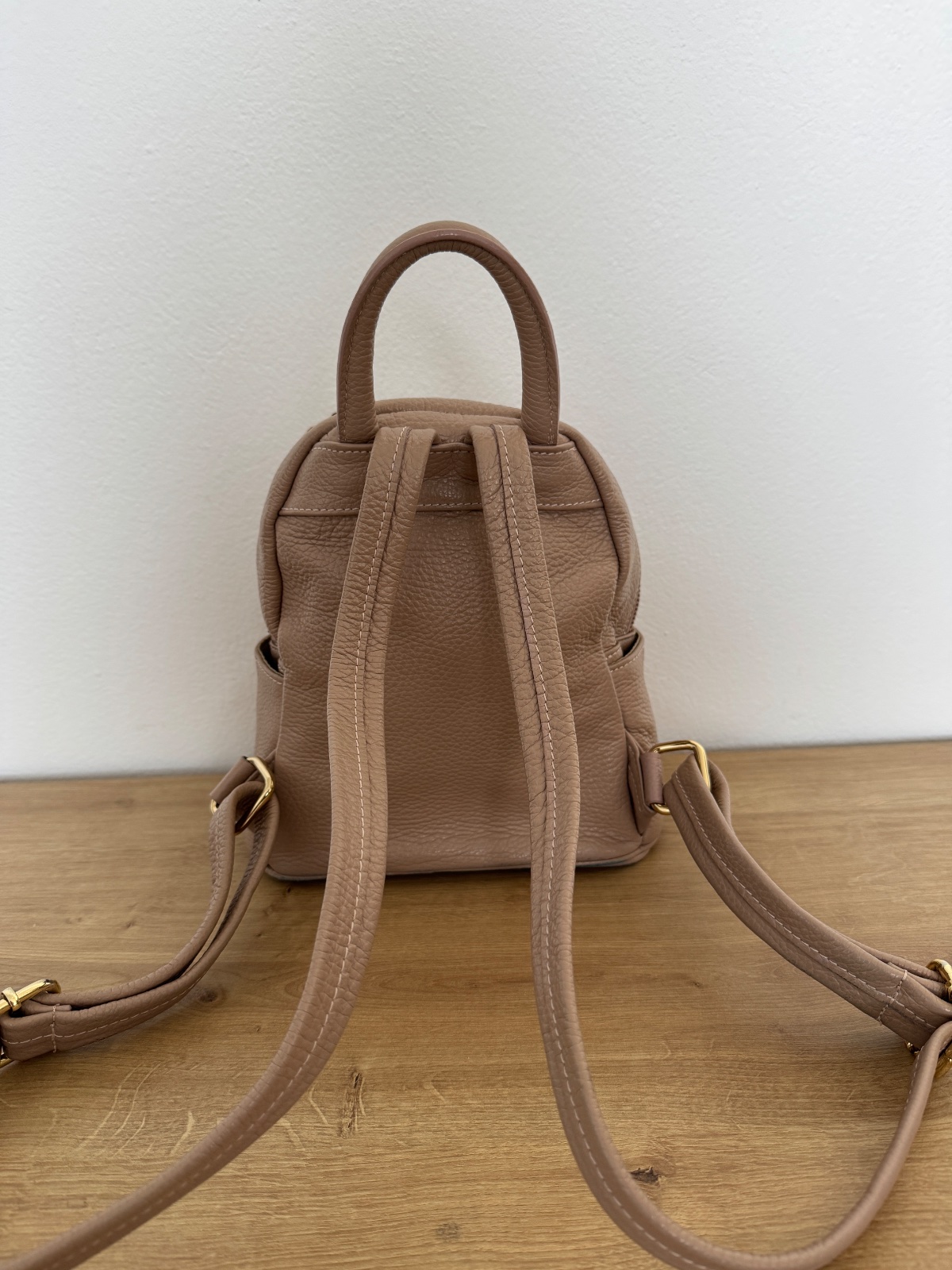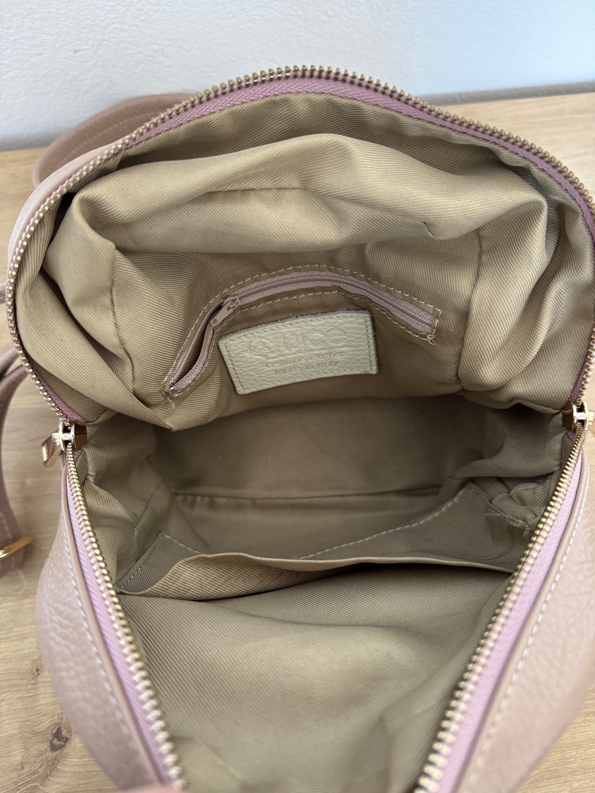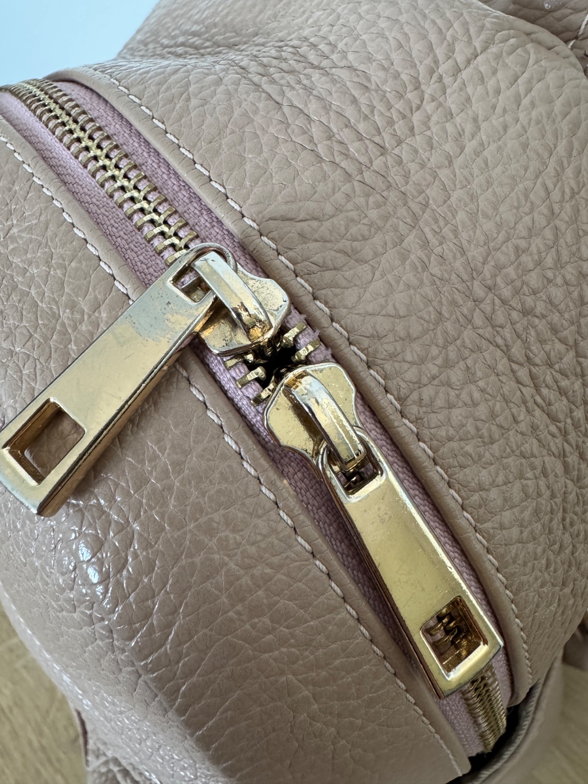Malý kožený batoh zn. Juice v púdrovej farbe, nosený, známky nosenia na zipsoch a na spodnej časty vaku je koža zošúchaná a zafarbená od džínsov.