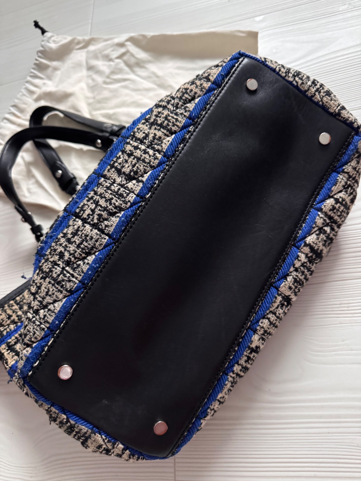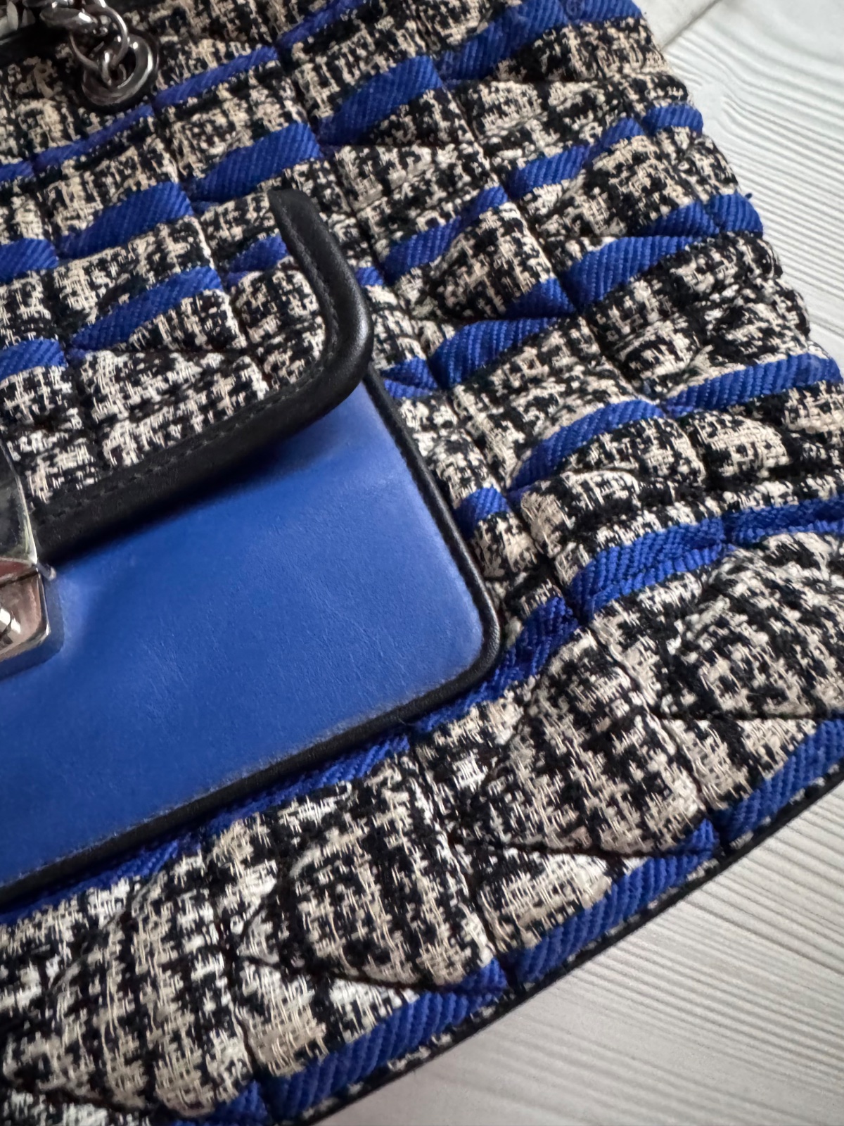 Dizajn: Čierno-biely tweedový vzor s výraznými modrými horizontálnymi pruhmi. Prednú stranu zdobí kožené vrecko s ikonickým kovovým zapínaním.