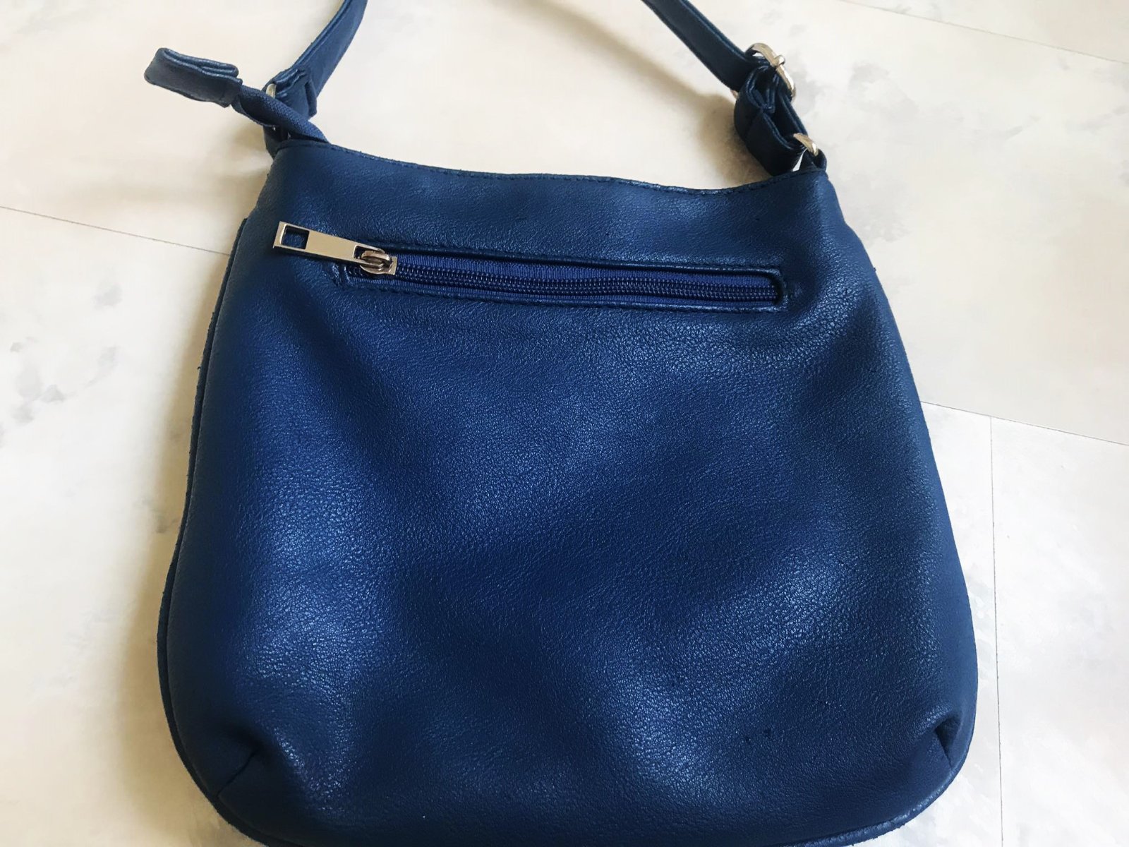 nosená stredne modrá kabelka,syntetika,mnoho priehradok,nosením jemne miestami ošúchaná - nafotené,ale nie je to veľmi vidieť, 22 x 24 cm, rúčka = 130 cm