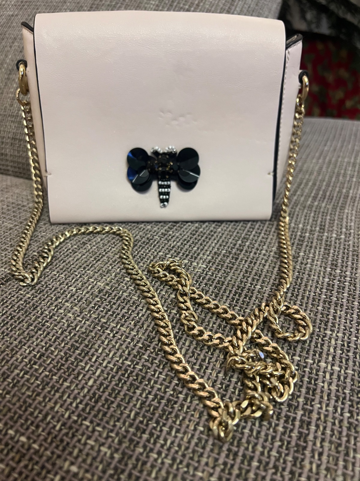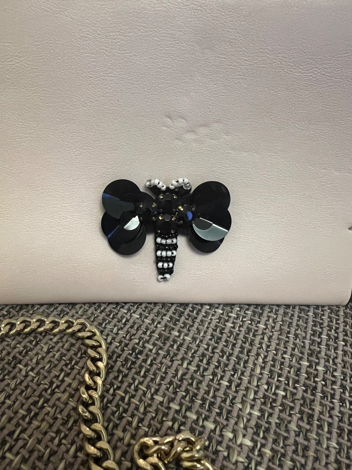 Púdrovoružová farba taštičky s modrou kamienkovou vážkou.