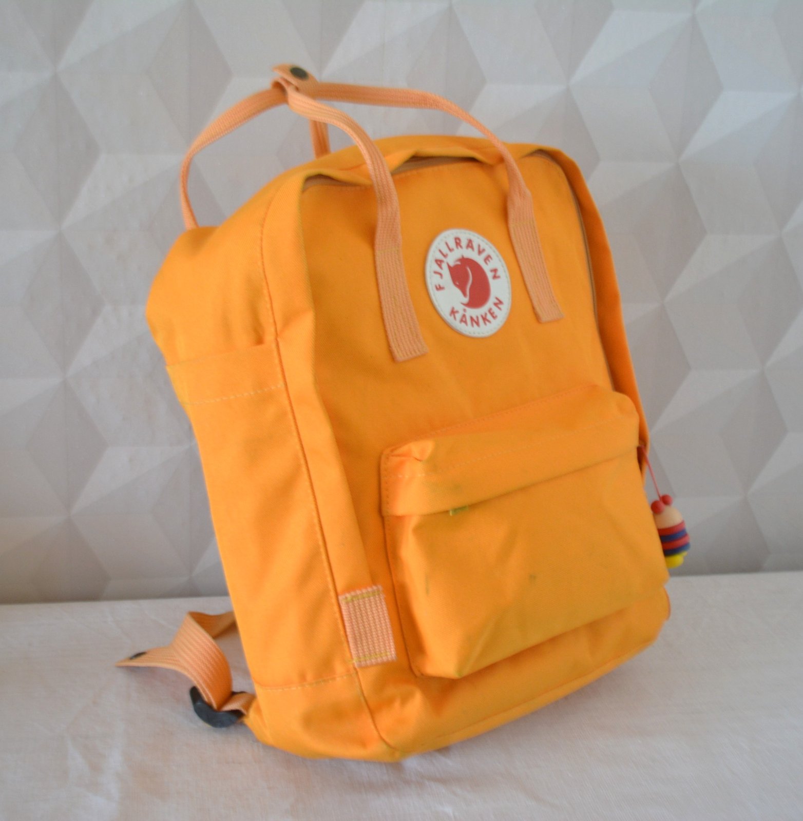 Žltý batoh obľúbenej značky Fjällräven känken, ktorý je vyrobený z nepremokavého a kvalitného materiálu.