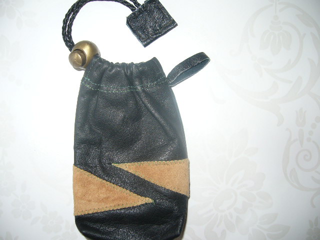 Cierna kozena tastika na krk,zapinanie na suchy zips .Rozmer 12x11 cm.Snurka je dlha 43x2.Nebola pouzivana,vhodna ako darcek.