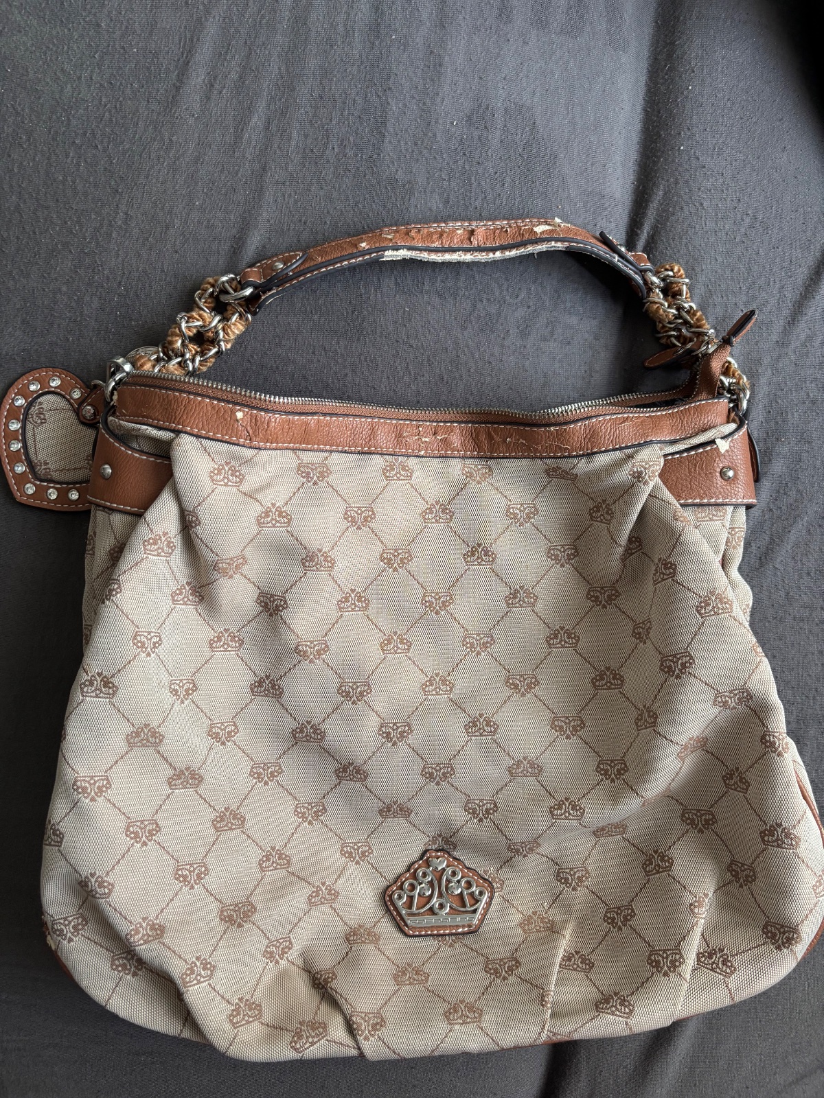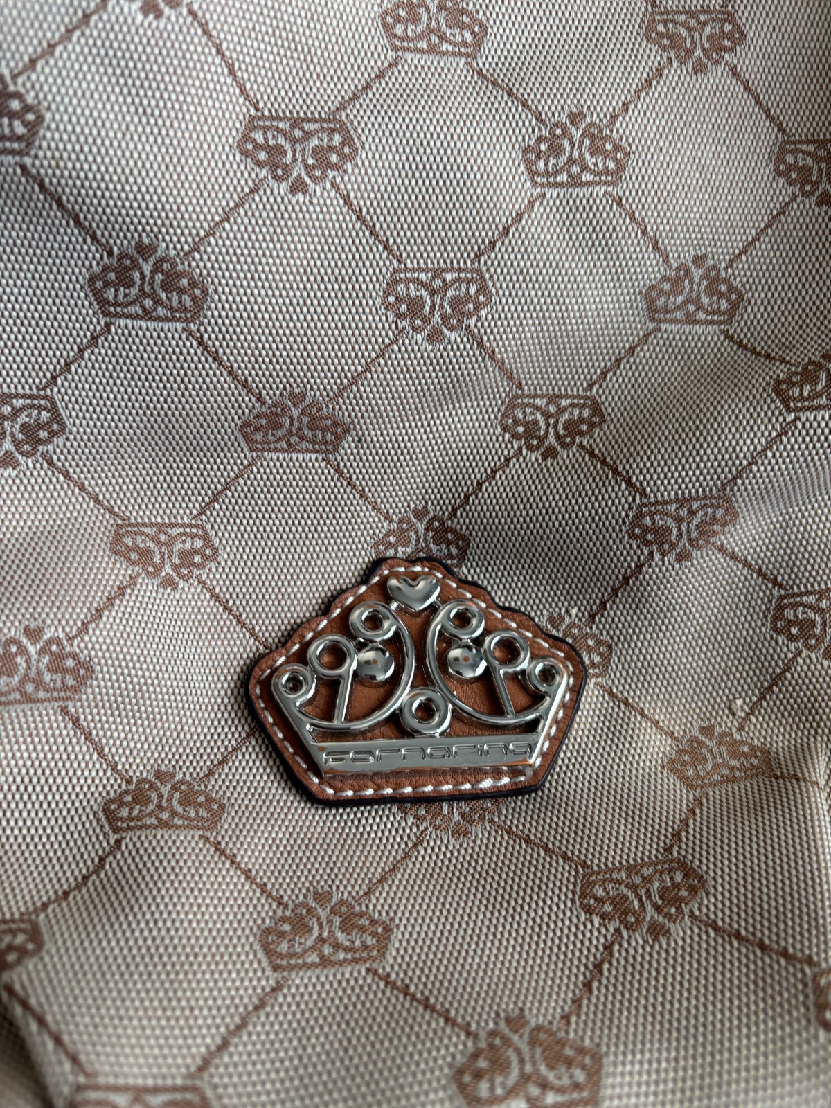 Predám krásnu originálnu kabelku značky Juicy Couture zo staršej kolekcie „Suede Couture“. Typický Y2K dizajn s korunkovým vzorom, srdiečkovým príveskom a retiazkovým detailom. Farba: béžová s hnedými koženými prvkami.