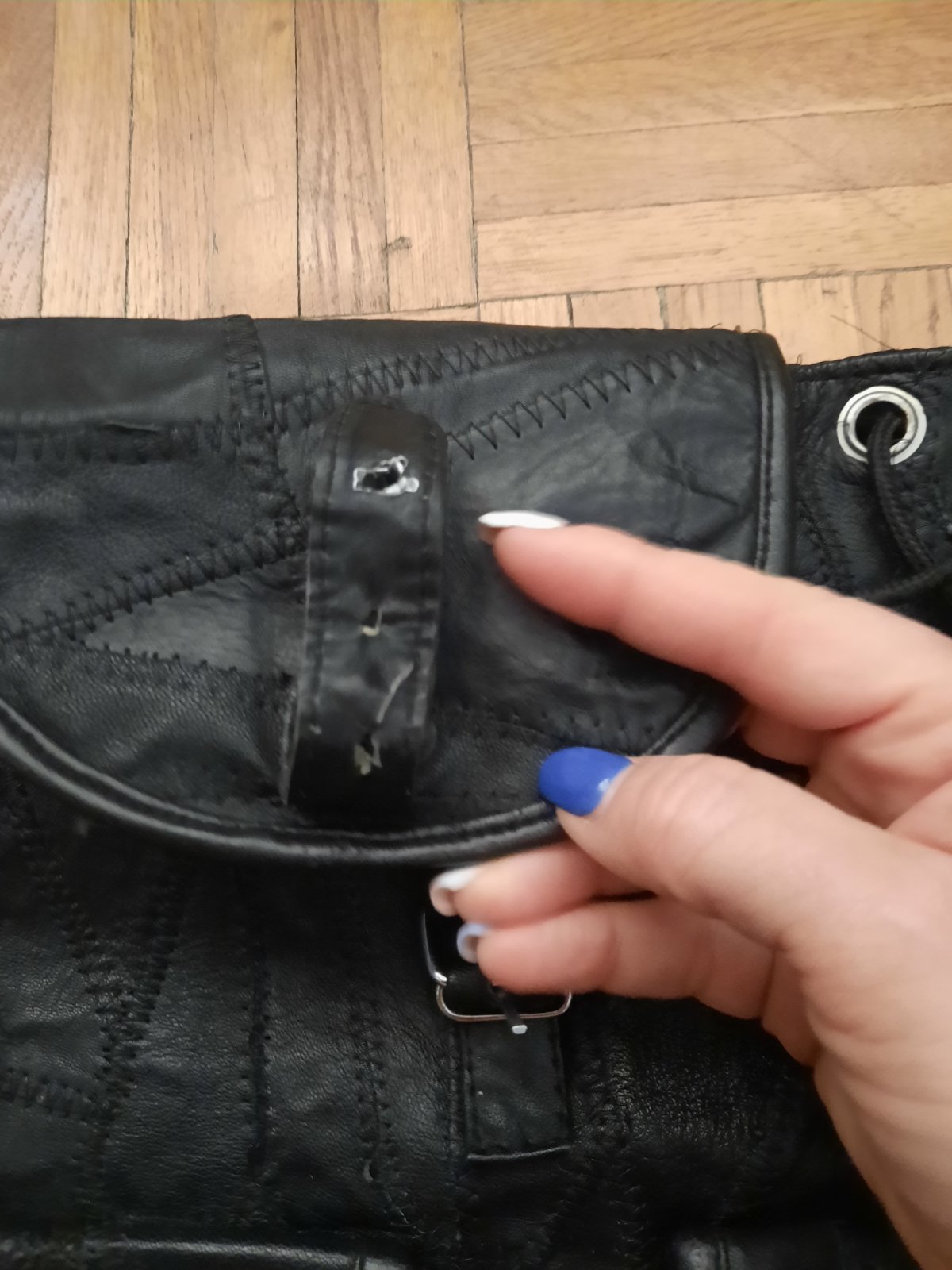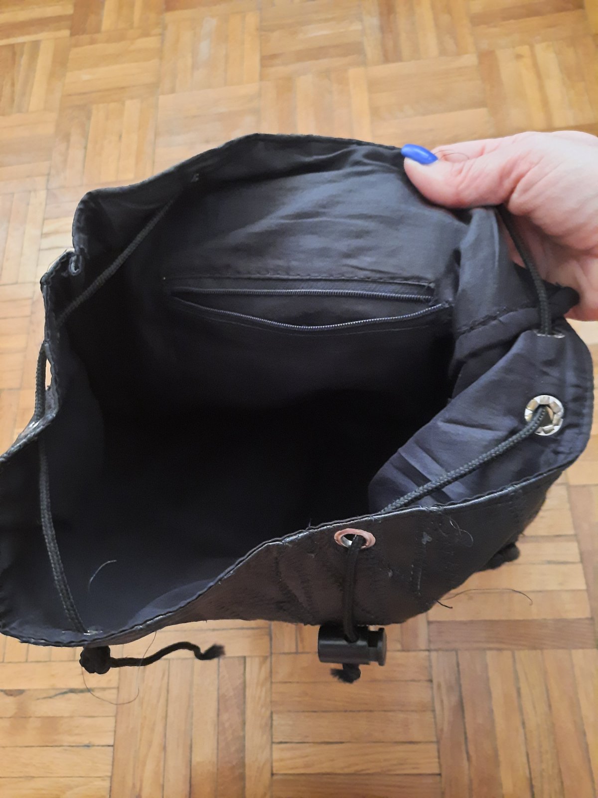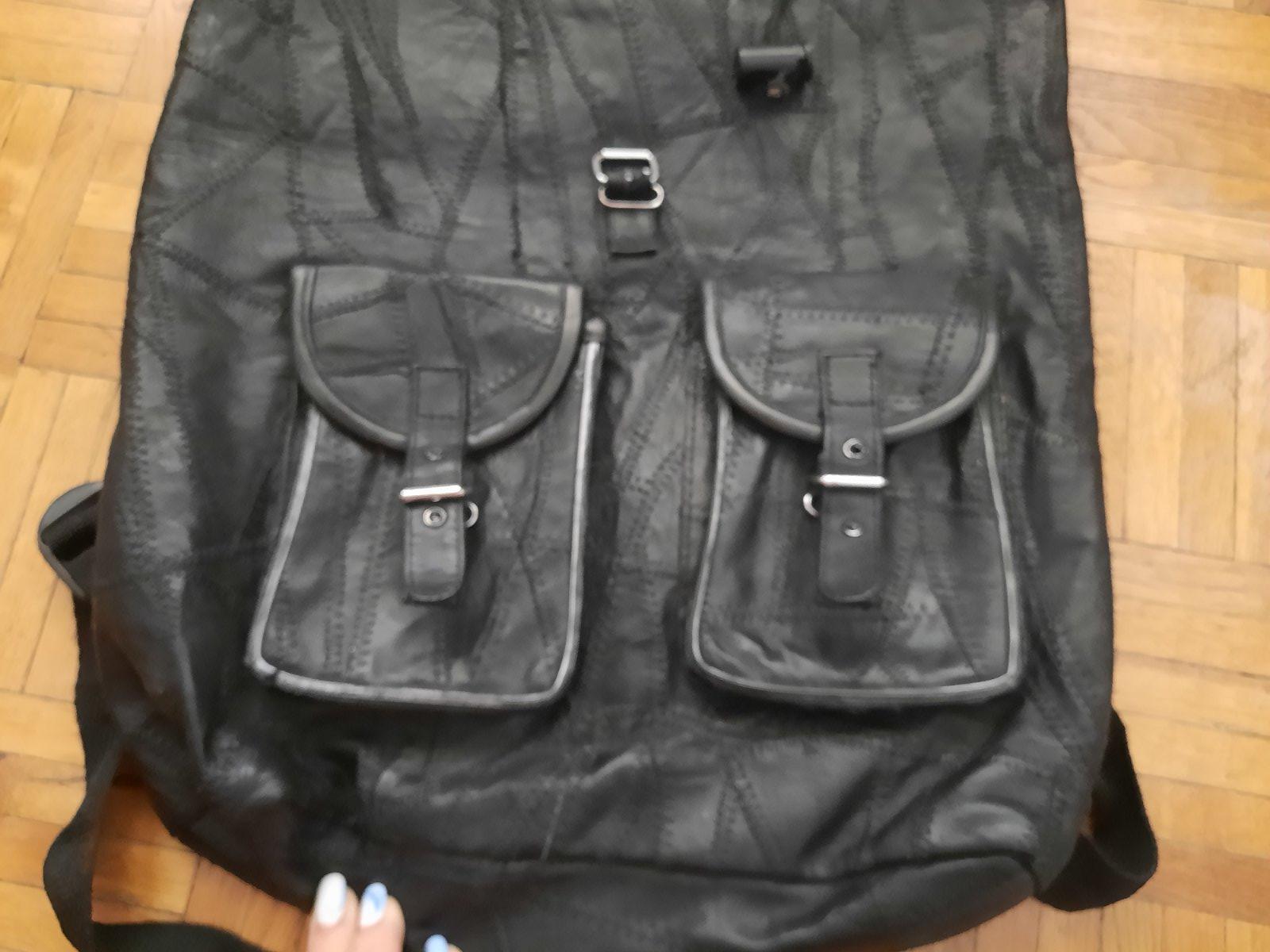 Pekný čierny ruksák, materiál je podľa mňa koža. Je príjemný mäkký na dotyk. Má veľký úložný priestor. Vo vnútri je malý vačok. Zvonka vpredu sú tiež 2 menšie vačky na ukladanie. Ramienka sú nastaviteľné. Celý ruksak sa dá stiahnuť šnúrkou + zapnúť (je tam malé poškodenie).