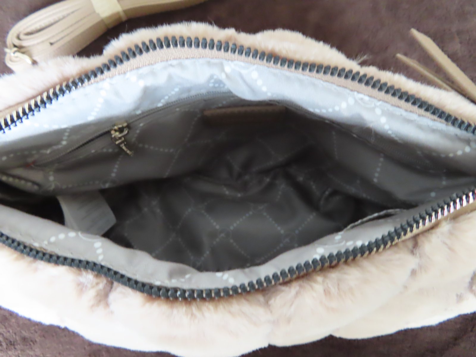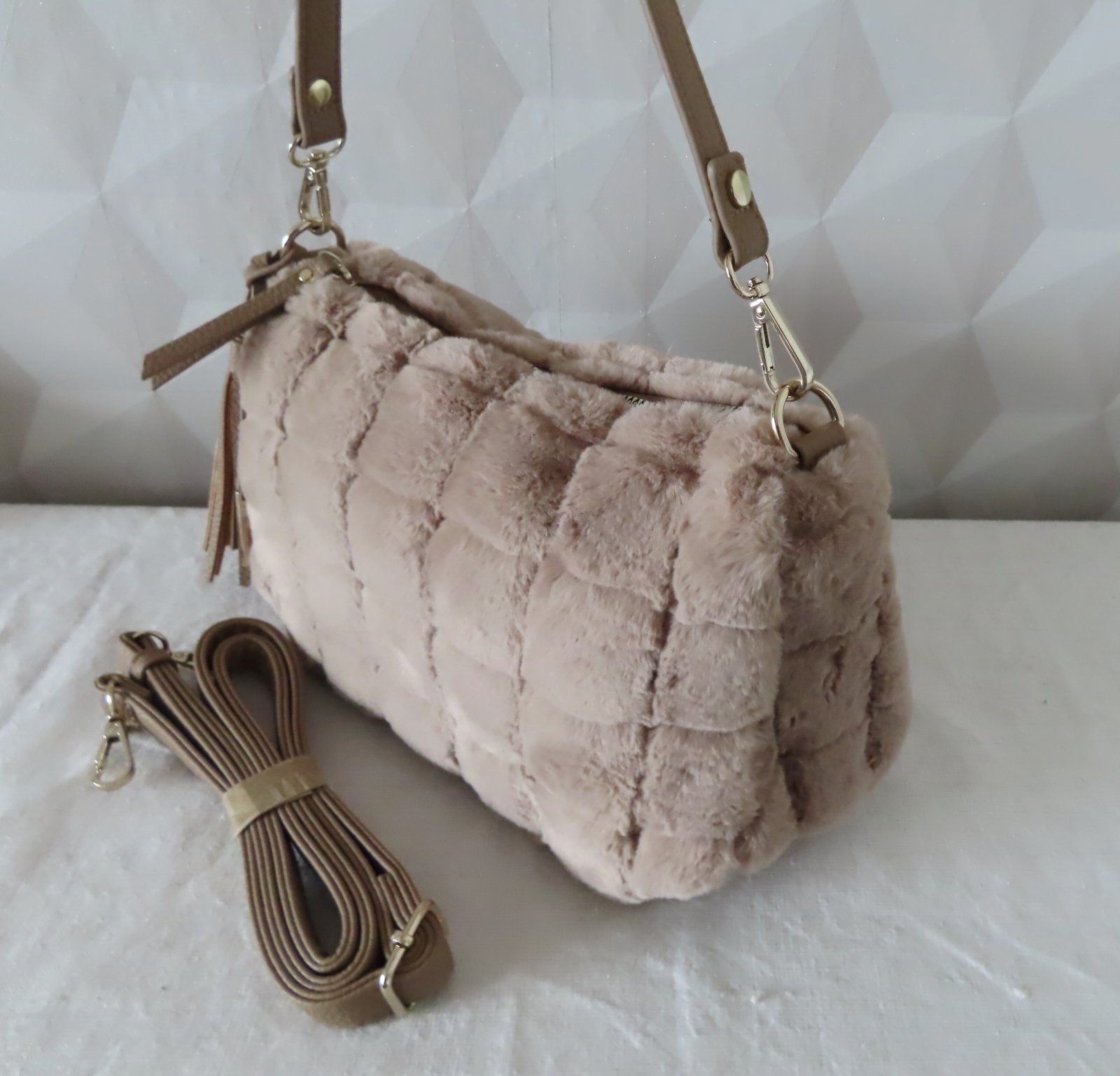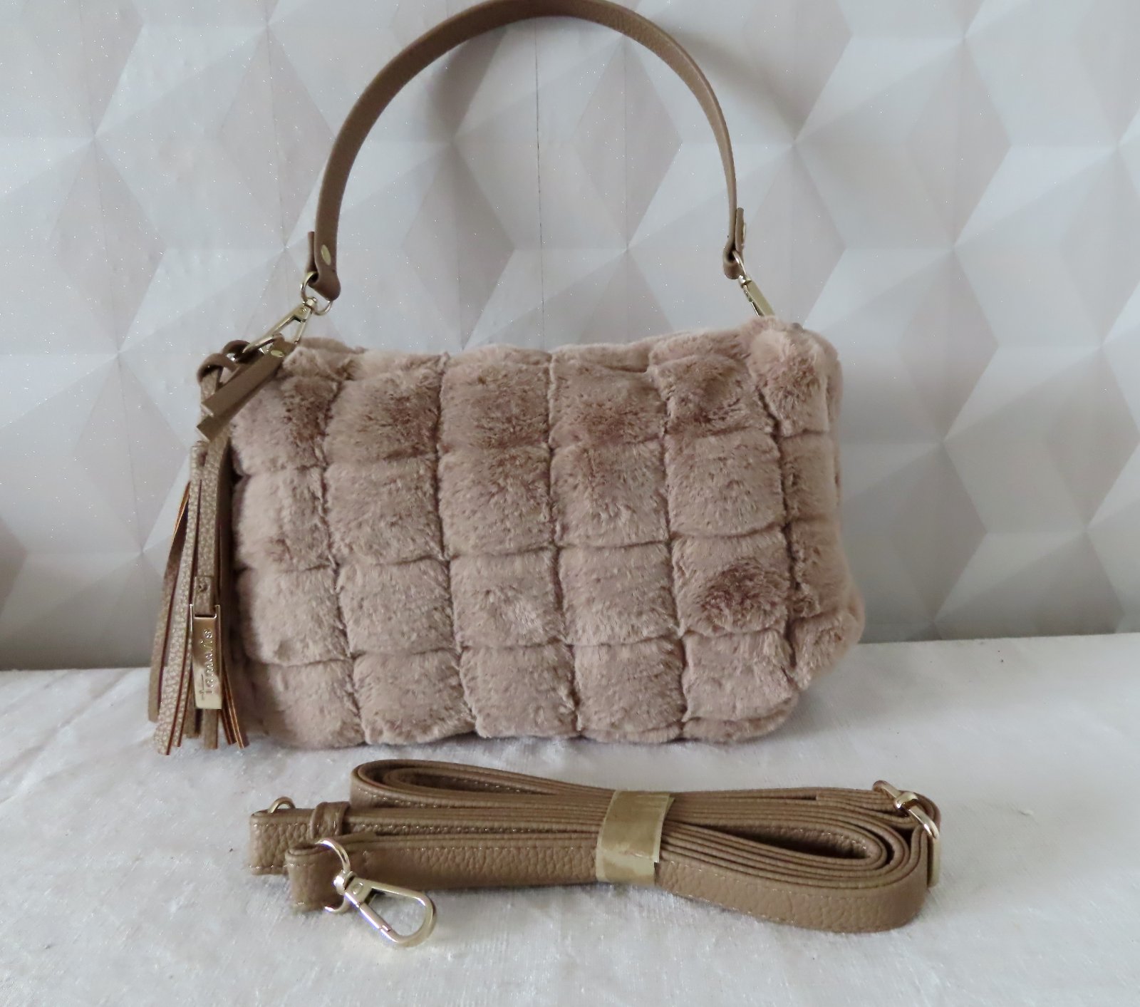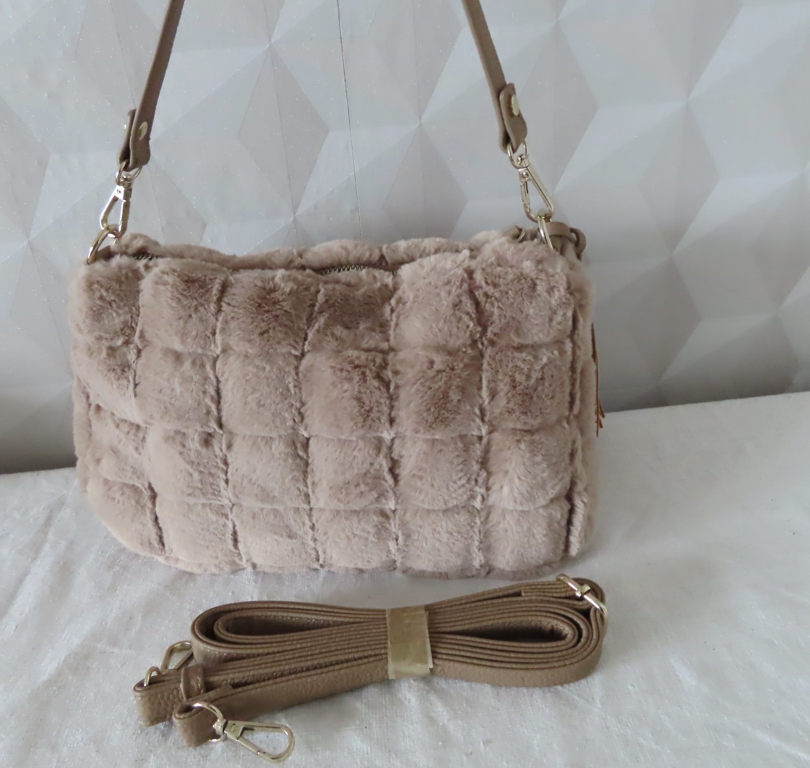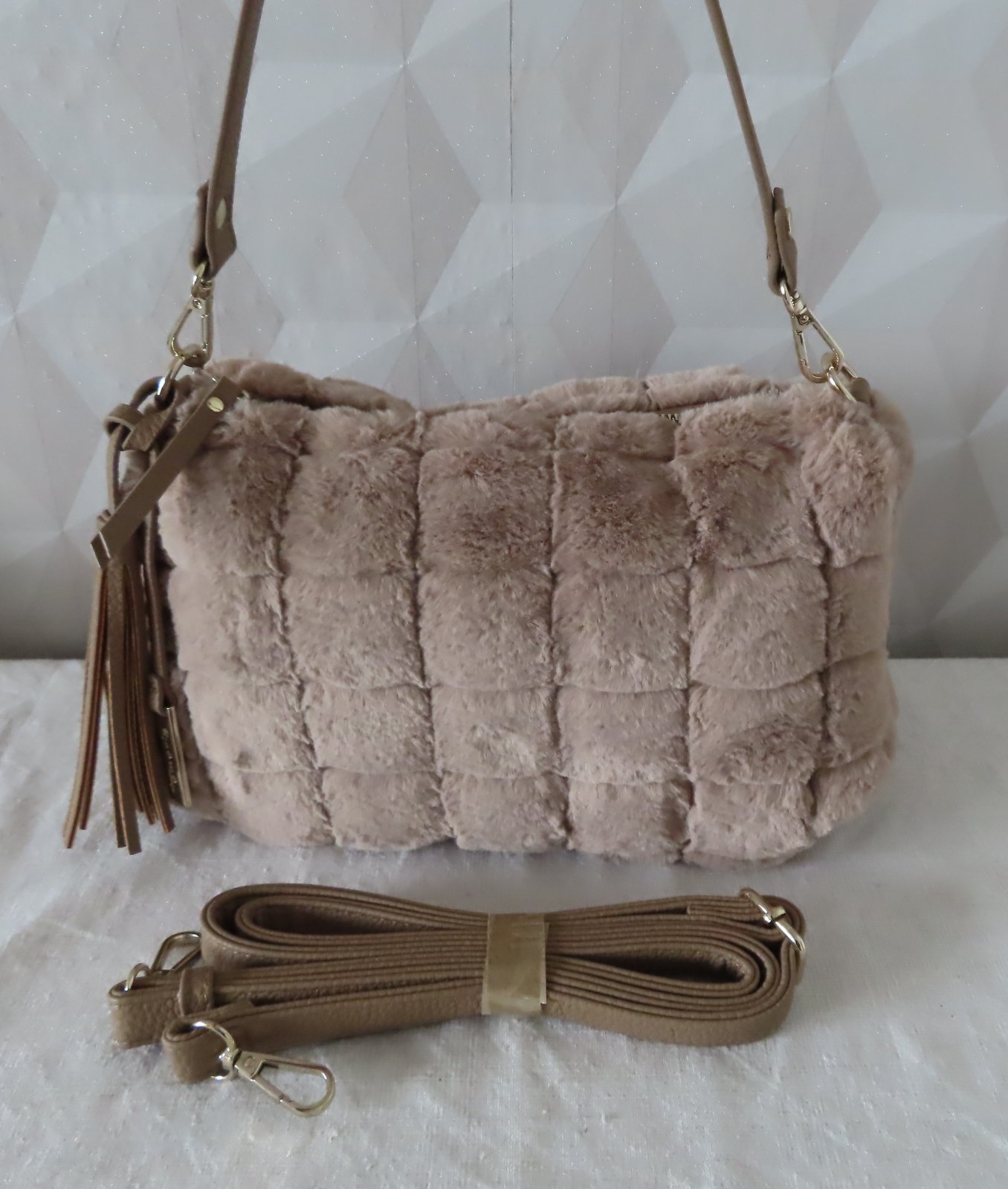 Vizuálnym zvýraznením je taška cez rameno so vzhľadom umelej kožušiny a károvaným dizajnom.