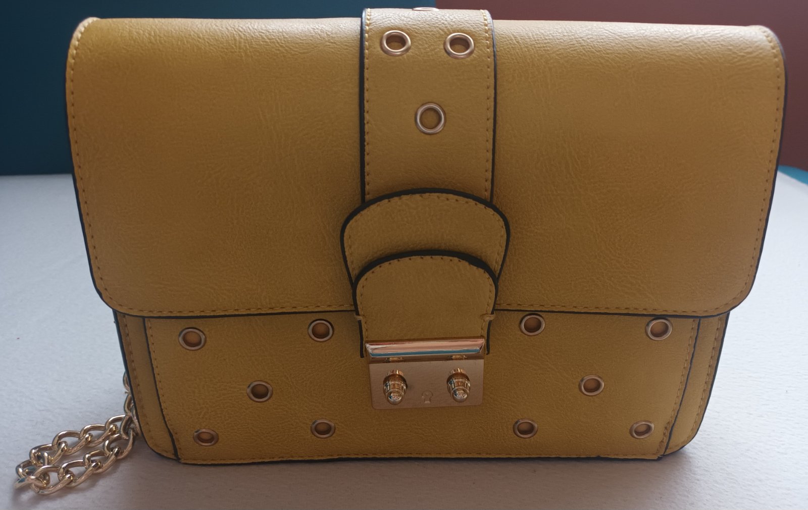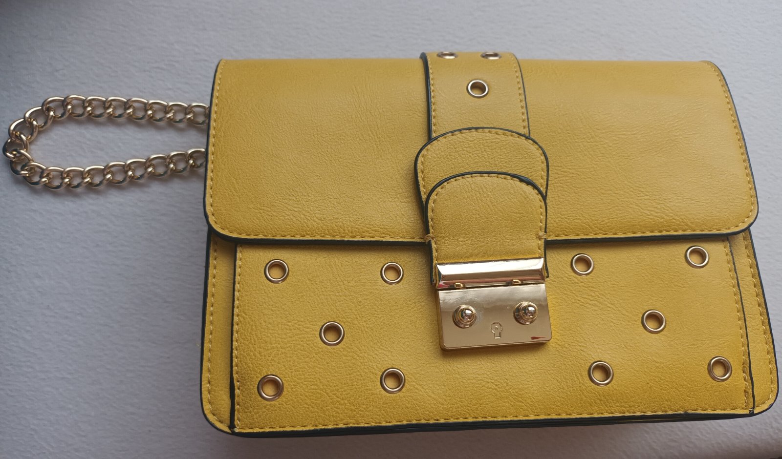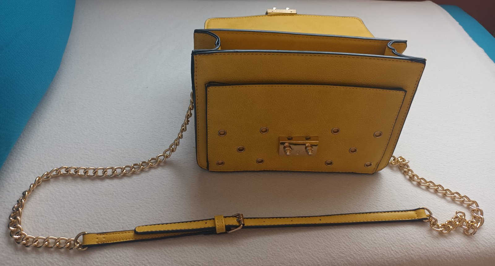 Predam peknu, neposkodenu, zltu kabelku s ciernym lemovanim a zlatymi aplikaciami. Vnutri je vrecko na zips a jedno otvorene vrecko. Rozmer: 24 x 18 x 8 cm.