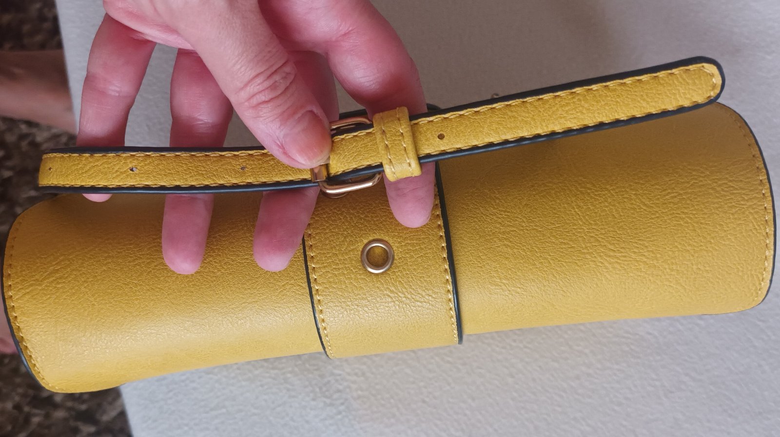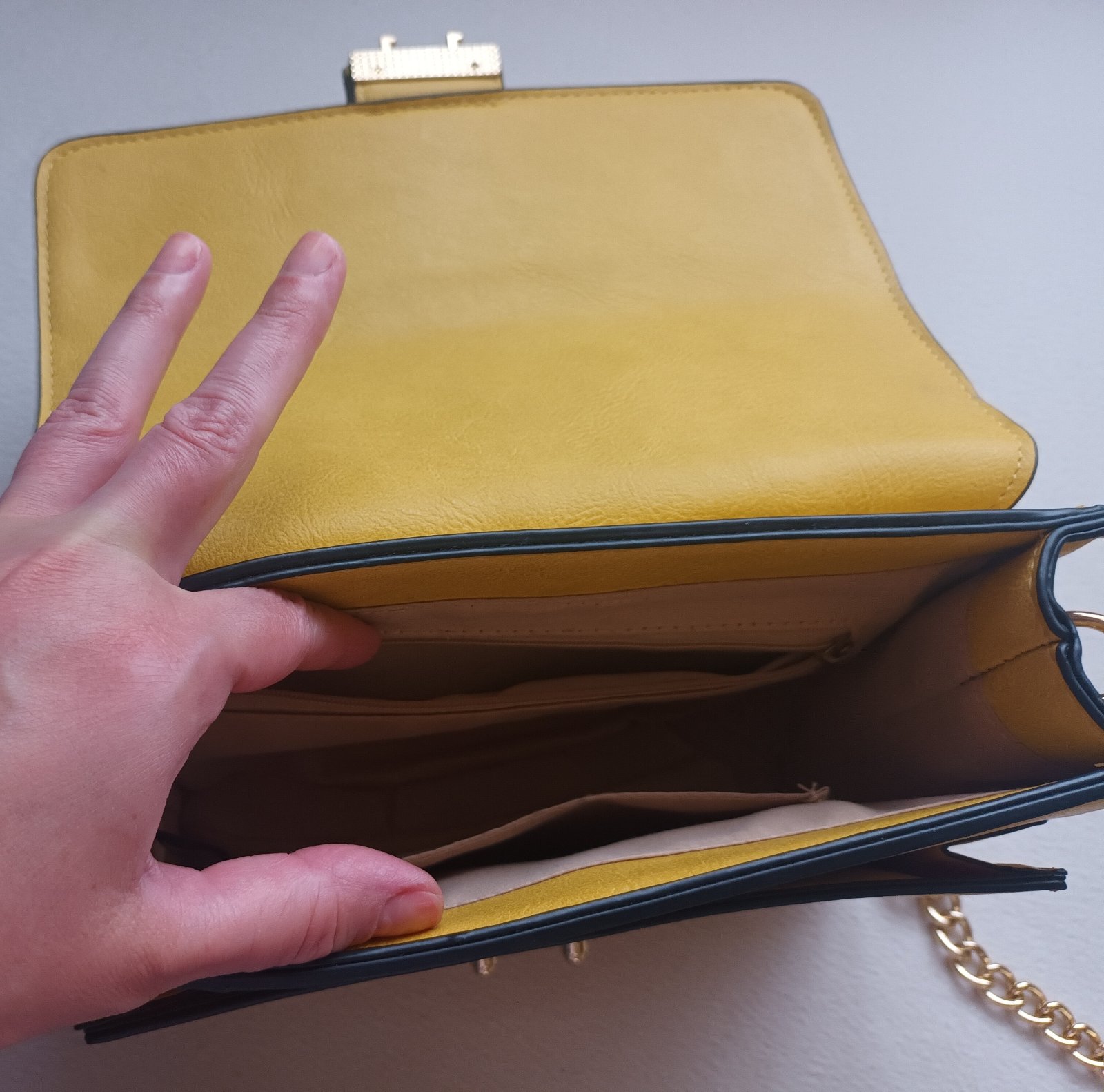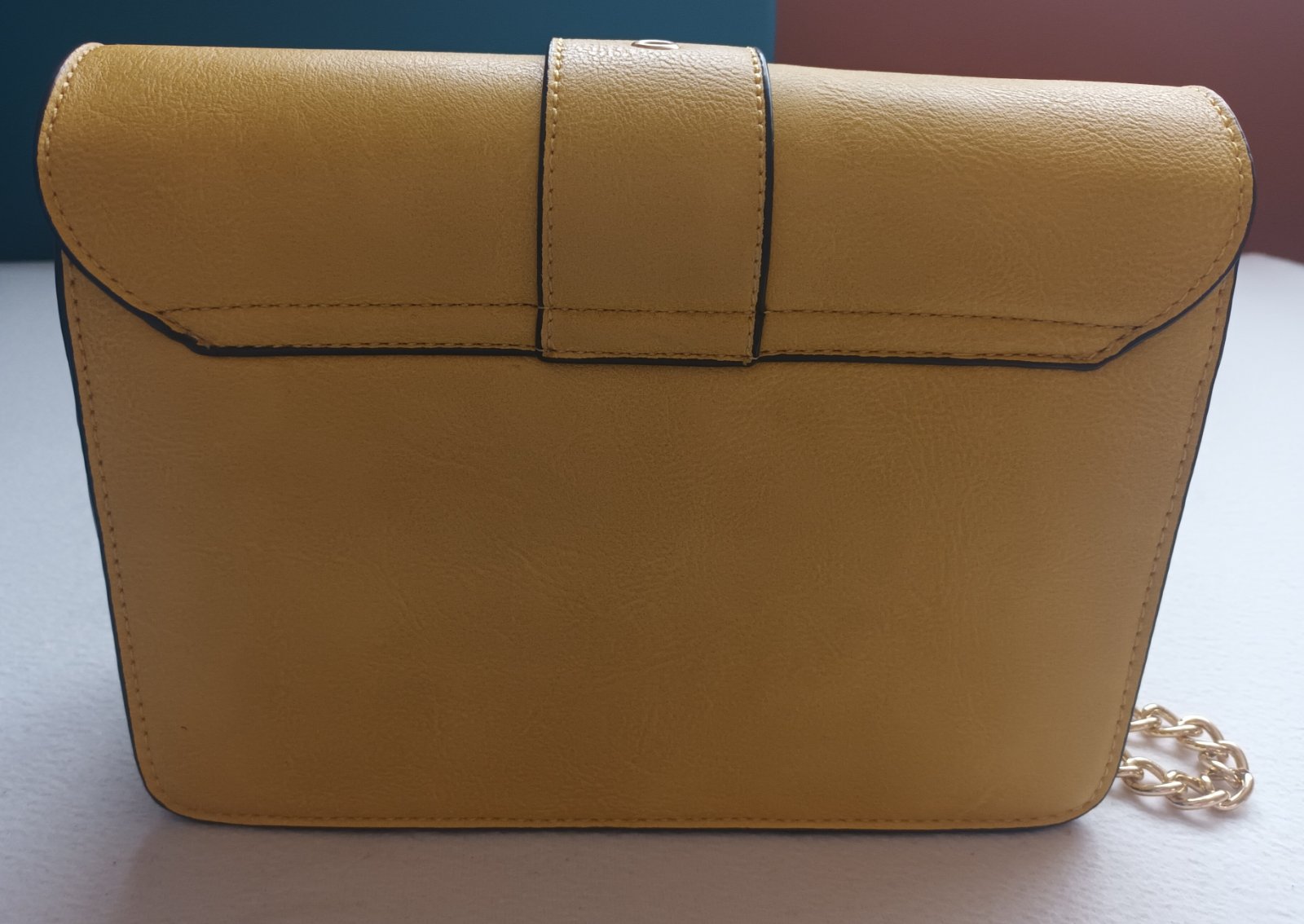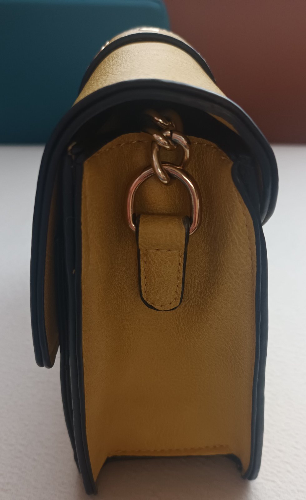 Predam peknu, neposkodenu, zltu kabelku s ciernym lemovanim a zlatymi aplikaciami. Vnutri je vrecko na zips a jedno otvorene vrecko. Rozmer: 24 x 18 x 8 cm.