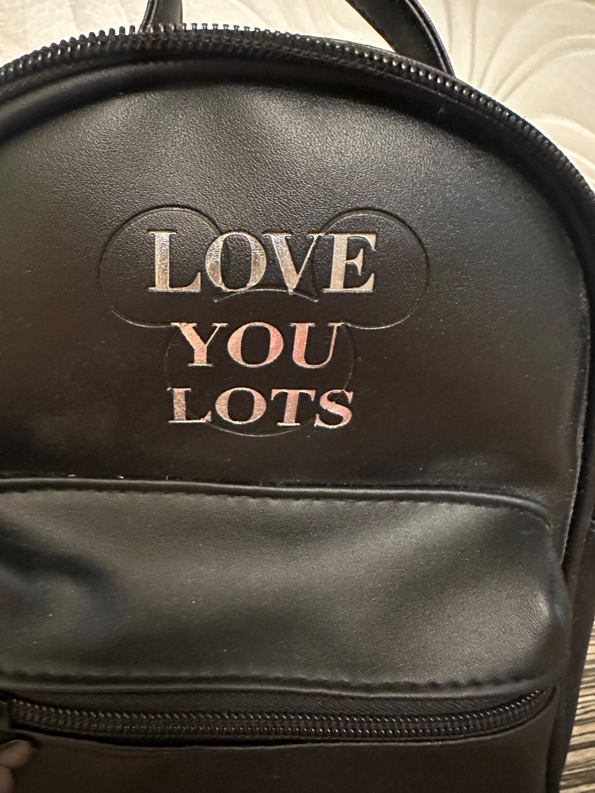 Model je v elegantnej čiernej farbe s nápisom „LOVE YOU LOTS“ na prednej strane v tvare Mickey siluety. Pôsobí minimalisticky, ale zároveň hravo – ideálny doplnok na bežné nosenie, výlety, festivaly alebo do mesta.