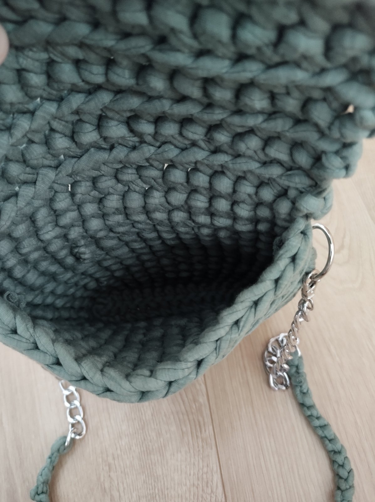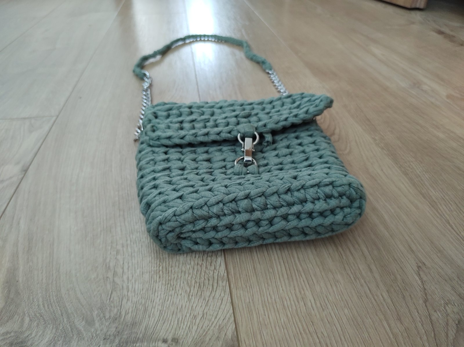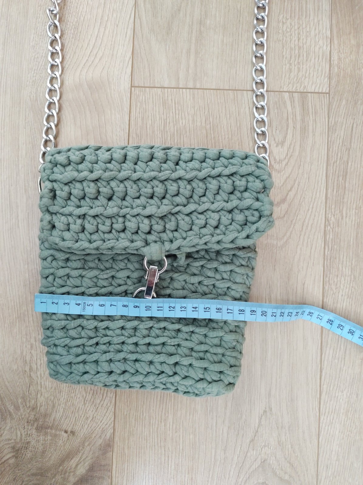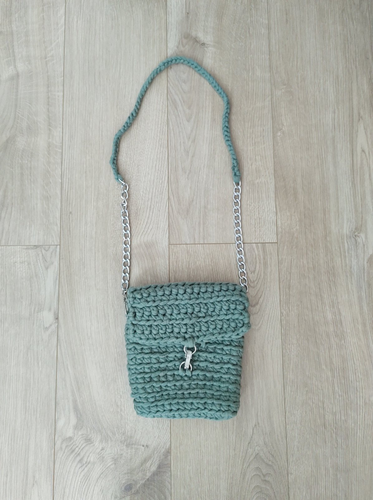 Malá háčkovaná kabelka, ručná práca, bez poškodení, v top stave, asi 2 x použitá. Rozmery na foto, kabelka akurát na mobil, peňaženku, kľúče. Dĺžka remienka je cca 102 cm. Remienok je odnímateľný.