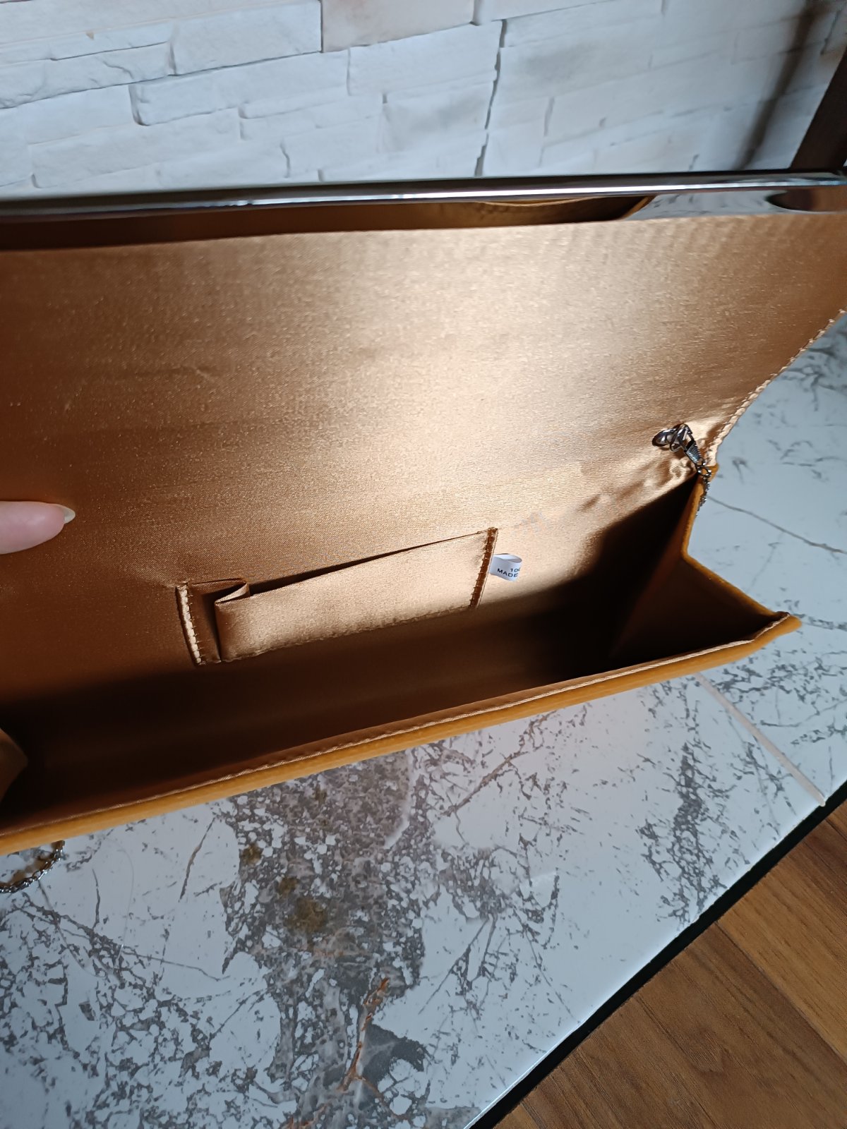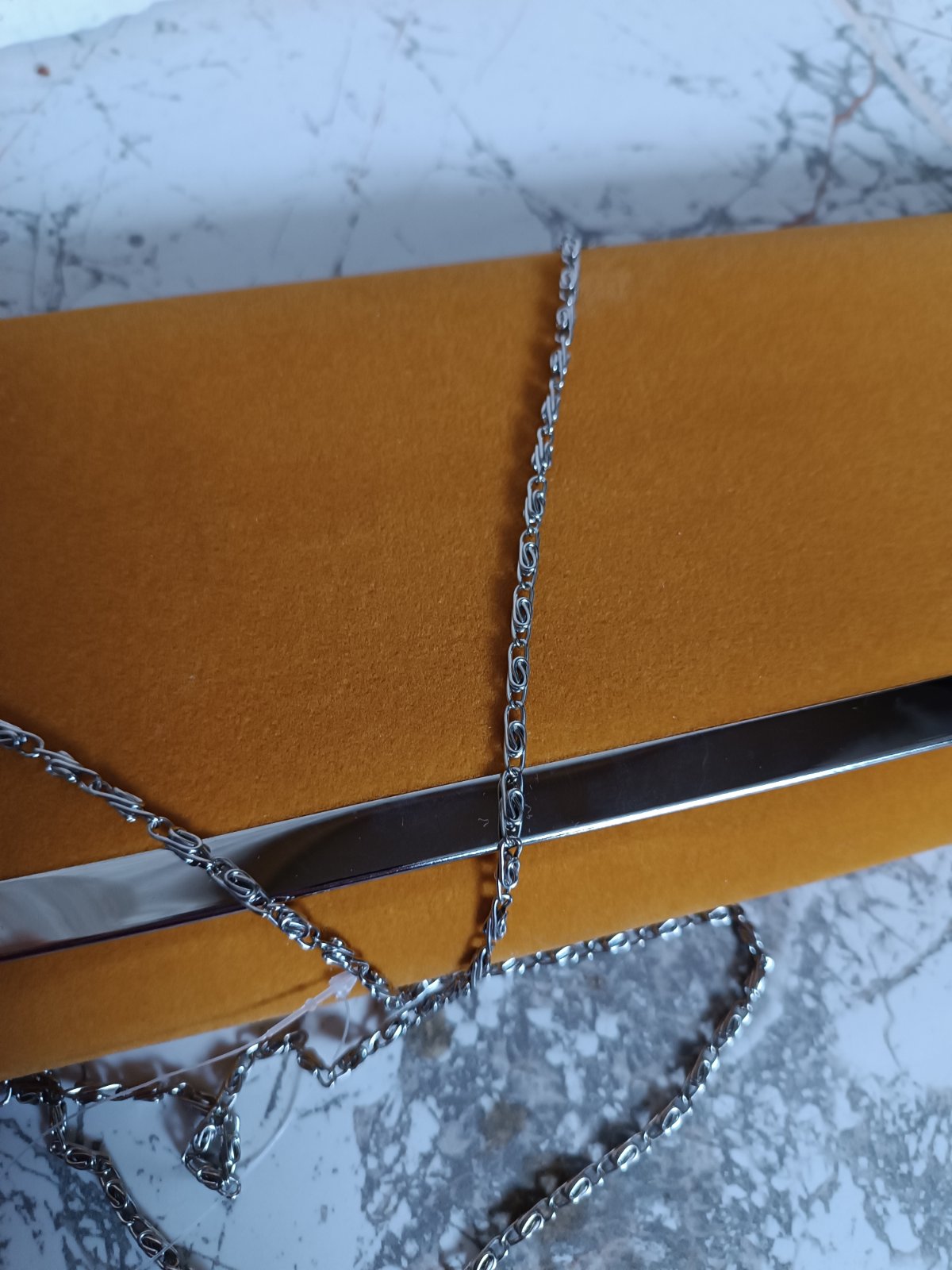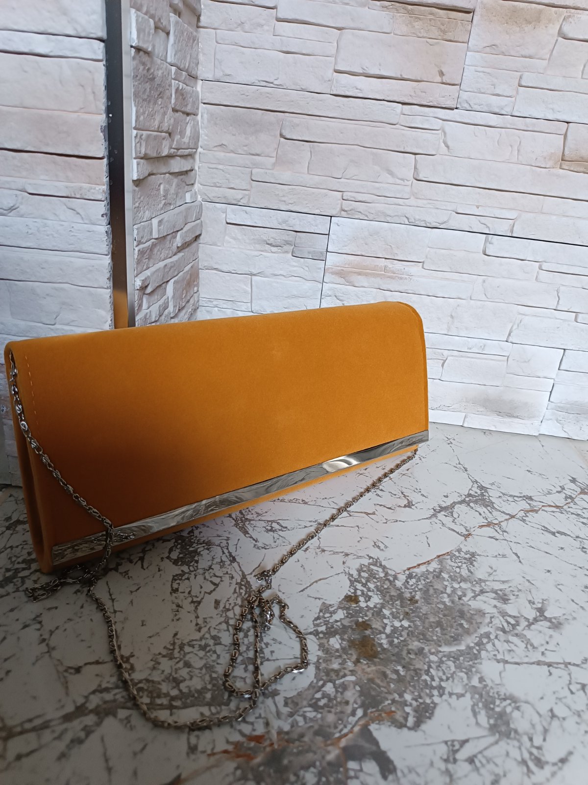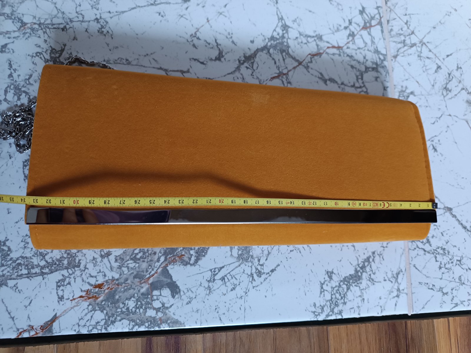 Bez poškodenia, použitá len raz. Materiál je ako semiš alebo taká kabatovina. Rozmeru sú na foto. Kovové časti sú striebornej farby.