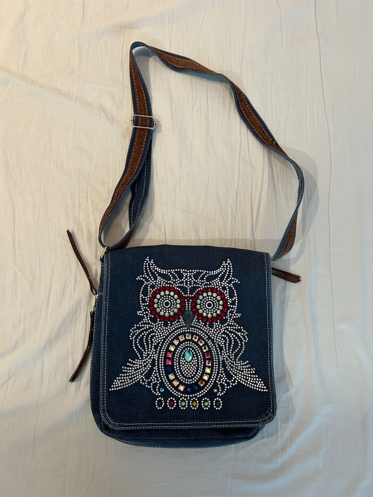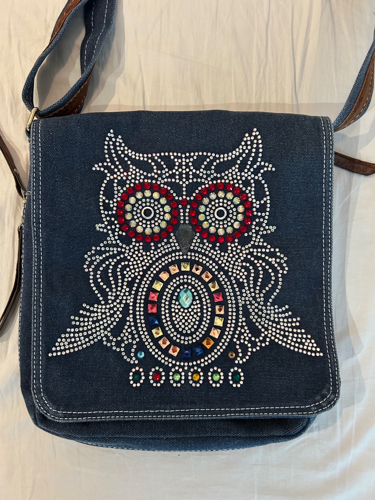 Predám používanú tašku na plece, magnetické zapínanie je potrebné opraviť + odpadol kamienok na zobáku sovy