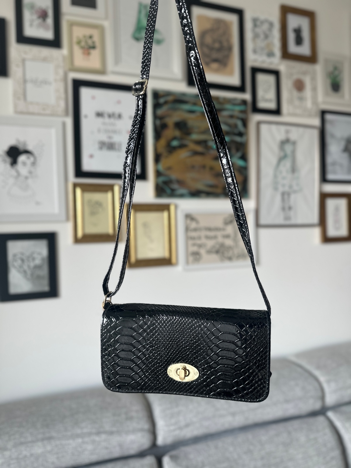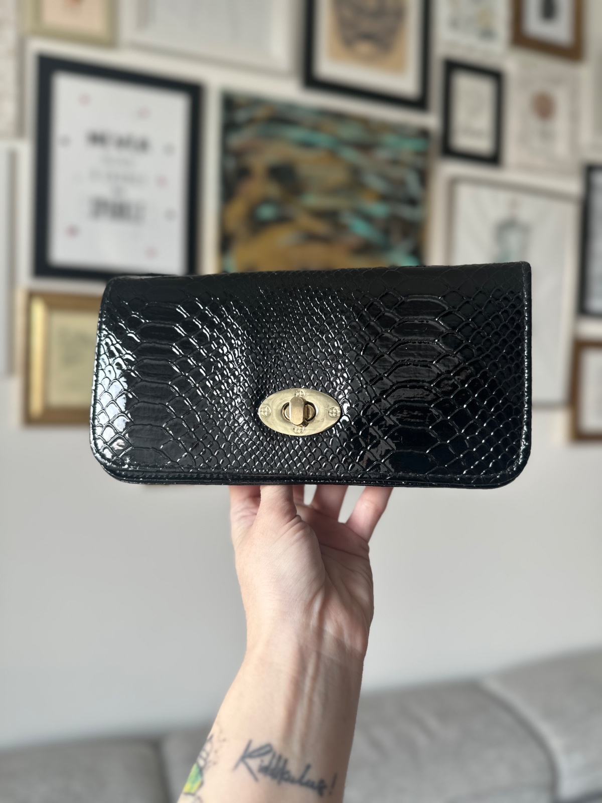 Čierna elegantná kabelka s efektom hadej kože, v lesklom prevedení so zlatými detailmi a nastaviteľným ramienkom. Vhodná na spoločenskú udalosť, či party. Bola použitá len raz. Rozmery: 20x10,5x5cm
