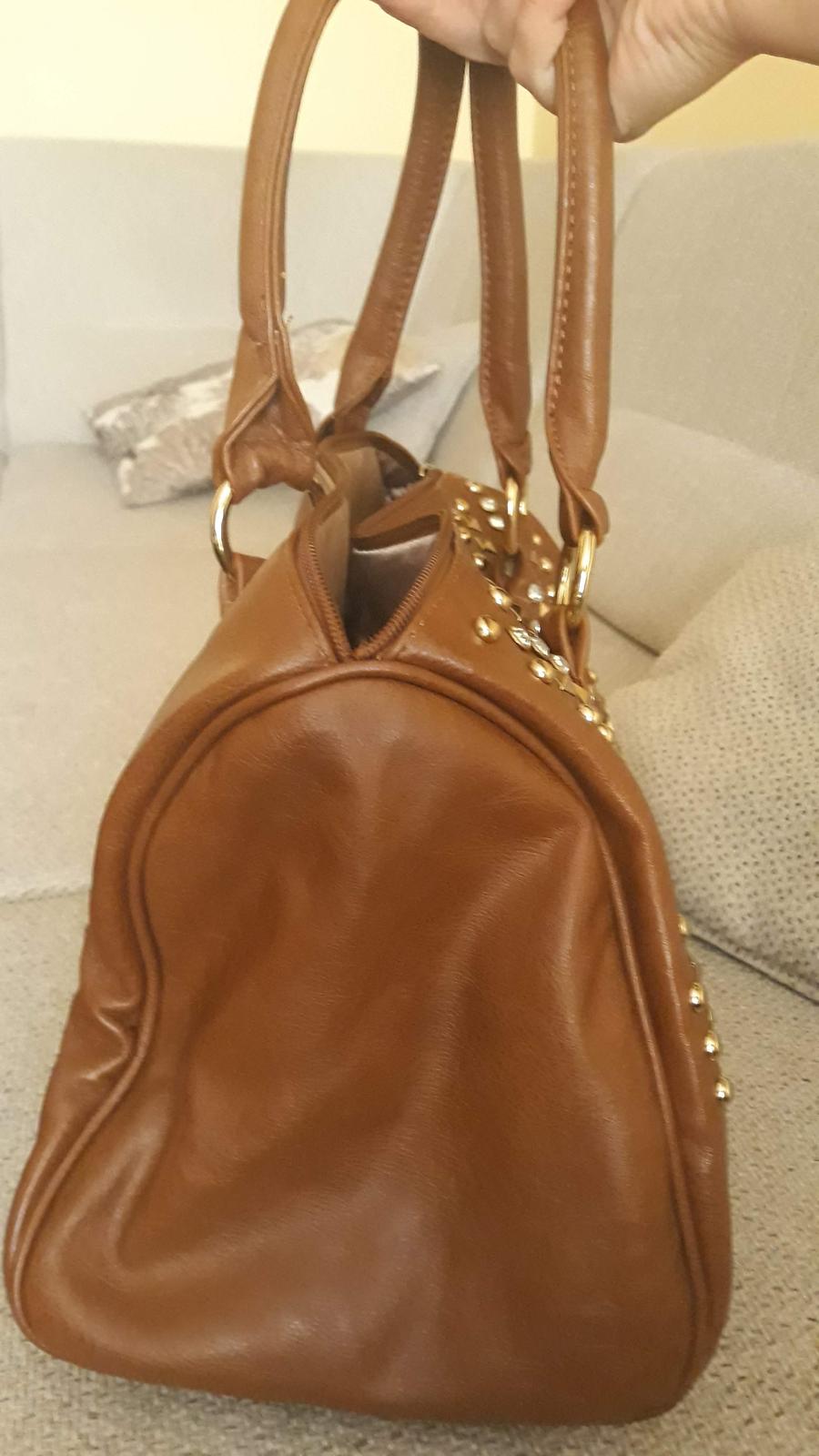 Krásna vybíjaná koženková kabelka v ťavej hnedej farbe. Dá sa nosiť v ruke alebo cez plece, keďže jej súčasťou je dĺžkovo prispôsobiteľné remienko. Rozmery: šírka - 33 cm, dĺžka - 29 cm. Vnútro je podšité podšívku v cappuccino farbe + 1 priehradka zo zipsom a 2 malé priehradky bez zipsu. Zo zadu je takisto priehradka na zips.