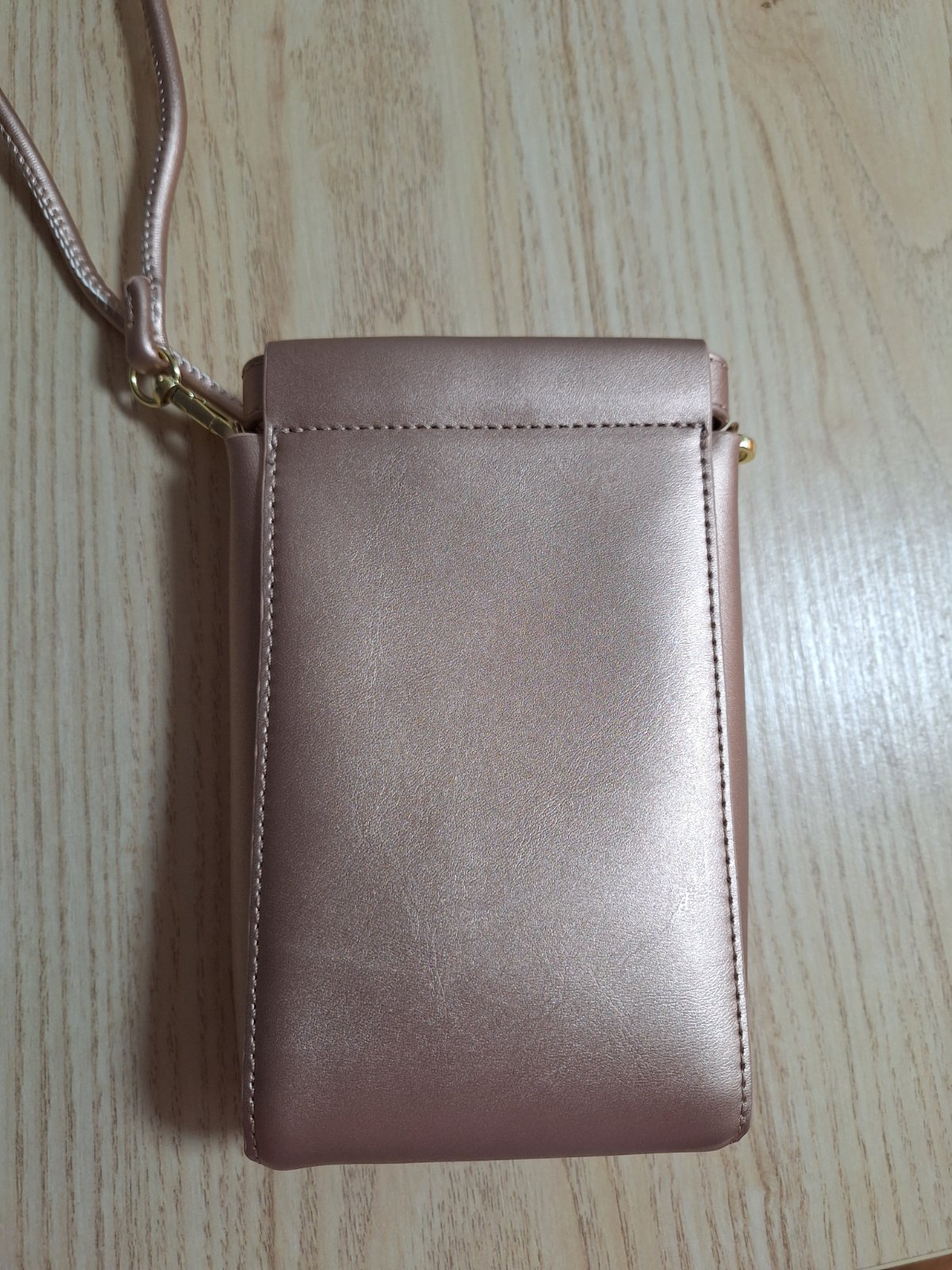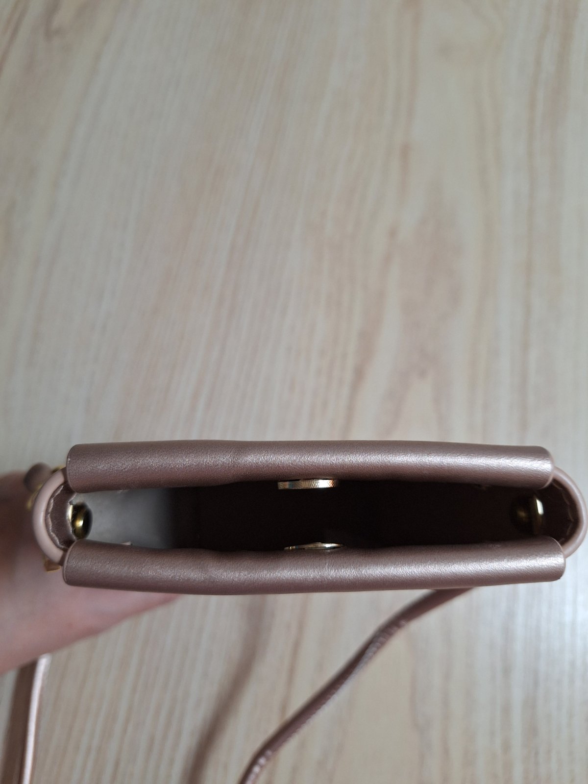 Kabelka cez rameno alebo crossbody, v zlato ružovej farbe. Má jednu hlavnú priehradku, do ktorej sa zmestí mobil, zapínanie je na magnet. Popruh cez rameno nie je nastaviteľný.