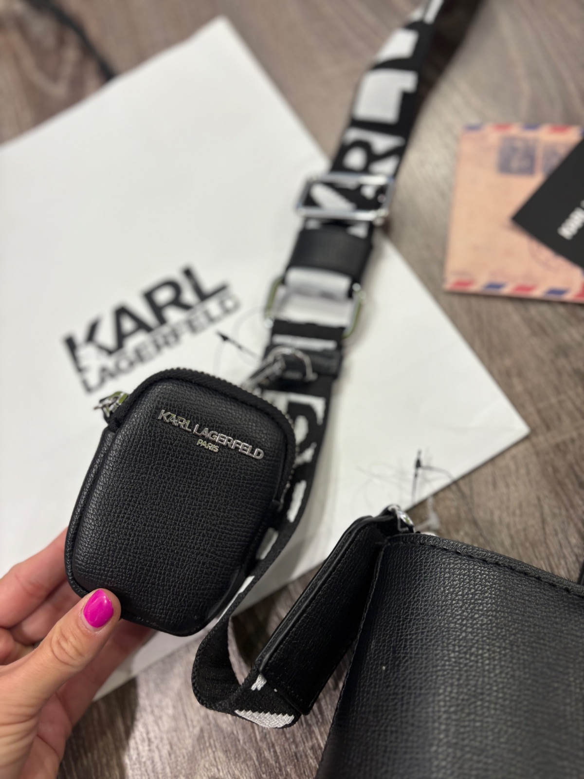 Karl Lagerfeld nova crossbody kabelka,putko sa da odopnut a nosit sa da aj v ruke,na remienku je pripojena mala kapsička na drobnosti napr.kluce