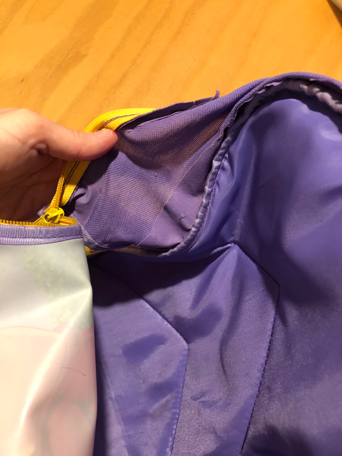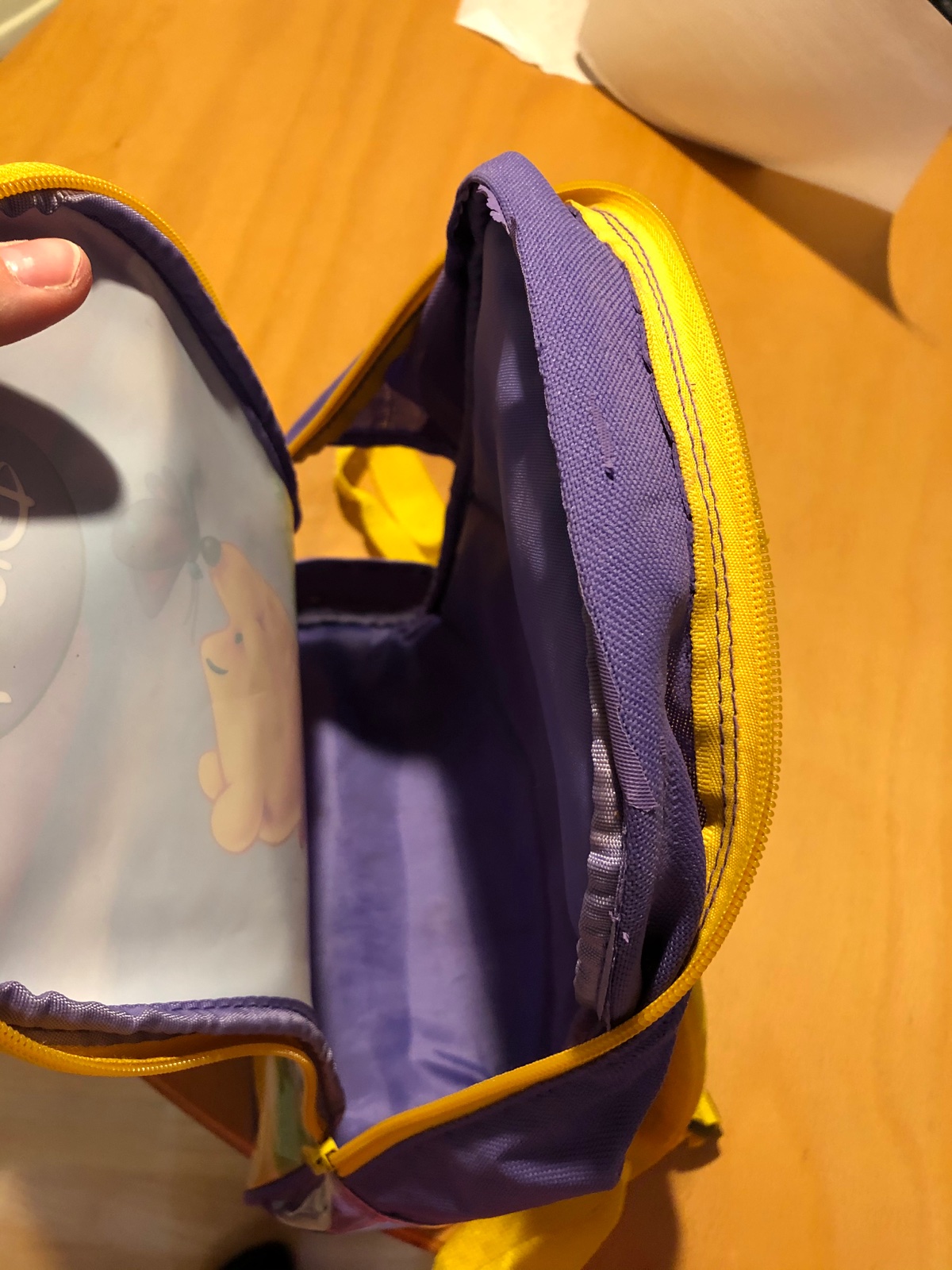 Ruksačik s Mackom Pooh a k nemu aj vrecuško na papučky:-) Je menší, tak vhodný do školky. Vnutri pogumovana cast je olupana😢. Ruksak je funkcny