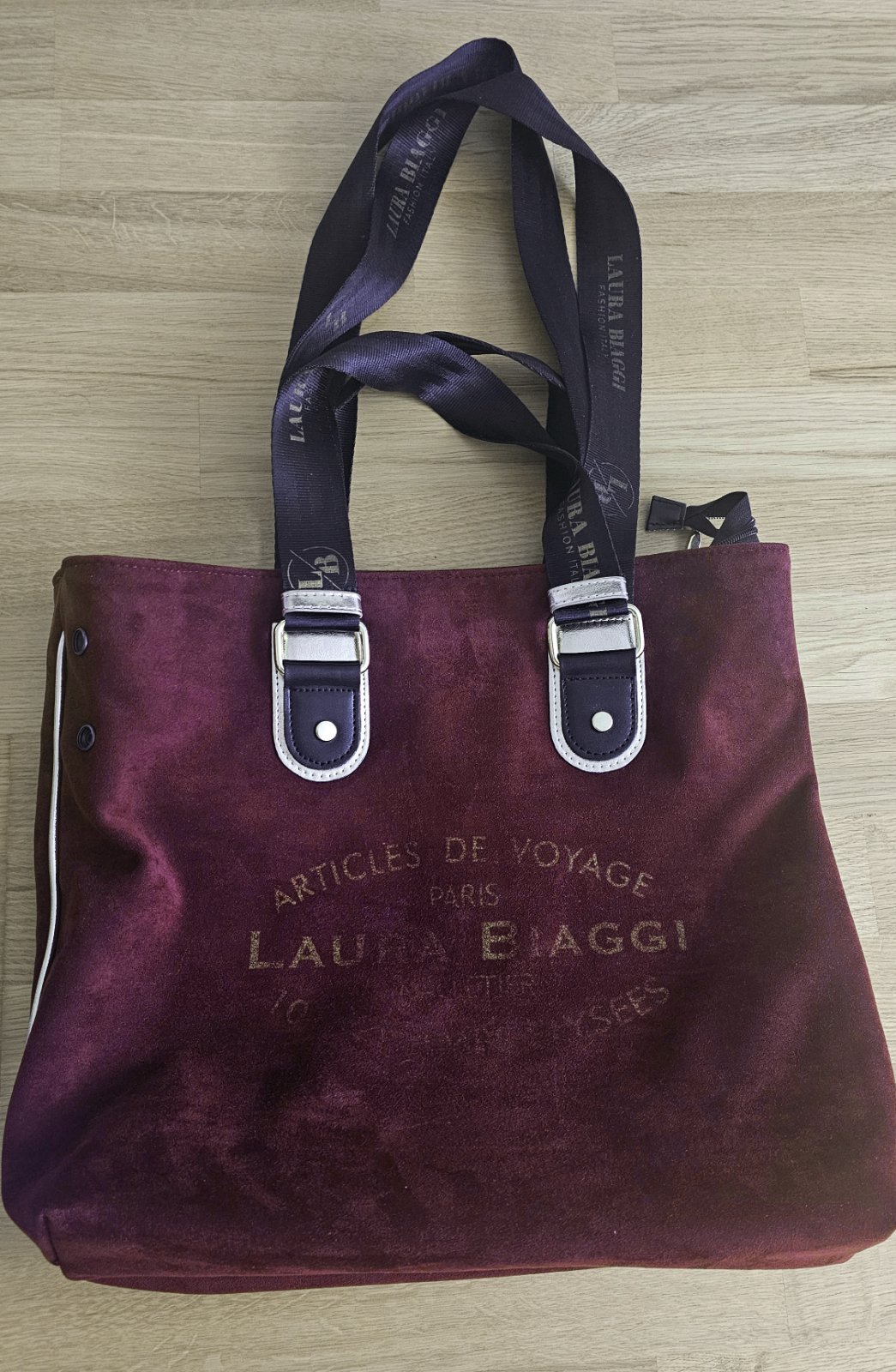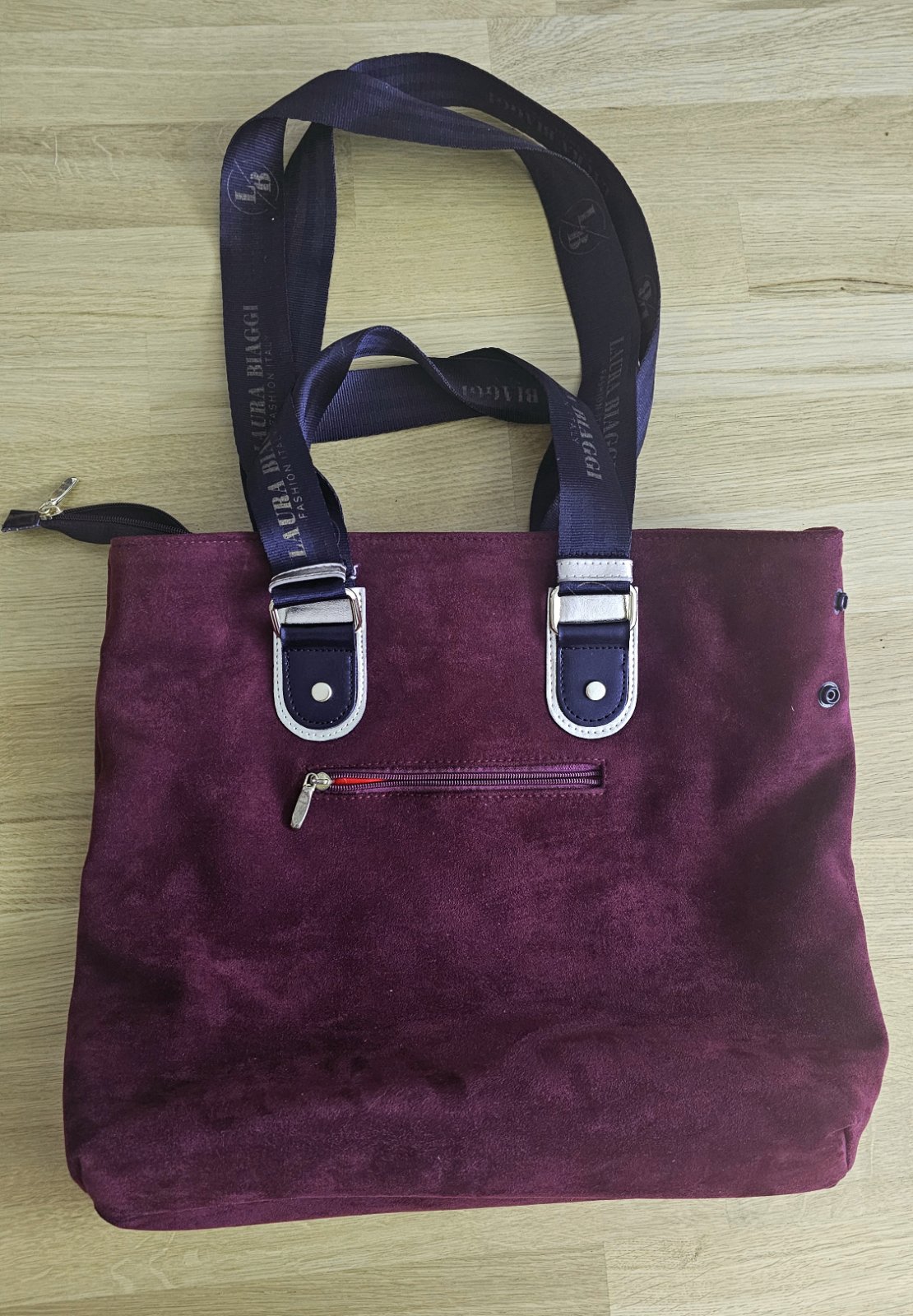 Výborný stav. Výška 35 cm, šírka 45 cm, hĺbka 13 cm. Dva veľkosti ramienok. Vnútro nepoškodené, členené na tri vrecká. Tašku je možné na šírku zmenšiť cvokmi z oboch strán. Zn. Laura Biaggi.