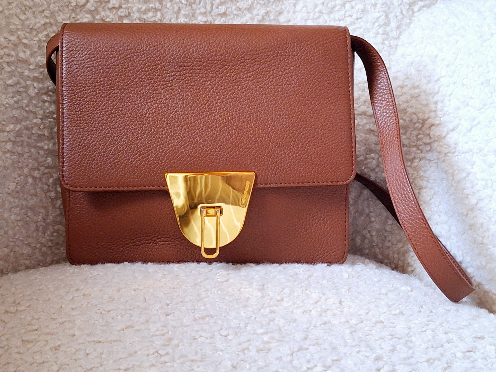 Coccinelle shoulder bag farba: hnedá so zlatým kovaním len krátke uško, dá sa nosiť na ramene materiál: koža veľkosť: šírka v strede cca 30 cm, výška 30 cm