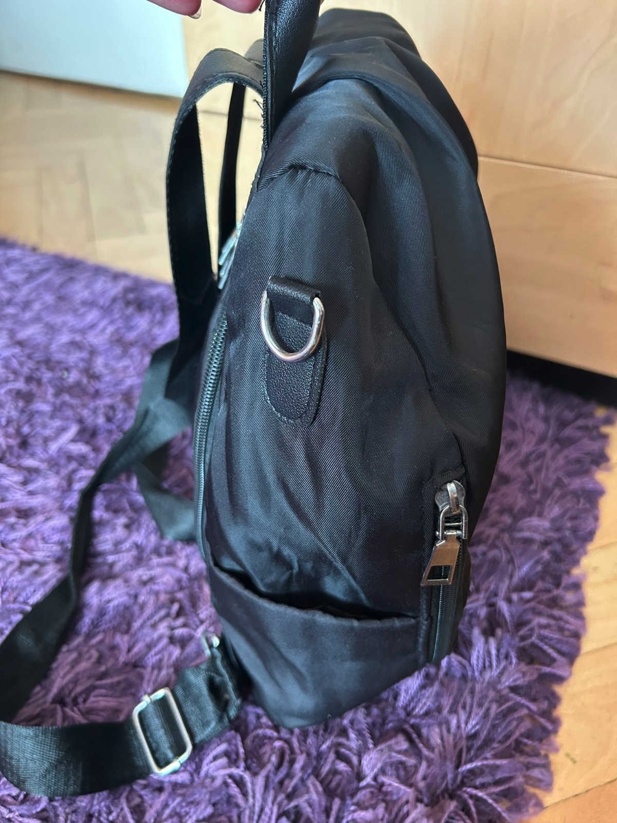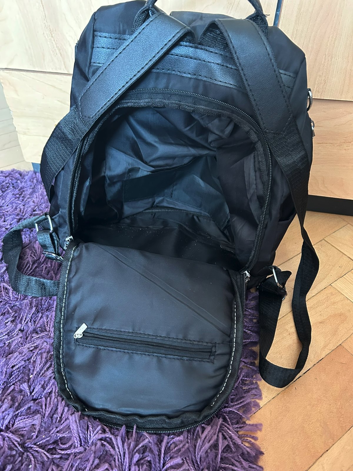 hlavný zips je od chrbta, takže sa nemusíte báť, že vám niekto niečo ukradne. Zpredu sú len 2 menšie priehradky na zips a na boku 2 malé priehradky