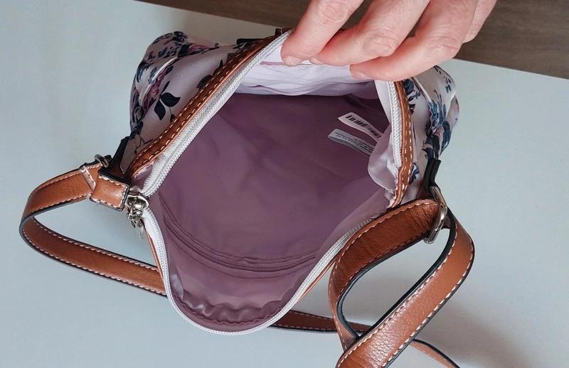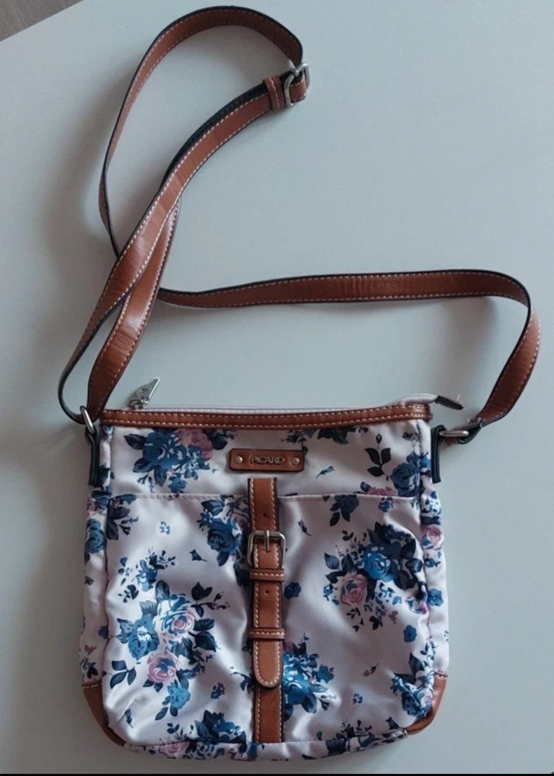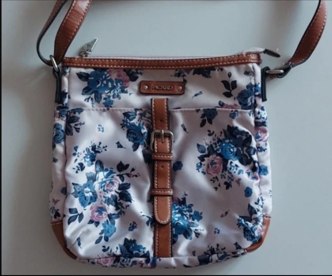 Veľmi pekná, látková s hnedým koženým remienkom, top stav. Môže sa nosiť aj ako cross body. 1 väčší vačok + 4 malé vačky. Značka Picard. 25 x 25 cm.