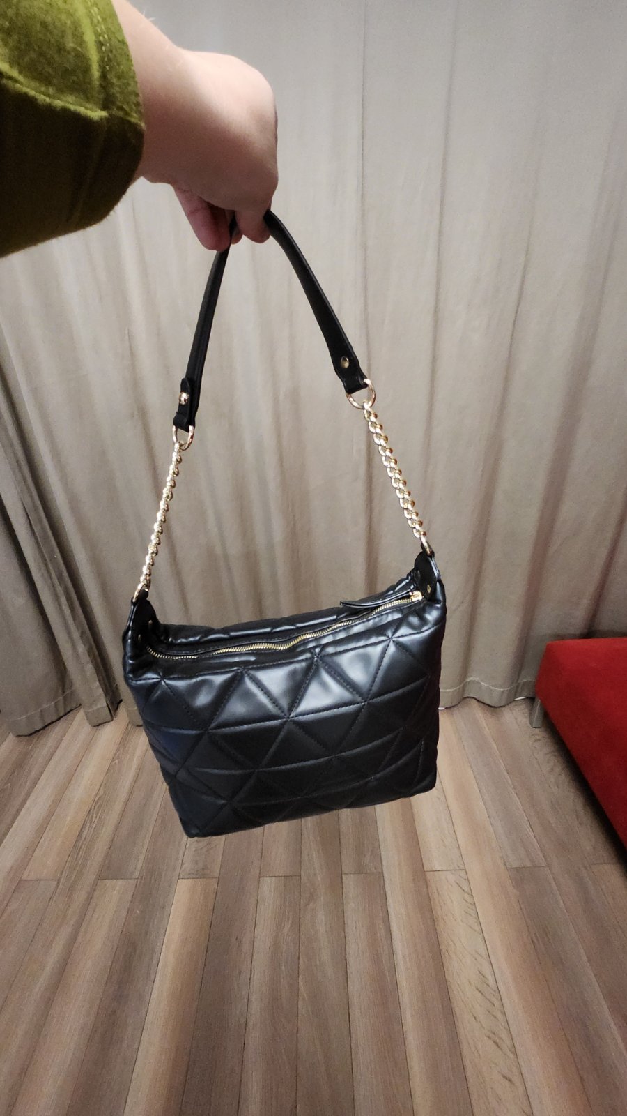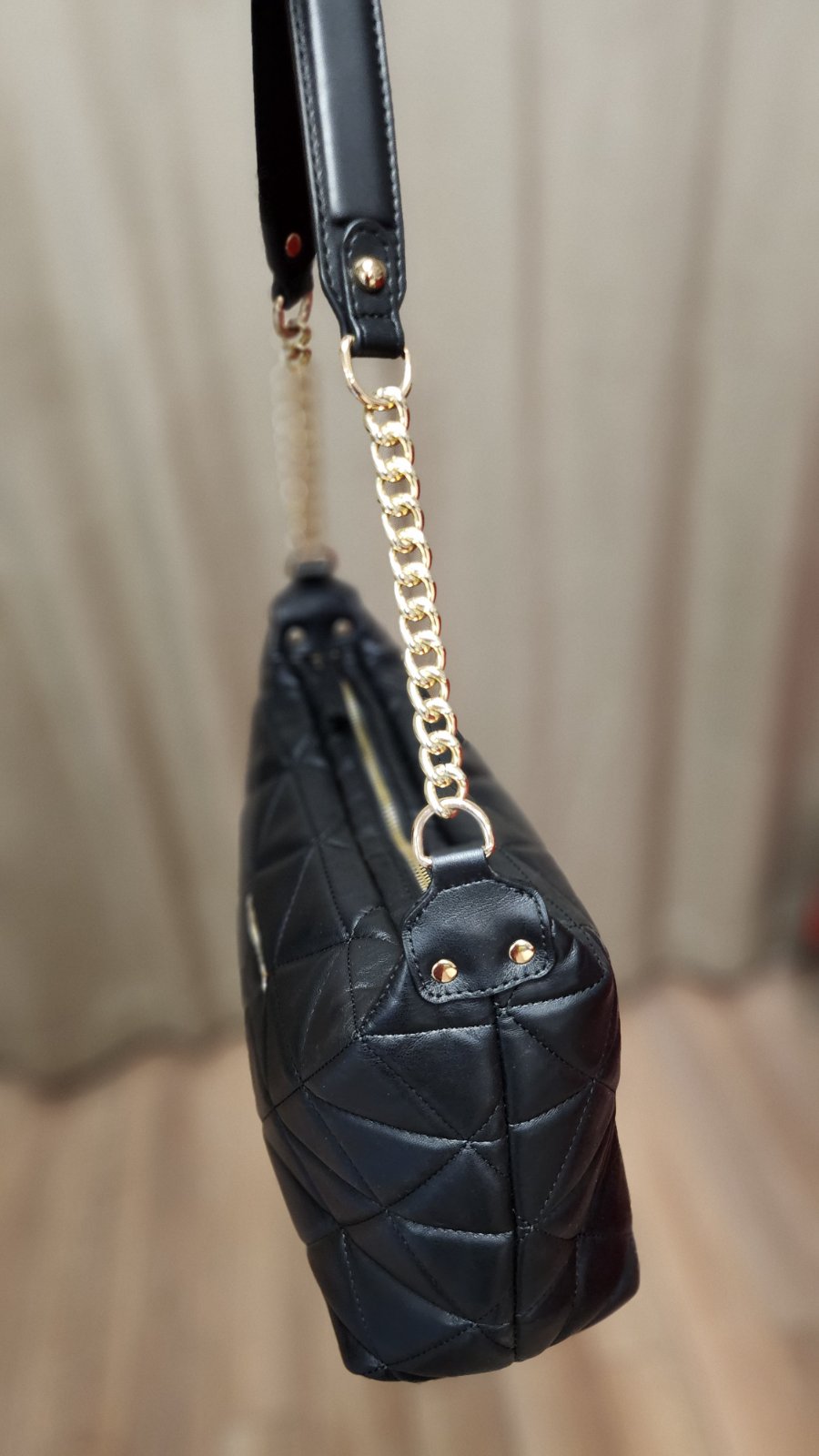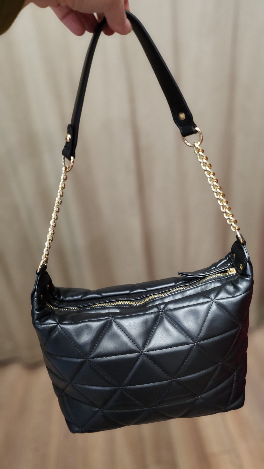 Prekrásna čierna prešívaná kabelka v strednej veľkosti. Rozmery: 36 x 25 cm. Dĺžka rúčky: 70 cm. Jednoprepážková, vnútri 3 vrecká, z toho jedno na zips.