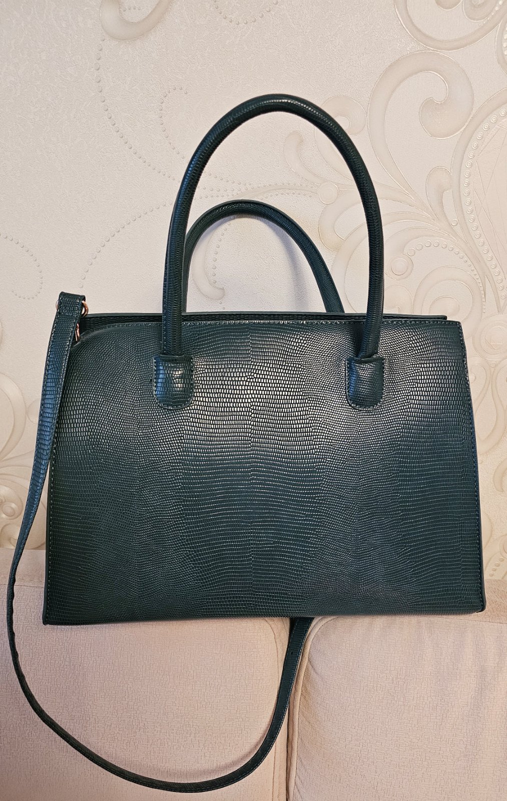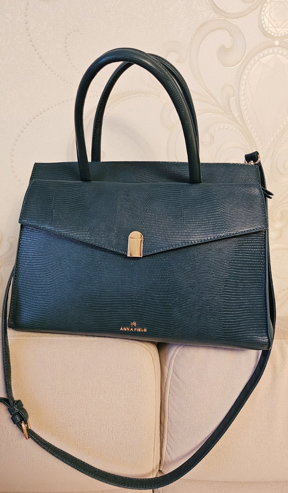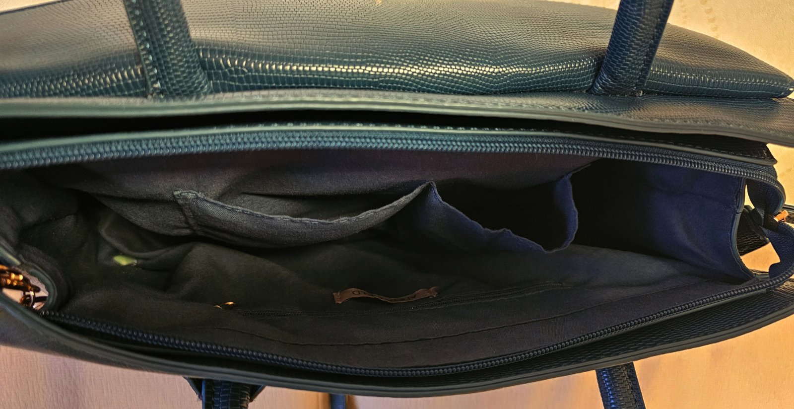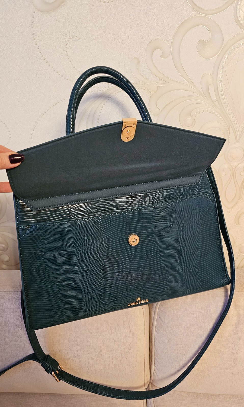 Výborný stav. Úložný priestor v prednej časti po celej dĺžke. Vnútro s dvoma bočnými otvorenými priehradkami a jedným priestorom na zips. Farba tmavo tyrkysová. Zn. Anna Field. Rozmer 37x25x13 cm.