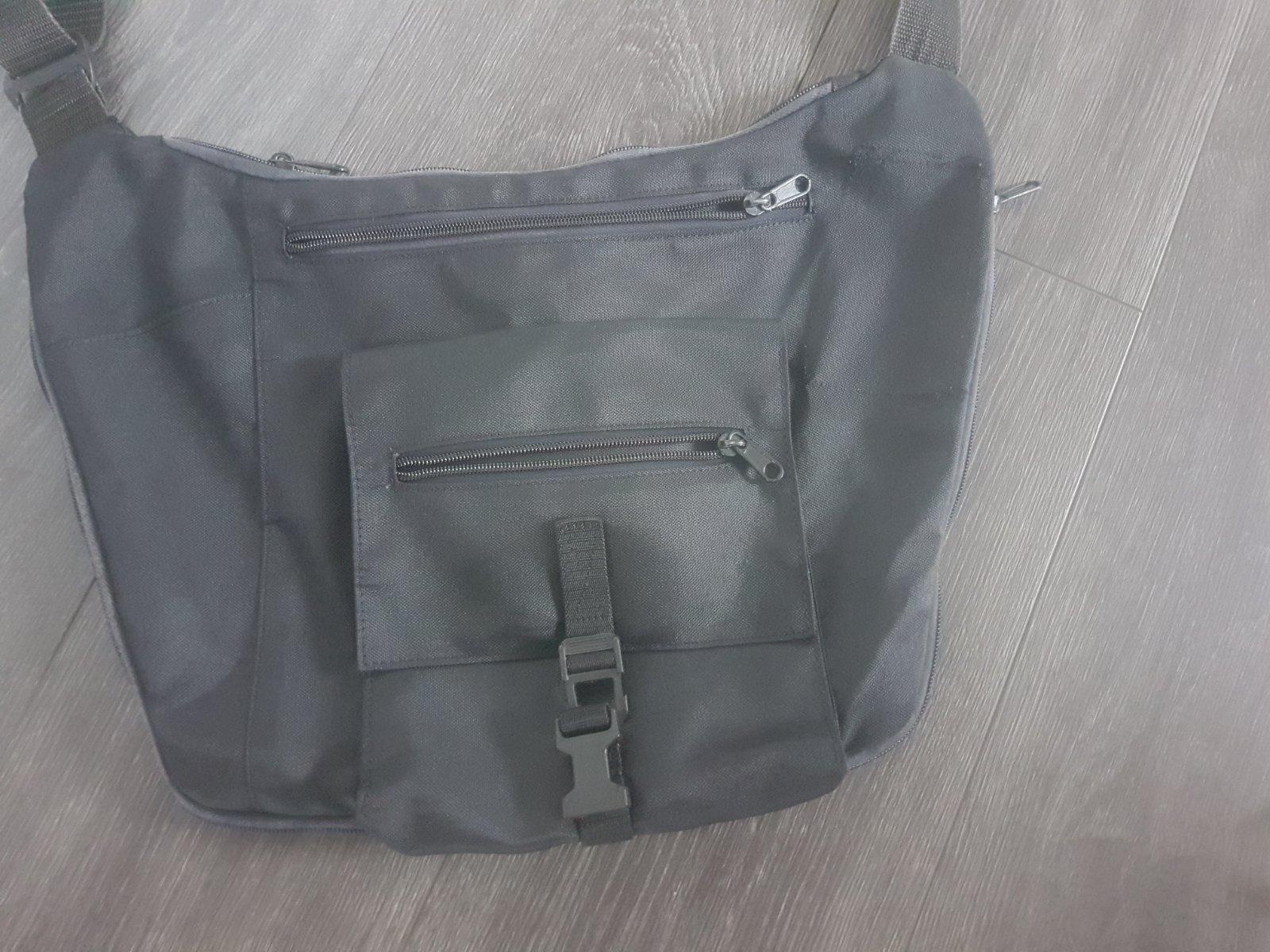 Taška cez plece s viacerými priečinkami. Spodná časť sa dá rozponúť a dá sa tak taška rozšíriť.jedno vreco je odparane vid foto