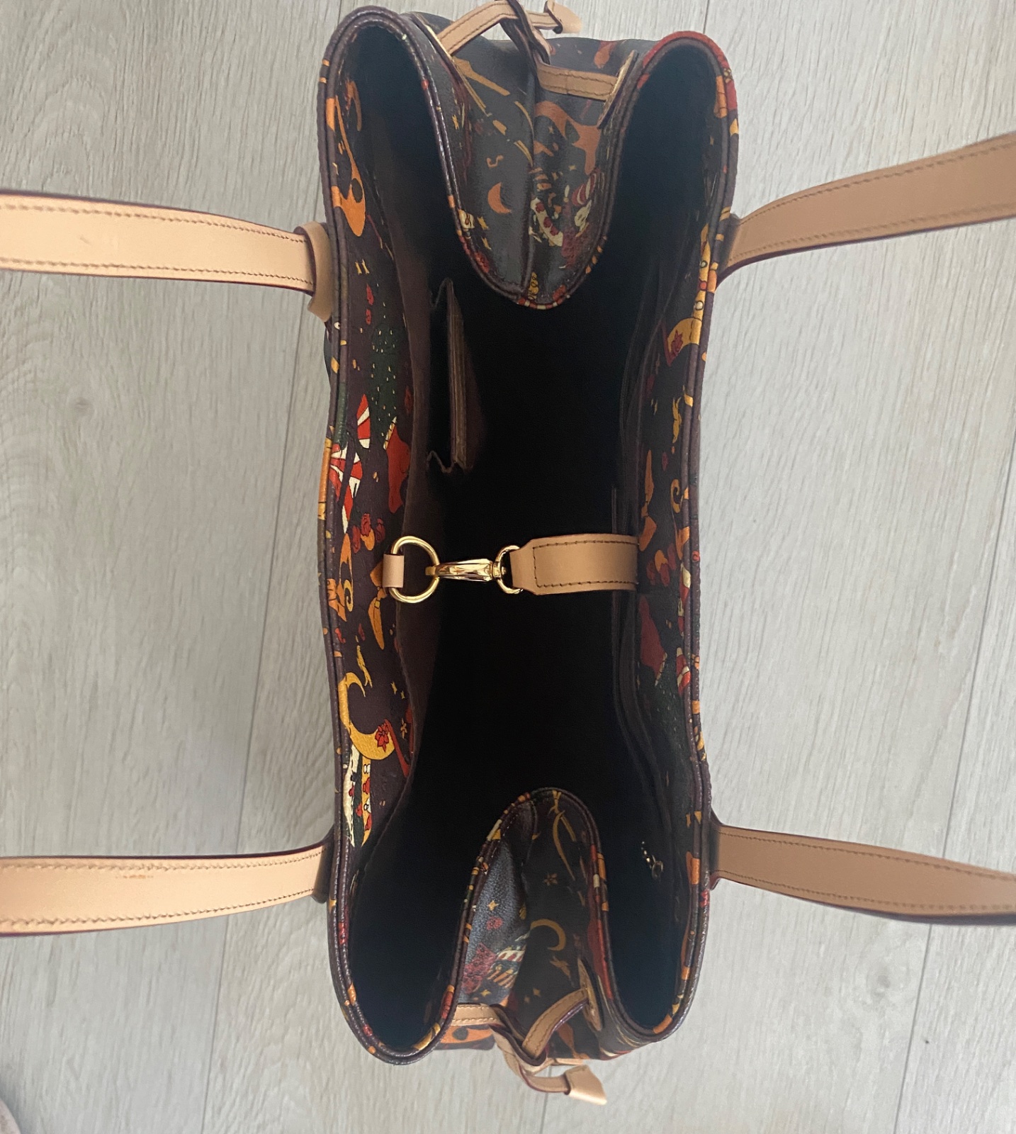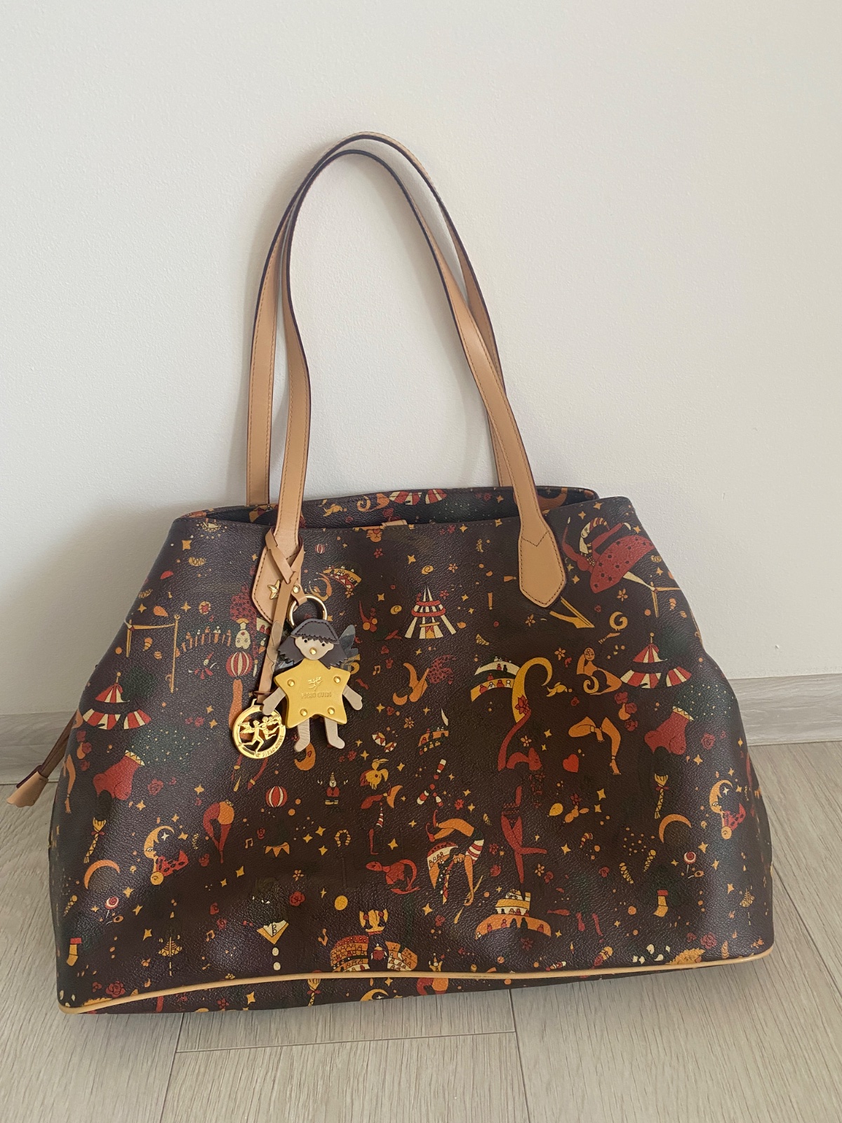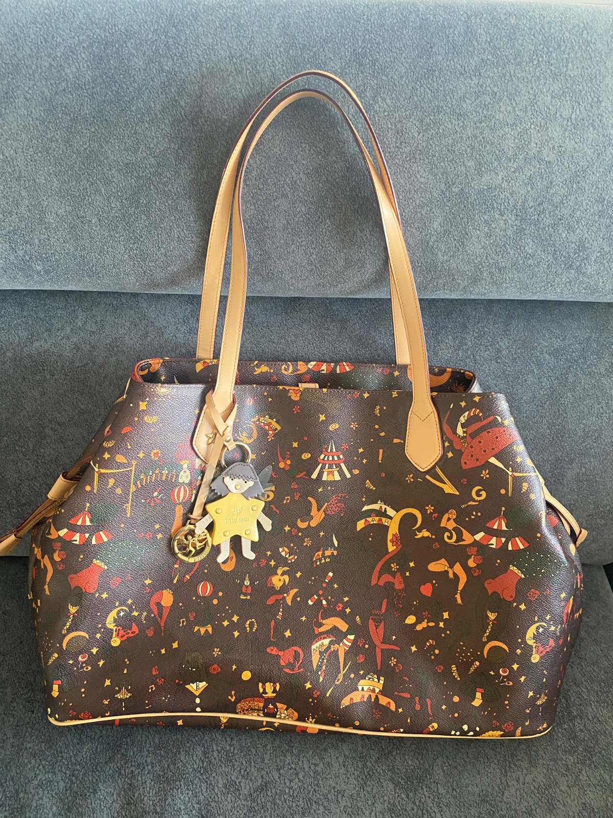 vzor: MK monogram farba: hnedá zlaté kovanie veľká priestranná rozmery: šírka dole 31cm, šírka hore 41cm, výška 29cm umelá nepravá koža